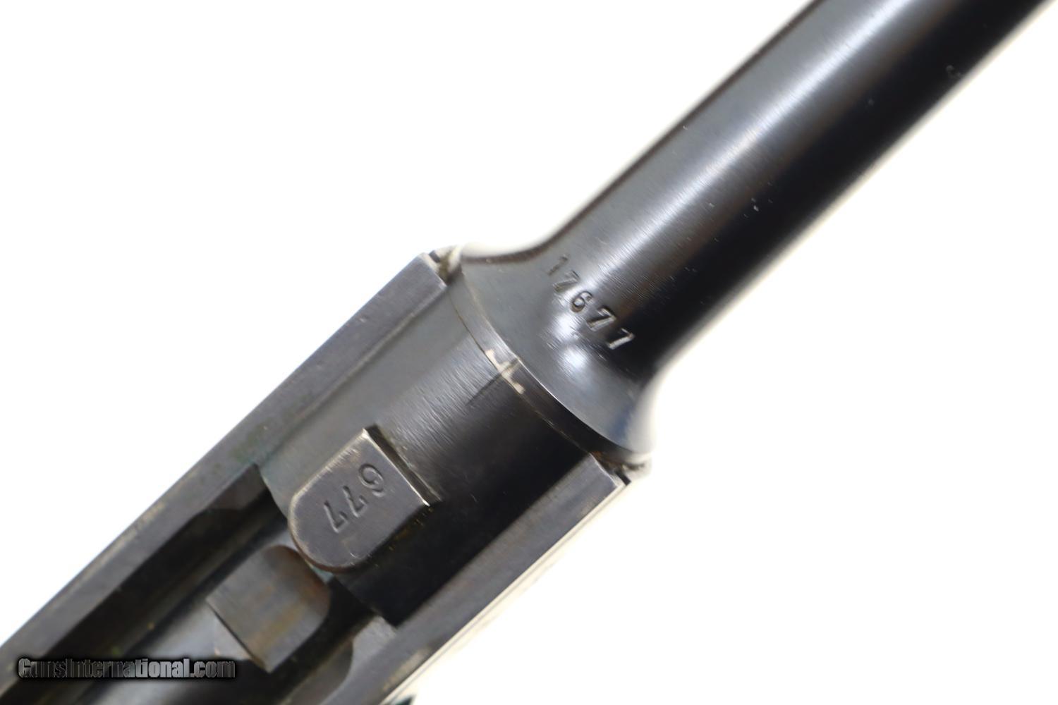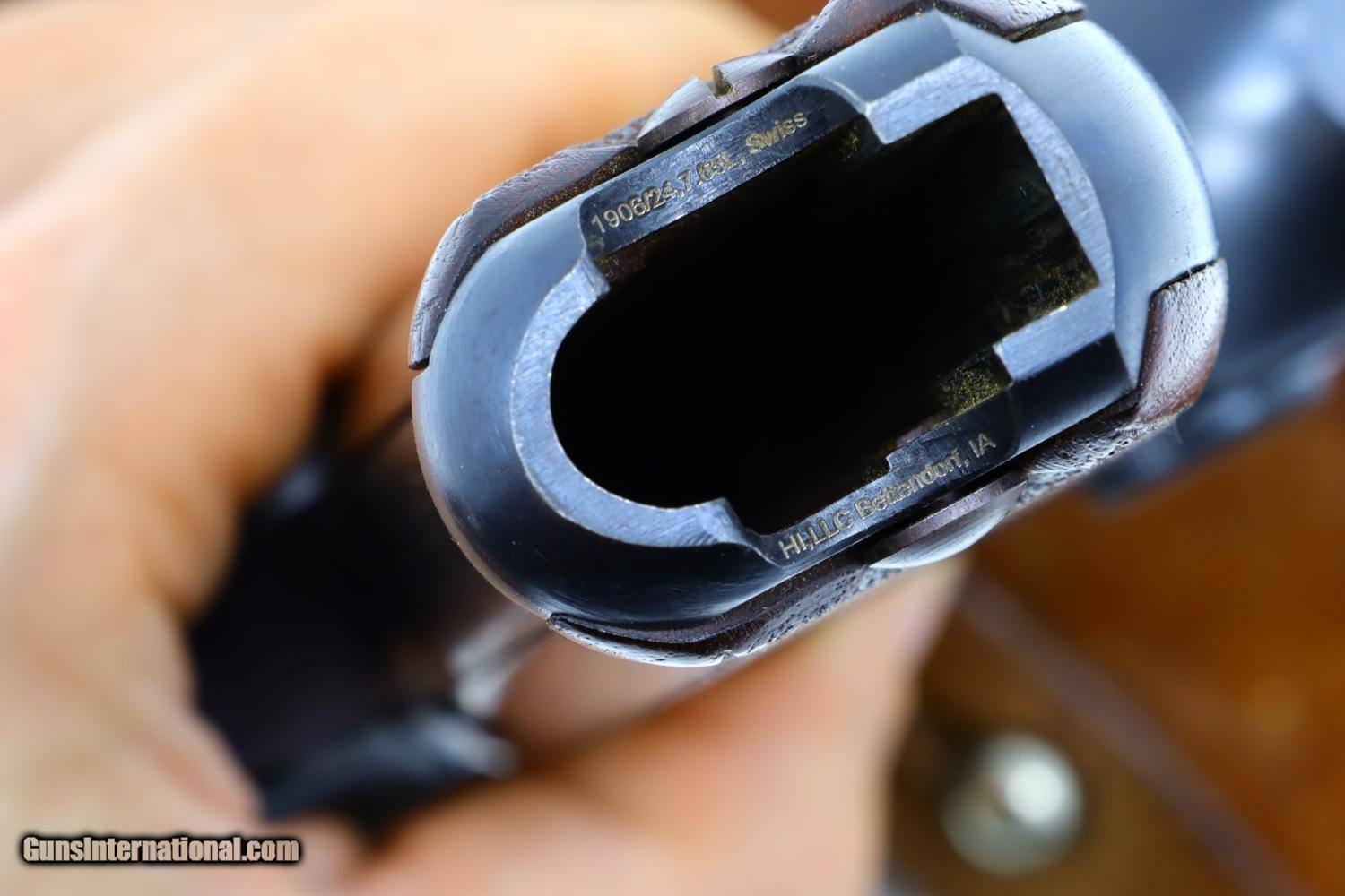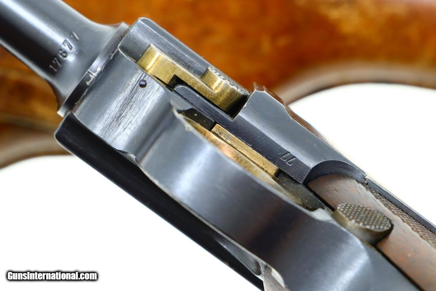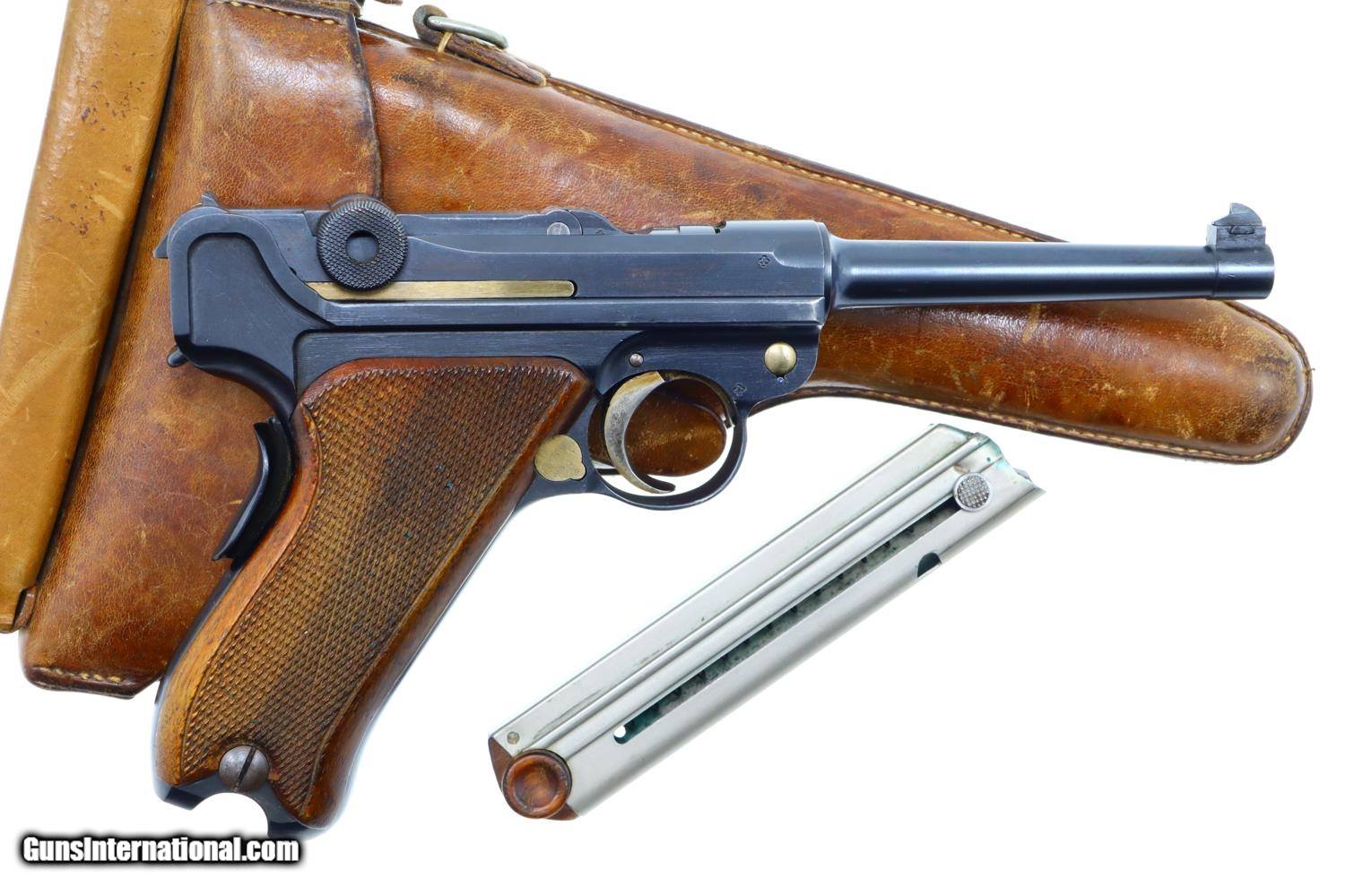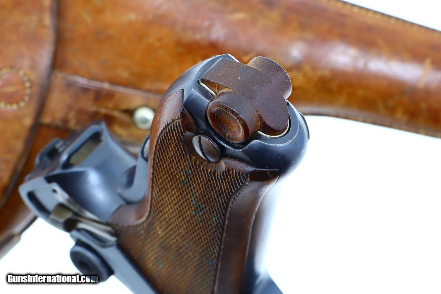 Description: Standard configuration Bern 1924, 7.65mm Luger, with 4.75” barrel having drift adjustable front sight and fixed rear sight. Blank chamber. Middle link with WAFFENFABRIK BERN. “P” release on side of the barrel extension dated 51. Full serial number under barrel and forward frame with the last few digits under the sideplate, trigger, barrel extension, and on all three components of the toggle and grip safety. Matching grips. Scattered Swiss crosses in usual locations. Strawed takedown lever, trigger, magazine release button, ejector and safety lever. Import markings on bottom of frame. Correct magazine with tinned body and unmarked walnut plug. Supple leather holster, from a 1906 pistol, this example dated 1910 with spare magazine pouch on lid. Synopsis: High, original condition Swiss 1924-06 Bern Military Luger with Holster. Condition: Beautiful, bright rust blue, at least 97-98%, only minimal sharp edge wear as one might expect from a pistol that has not seen much service. Comparable condition front and backstraps. Small parts with vivid straw colors. Excellent grips and magazine. Near mirror bore. Perfect manual mechanics. VG holster. A high original condition Swiss 1924 Bern Military Luger, fully matching, with earlier era holster. ~~Insured shipping fee of $65; most packages shipped using FedEx 2nd Day.~~ SOLD Curio/Relic: Yes Manufacturer: Bern Serial Number: 17677 Caliber Info: .30 L |