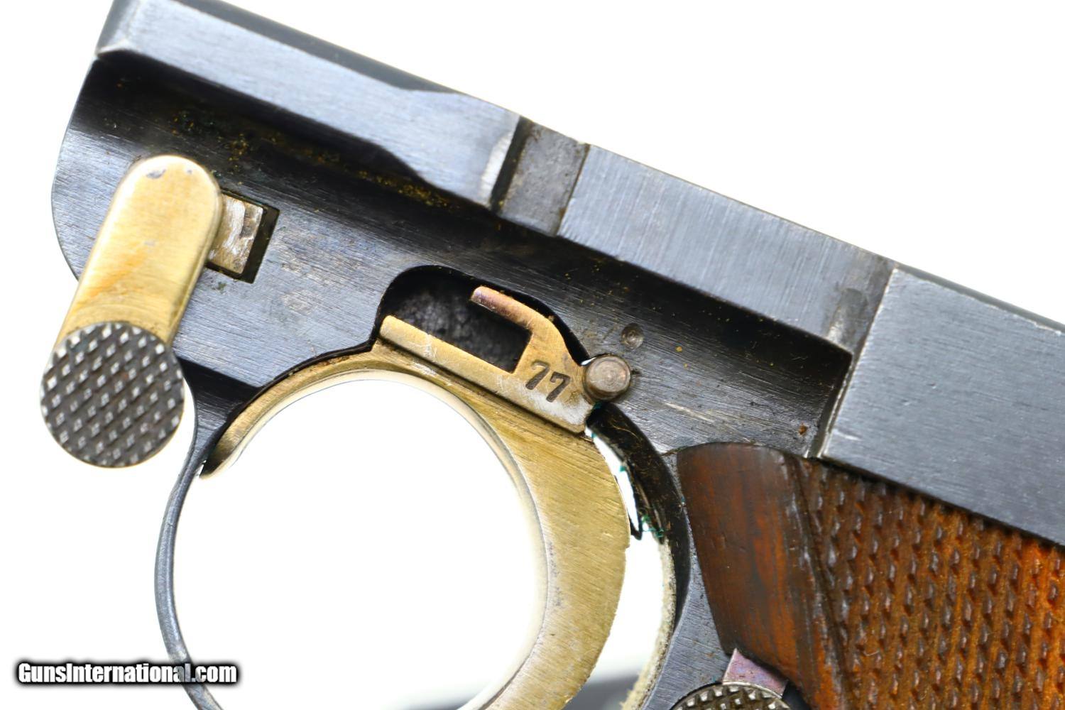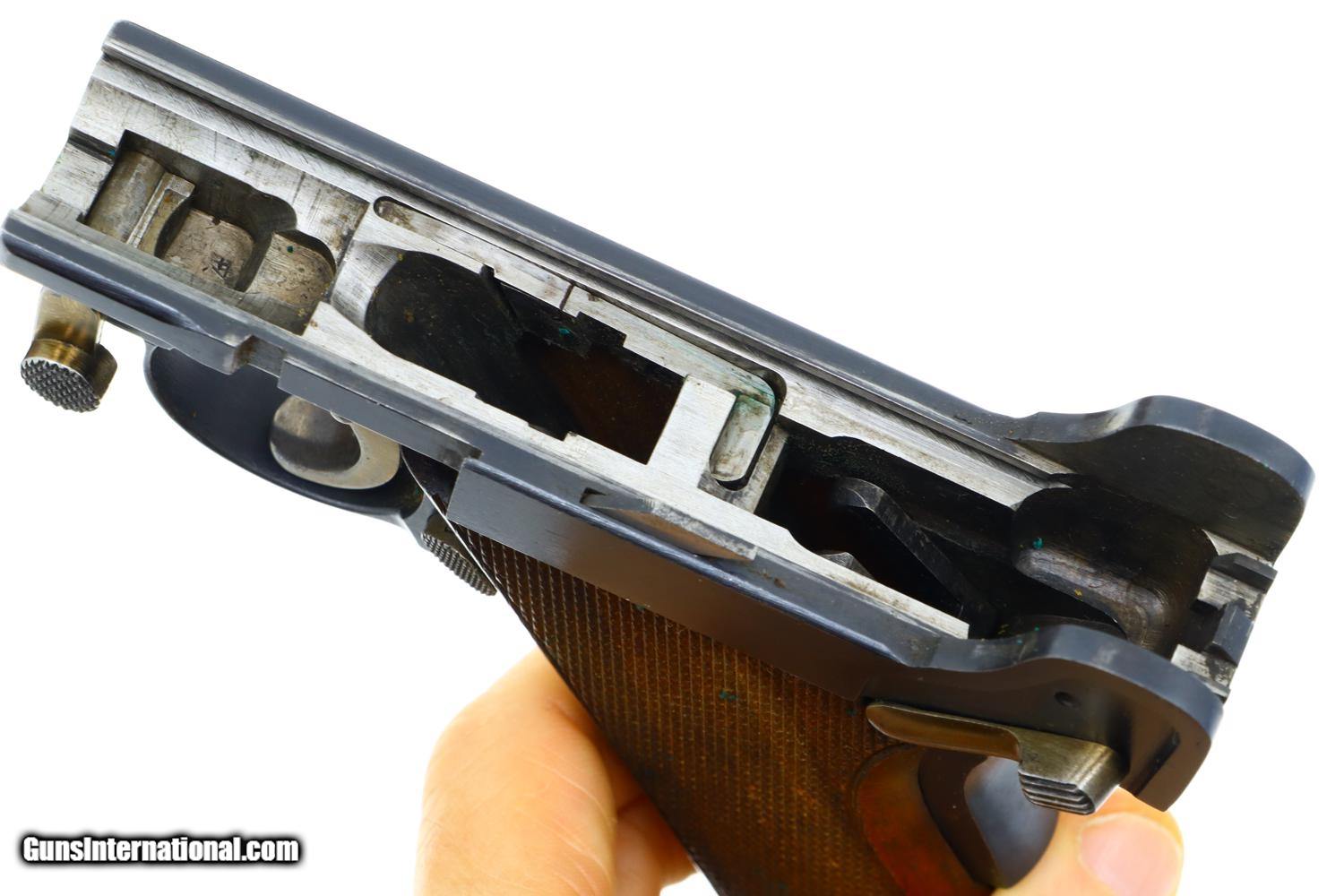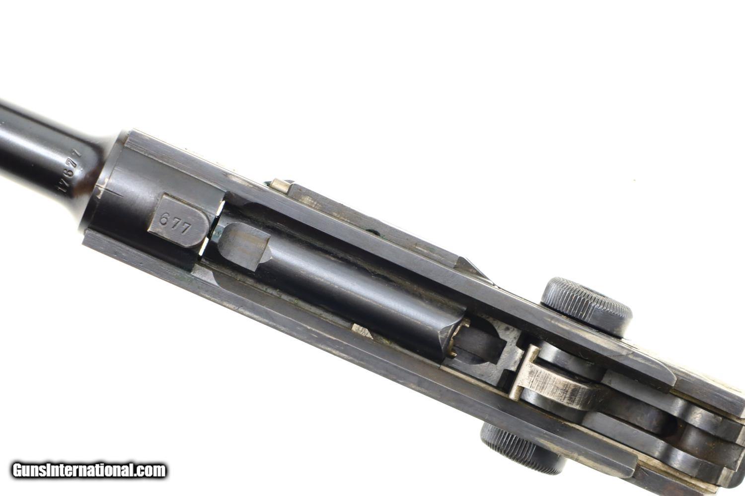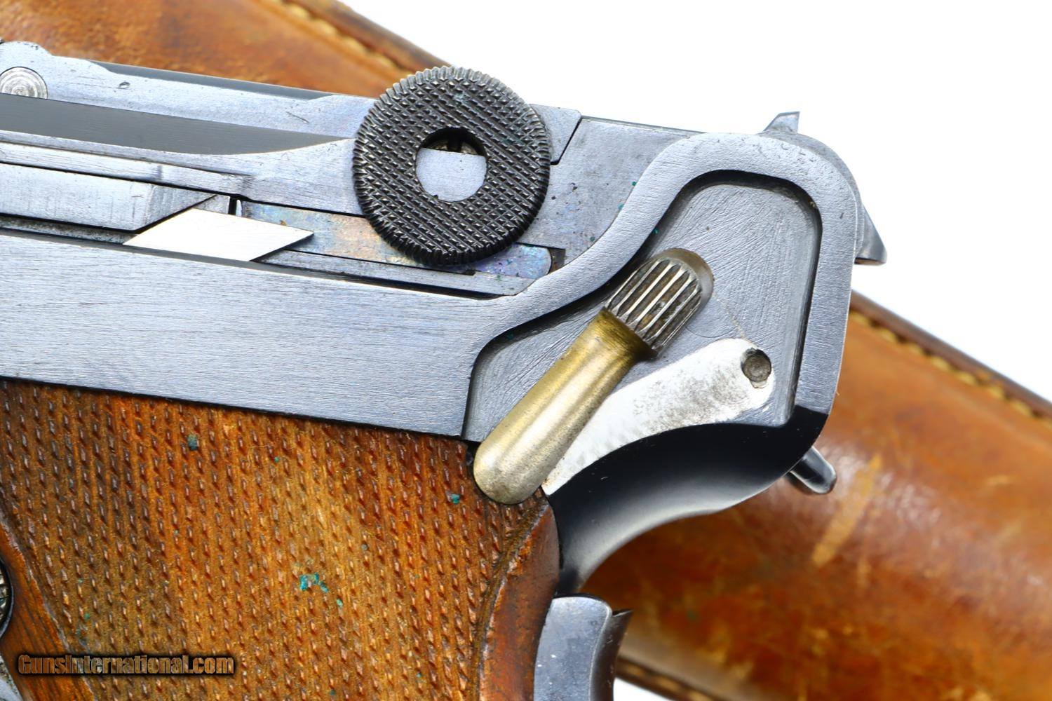 Description: Standard configuration Bern 1924, 7.65mm Luger, with 4.75” barrel having drift adjustable front sight and fixed rear sight. Blank chamber. Middle link with WAFFENFABRIK BERN. “P” release on side of the barrel extension dated 51. Full serial number under barrel and forward frame with the last few digits under the sideplate, trigger, barrel extension, and on all three components of the toggle and grip safety. Matching grips. Scattered Swiss crosses in usual locations. Strawed takedown lever, trigger, magazine release button, ejector and safety lever. Import markings on bottom of frame. Correct magazine with tinned body and unmarked walnut plug. Supple leather holster, from a 1906 pistol, this example dated 1910 with spare magazine pouch on lid. Synopsis: High, original condition Swiss 1924-06 Bern Military Luger with Holster. Condition: Beautiful, bright rust blue, at least 97-98%, only minimal sharp edge wear as one might expect from a pistol that has not seen much service. Comparable condition front and backstraps. Small parts with vivid straw colors. Excellent grips and magazine. Near mirror bore. Perfect manual mechanics. VG holster. A high original condition Swiss 1924 Bern Military Luger, fully matching, with earlier era holster. ~~Insured shipping fee of $65; most packages shipped using FedEx 2nd Day.~~ SOLD Curio/Relic: Yes Manufacturer: Bern Serial Number: 17677 Caliber Info: .30 L |