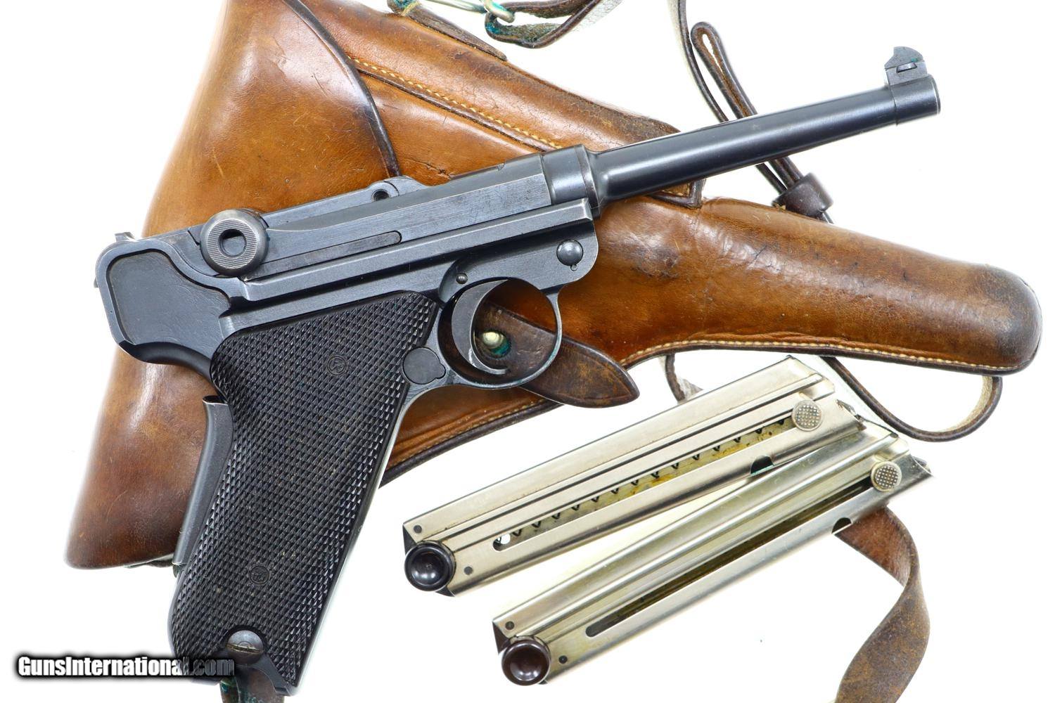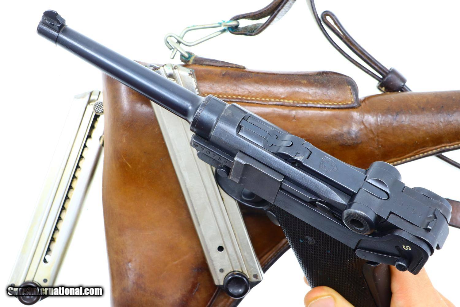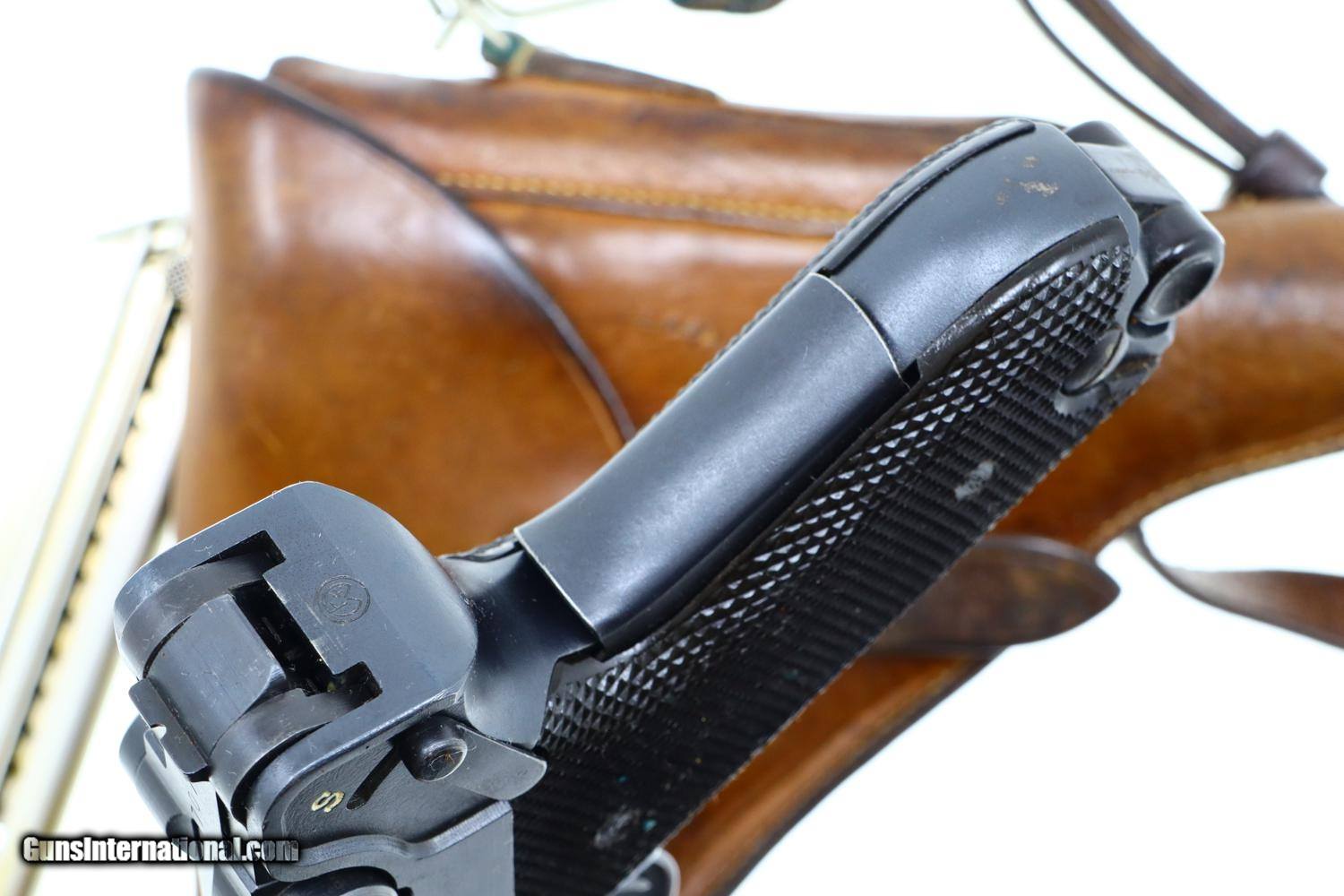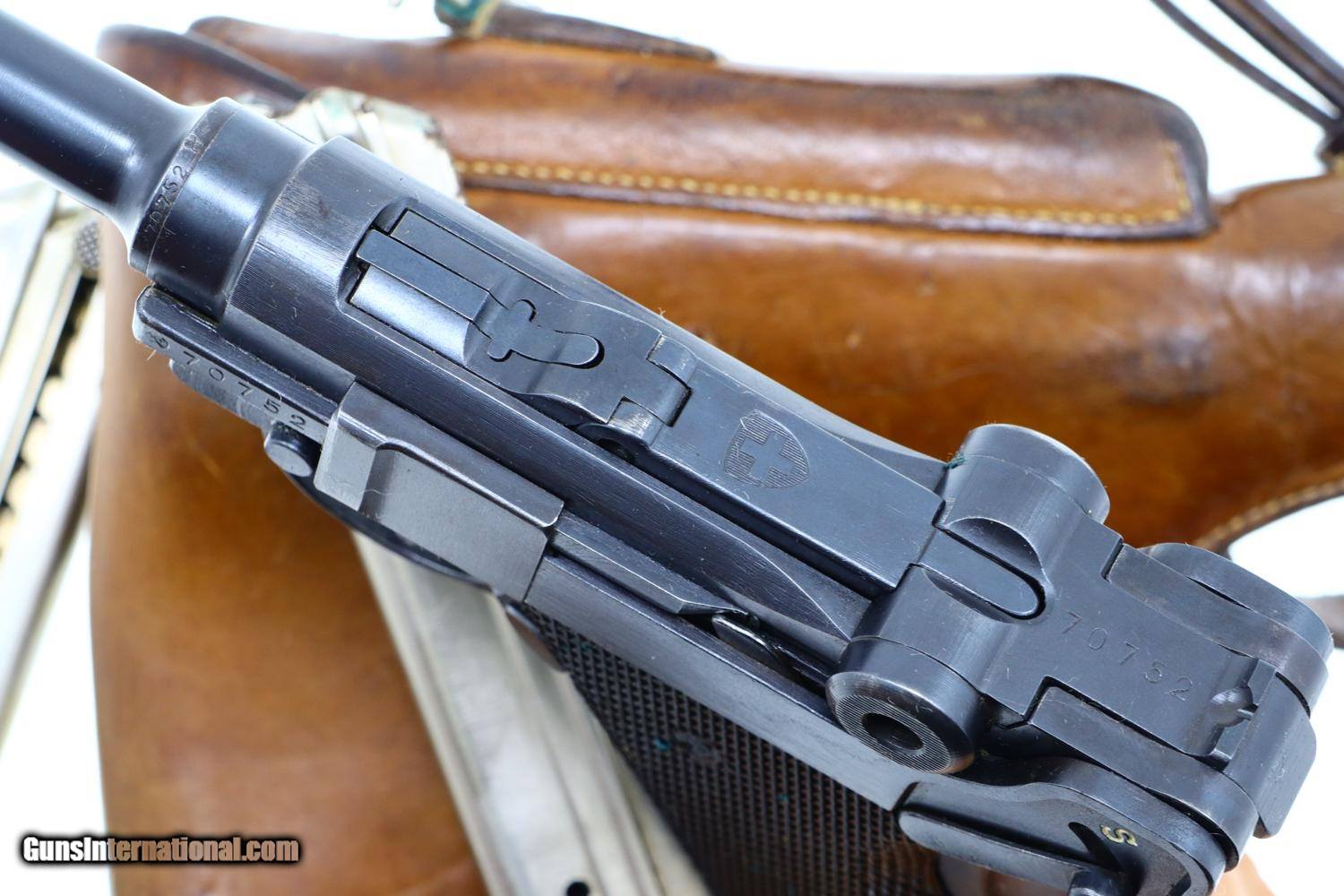 Near excellent original matte finish as photographed. Crisp grips with sharply molded checkering, no discernible losses. Excellent magazines. Mirror bore. Perfect manual mechanics. An extremely attractive example of the Swiss military M1929 Bern Luger with black grips, this pistol assembled during WWII.