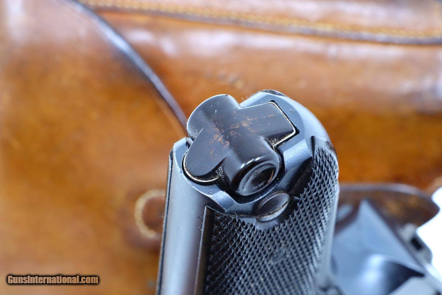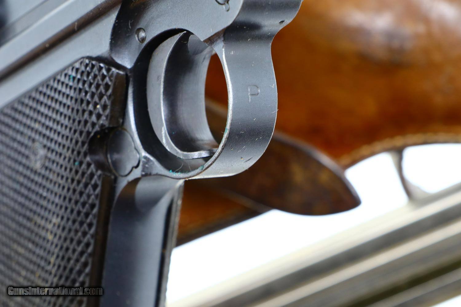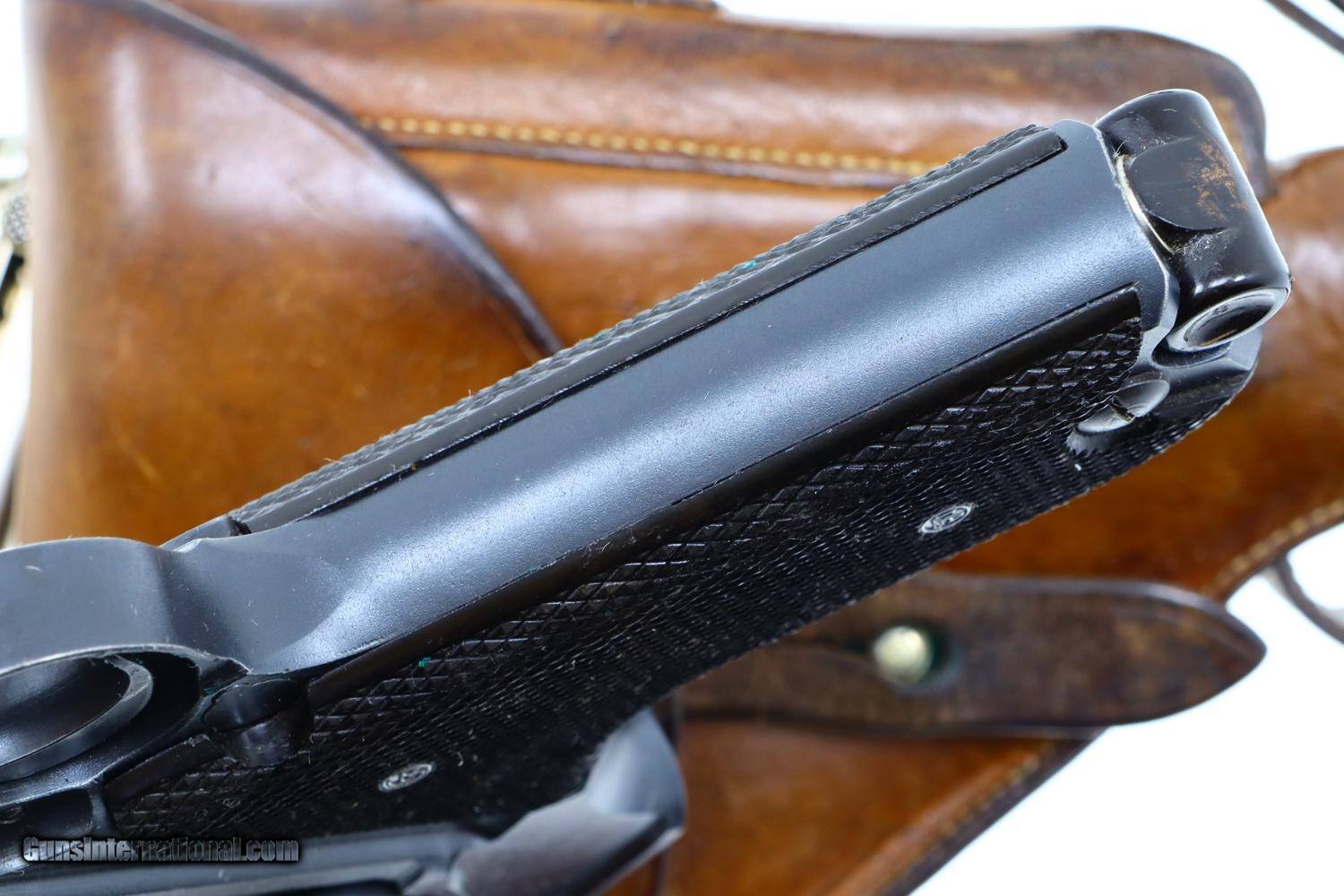 Standard 4.75” barrel with drift adjustable front sight and fixed rear sight. Full matching serial number on barrel, left rail, and rear toggle link with last three digits repeated on sideplate and receiver lug. All small parts with usual inspector markings. "P" release on the front of the trigger guard. Forward frame recess marked "44" reflecting production 1944 (no month visible). W/F logo on back of frame. Uniformly checkered black plastic grips, each panel molded with an encircled "W/F" logo. Original magazines. Complete with earlier dated holster (1937) and strap.