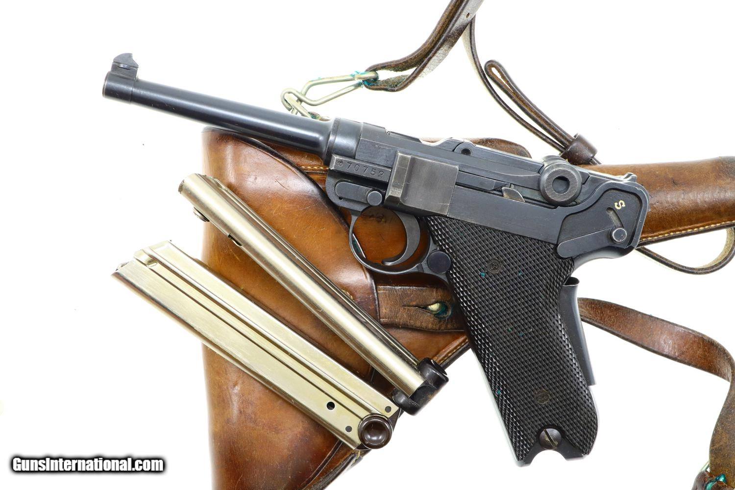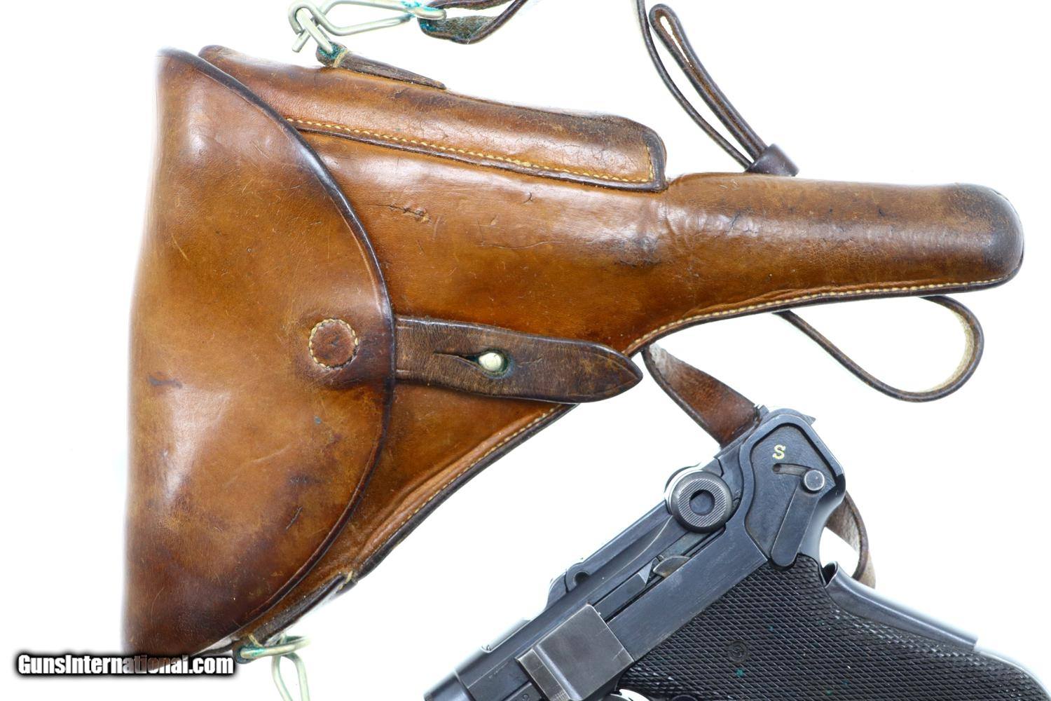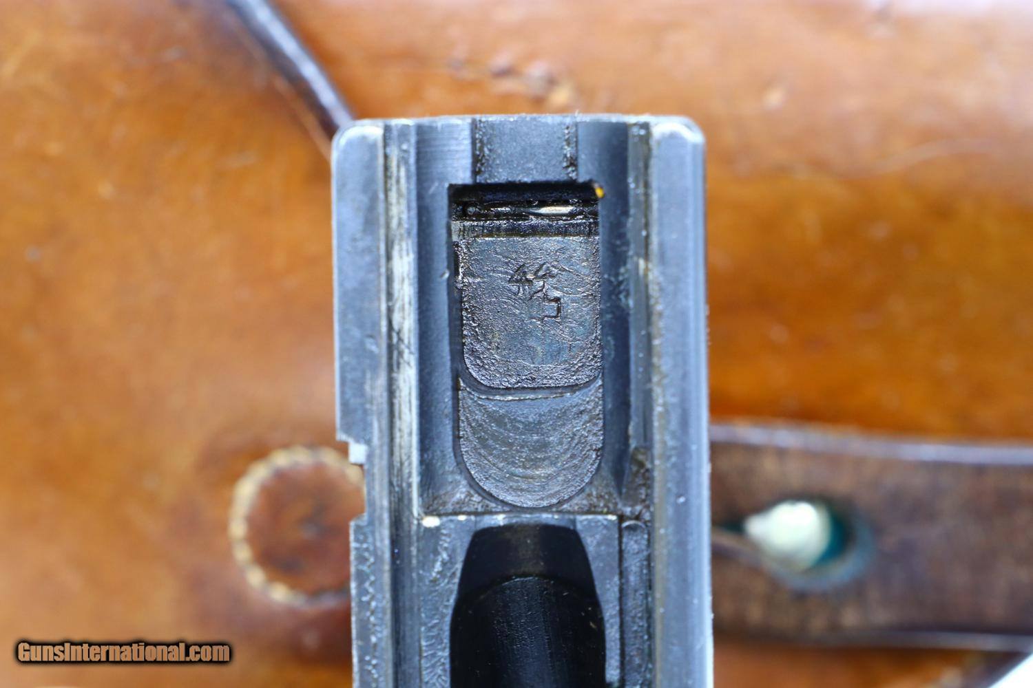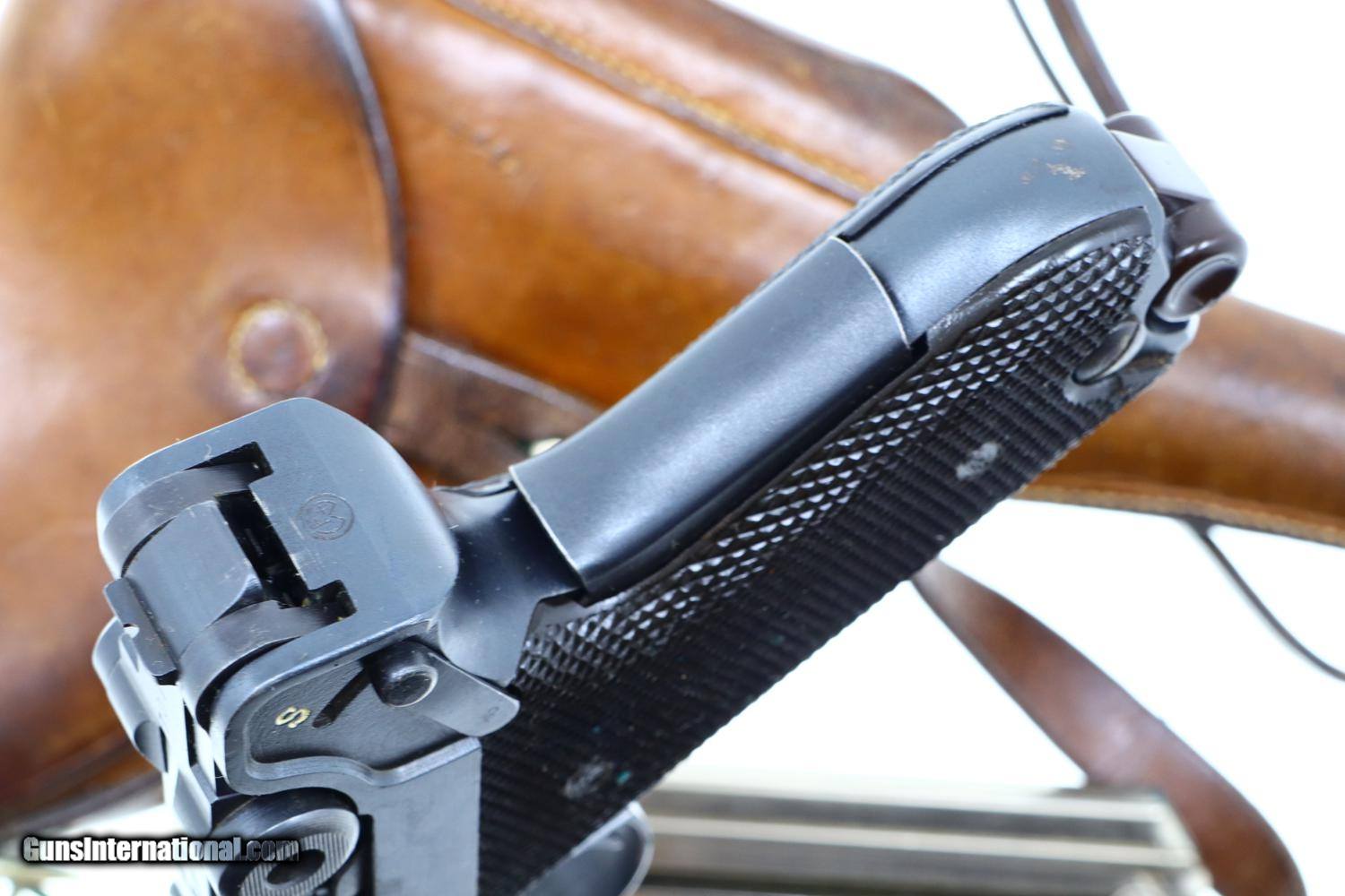 Description: Description: Standard 4.75” barrel with drift adjustable front sight and fixed rear sight. Full matching serial number on barrel, left rail, and rear toggle link with last three digits repeated on sideplate and receiver lug. All small parts with usual inspector markings. "P" release on the front of the trigger guard. Forward frame recess marked "44" reflecting production 1944 (no month visible). W/F logo on back of frame. Uniformly checkered black plastic grips, each panel molded with an encircled "W/F" logo. Original magazines. Complete with earlier dated holster (1937) and strap. Synopsis: Bern M1929 Luger rig, all matching, black grips, correct magazines, and holster/strap. Condition: Near excellent original matte finish as photographed. Crisp grips with sharply molded checkering, no discernible losses. Excellent magazines. Mirror bore. Perfect manual mechanics. An extremely attractive example of the Swiss military M1929 Bern Luger with black grips, this pistol assembled during WWII. SOLD Manufacturer: Bern Model: 1929 Serial Number: 70752 Caliber Info: .30 L Condition: 0.98 |