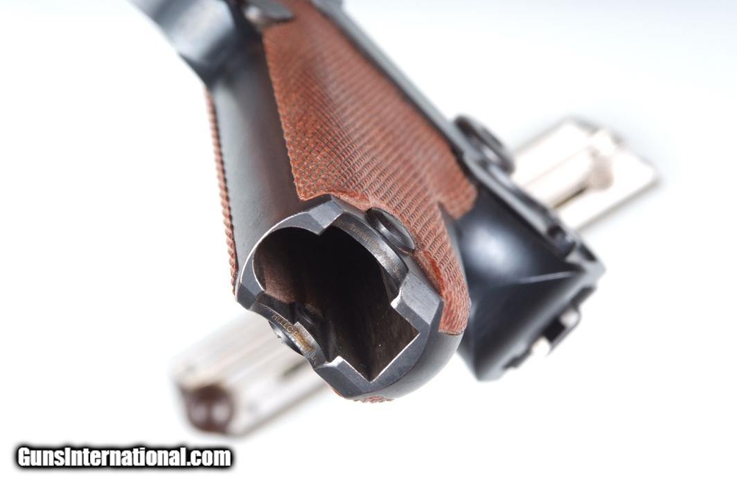 Description: Standard 4.75” barrel with drift adjustable front sight and fixed “U” rear sight. Full matching serial number on barrel, left rail, and rear toggle link with last three digits repeated on side plate and receiver lug. All small parts with usual inspector markings. “P” release marking on front of trigger guard. Forward frame recess marked “6.39” reflecting manufacture in June 1939. W/F logo on back of frame. Uniformly checkered red hard rubber grips with updated magazine having a brown plug. Synopsis: Excellent Swiss Waffenfabrik Bern 1929 Luger, matching, made 1939, standard polish, red grips with updated magazine. Condition: Near excellent original salt blue showing sharp edge holster wear. Speckling over surface of extractor. Minimal thinning of front/back straps. Bright bore with sharp rifling. Perfect manual mechanics. Excellent condition magazine. One of the most desirable of the M1929 Bern Lugers. ~~Insured shipping fee of $55; most packages shipped using FedEx 2nd Day.~~ SOLD Manufacturer: Bern Serial Number: 56377 Caliber Info: 7.65 Luger |