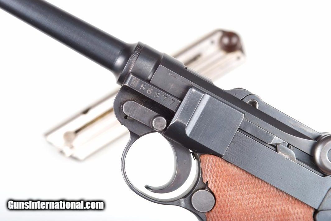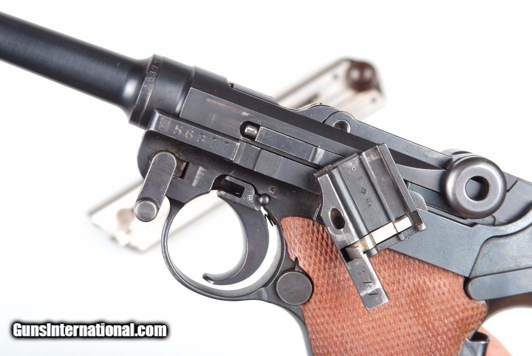 Description: Standard 4.75” barrel with drift adjustable front sight and fixed “U” rear sight. Full matching serial number on barrel, left rail, and rear toggle link with last three digits repeated on side plate and receiver lug. All small parts with usual inspector markings. “P” release marking on front of trigger guard. Forward frame recess marked “6.39” reflecting manufacture in June 1939. W/F logo on back of frame. Uniformly checkered red hard rubber grips with updated magazine having a brown plug. Synopsis: Excellent Swiss Waffenfabrik Bern 1929 Luger, matching, made 1939, standard polish, red grips with updated magazine. Condition: Near excellent original salt blue showing sharp edge holster wear. Speckling over surface of extractor. Minimal thinning of front/back straps. Bright bore with sharp rifling. Perfect manual mechanics. Excellent condition magazine. One of the most desirable of the M1929 Bern Lugers. ~~Insured shipping fee of $55; most packages shipped using FedEx 2nd Day.~~ SOLD Curio/Relic: Yes Manufacturer: Bern Serial Number: 56377 Caliber Info: 7.65 Luger |