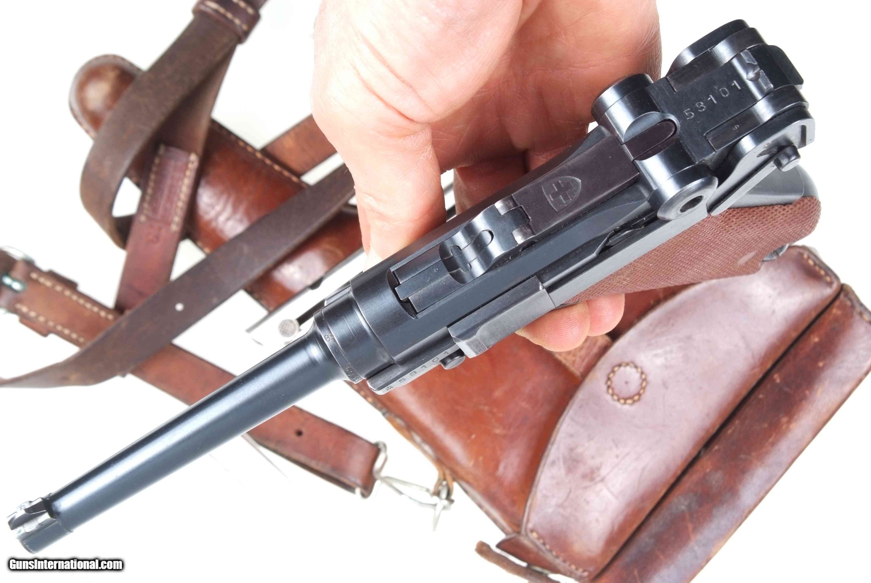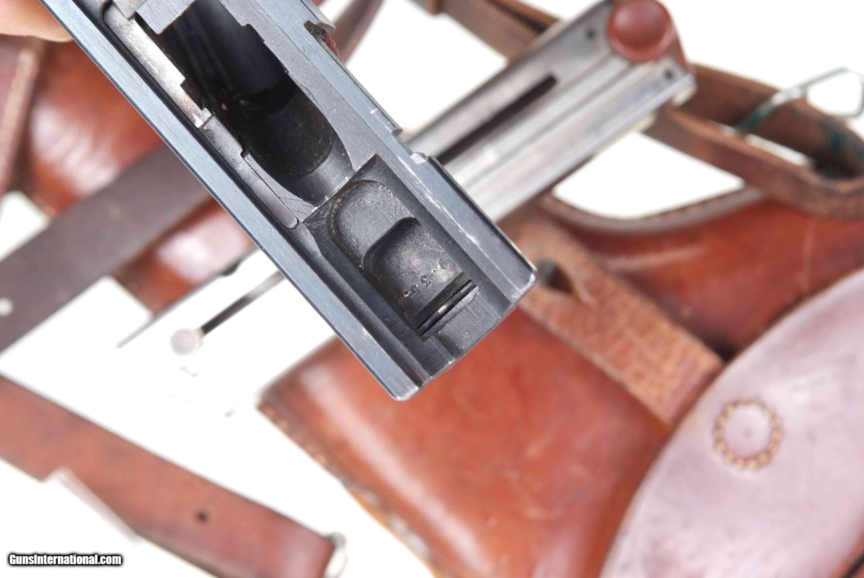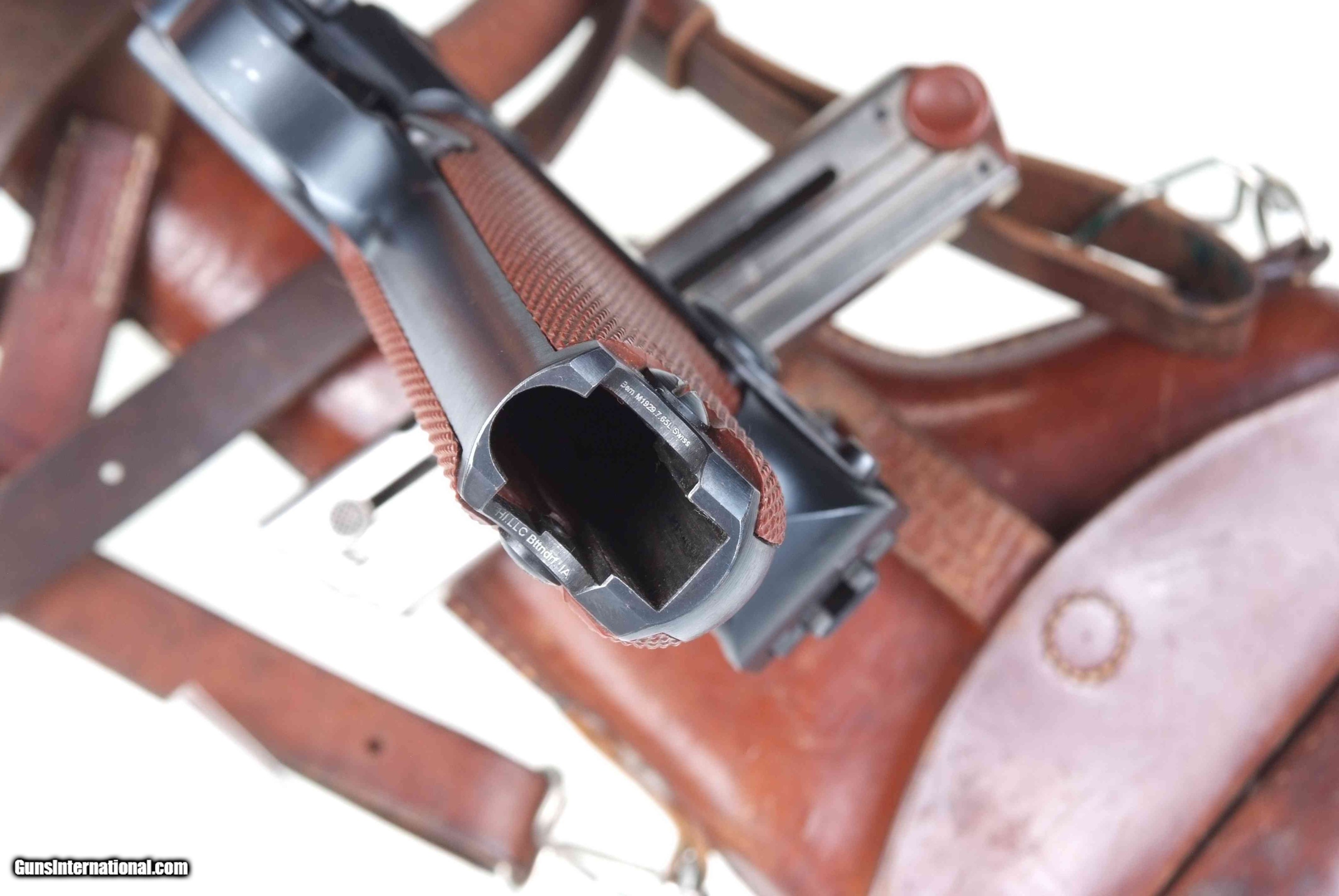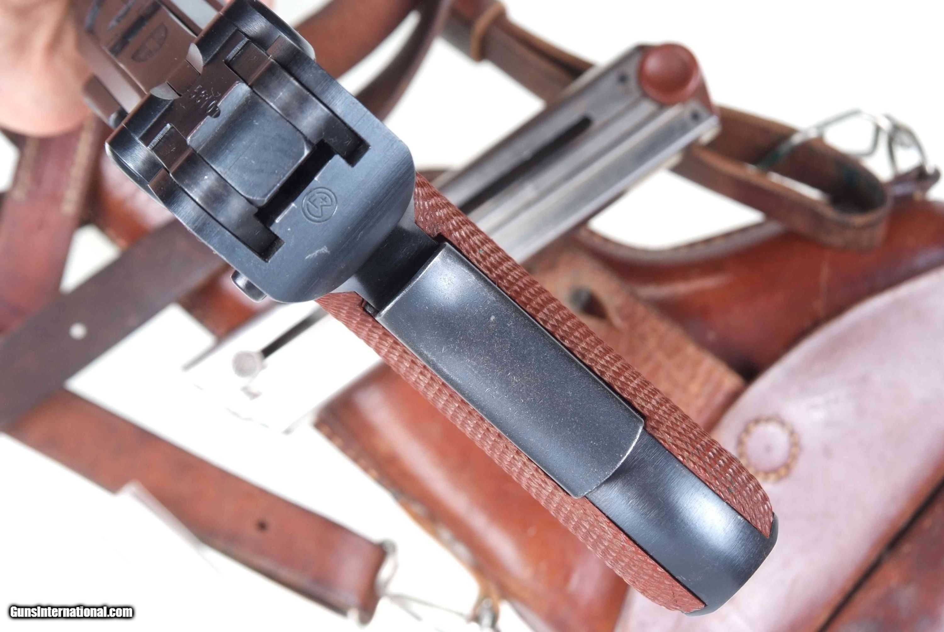 Description: Standard 4.75” barrel with drift adjustable front sight and fixed rear sight. Full matching serial number on barrel, left rail, and rear toggle link with last few digits repeated on sideplate. Unnumbered receiver lug. All small parts with usual inspector markings. P release on forward frame whose recess is marked "9.35" reflecting production in September 1935. W/F logo on back of frame. Uniformly checkered red grips, the left panel molded with two small circles, the upper with the W/F logo. Original red bottom magazine with blued follower. Earlier era Swiss military holster with added magazine pouch, holster manufacturer marked and dated "17"; shoulder strap "39". Synopsis: Swiss Bern 1929 Luger, Early Military, all matching with red grips, correct red bottom magazine, earlier era holster and strap. Condition: Near excellent original salt blue finish with holster wear in expected locations as well as slight thinning of sideplate. Surprisingly strong front and back straps. Excellent grips with sharply molded checkering, no splits or losses. Comparable condition magazine with plug having several chips on left side as photographed. Near mirror bore with sharp rifling. Perfect manual mechanics. VG+ holster and strap with supple leather and original stitching showing no repair. A very attractive, early Swiss military Bern with the highly desirable red grip and magazine in an earlier era holster but correctly dated shoulder strap. ~~Insured shipping fee of $65; most packages shipped using FedEx 2nd Day.~~ SOLD Curio/Relic: Yes Manufacturer: Bern Serial Number: 53101 Caliber Info: 7.65P |