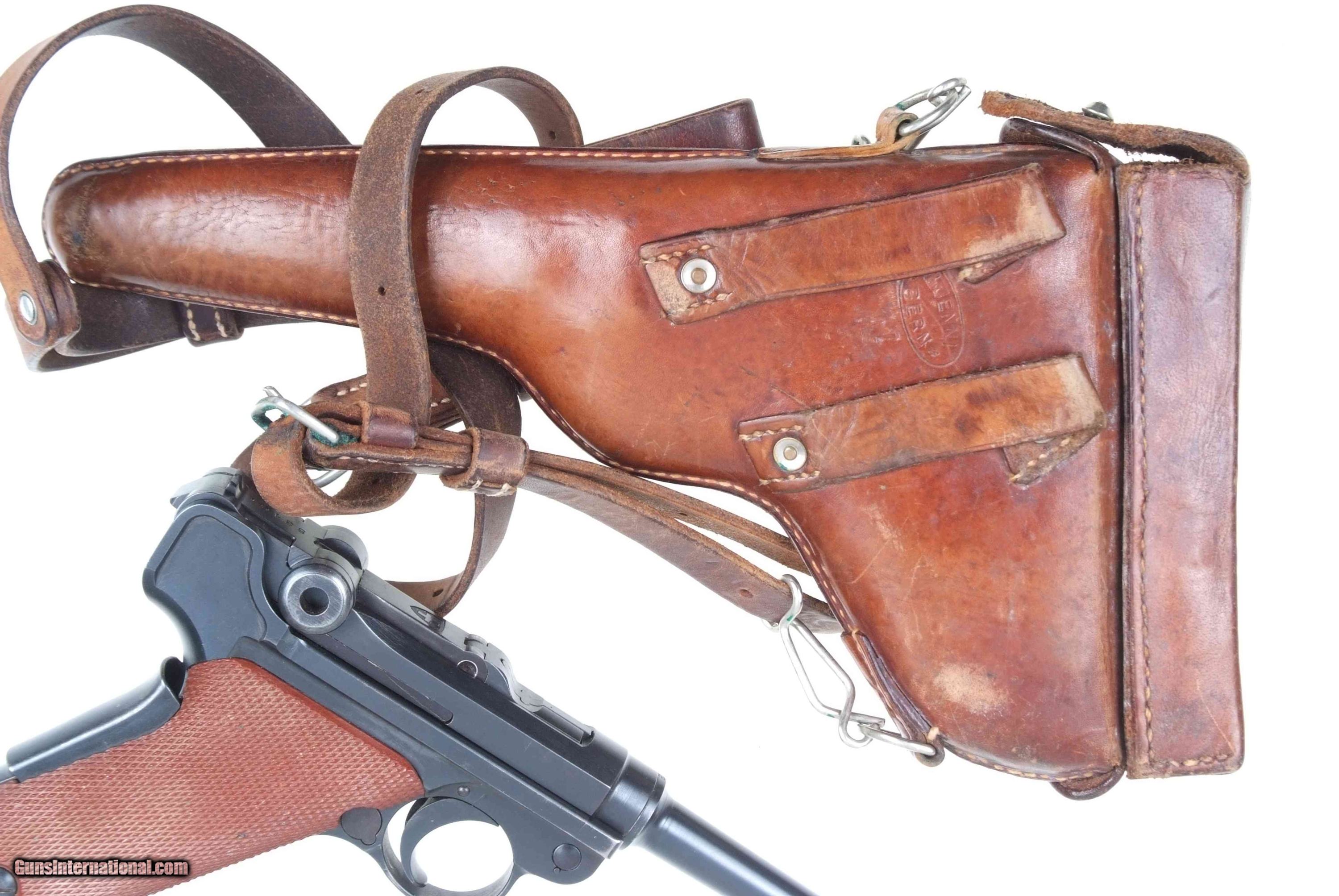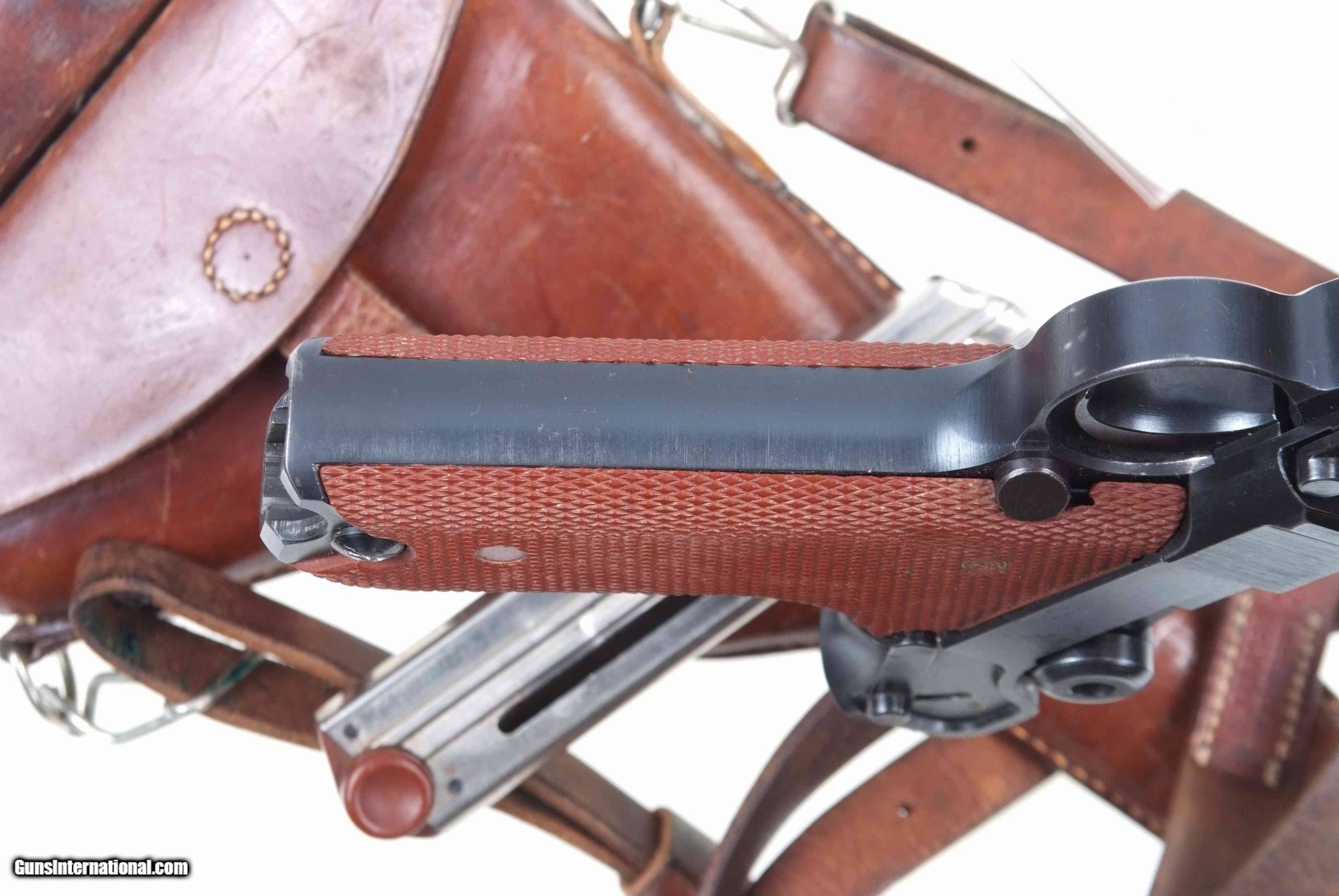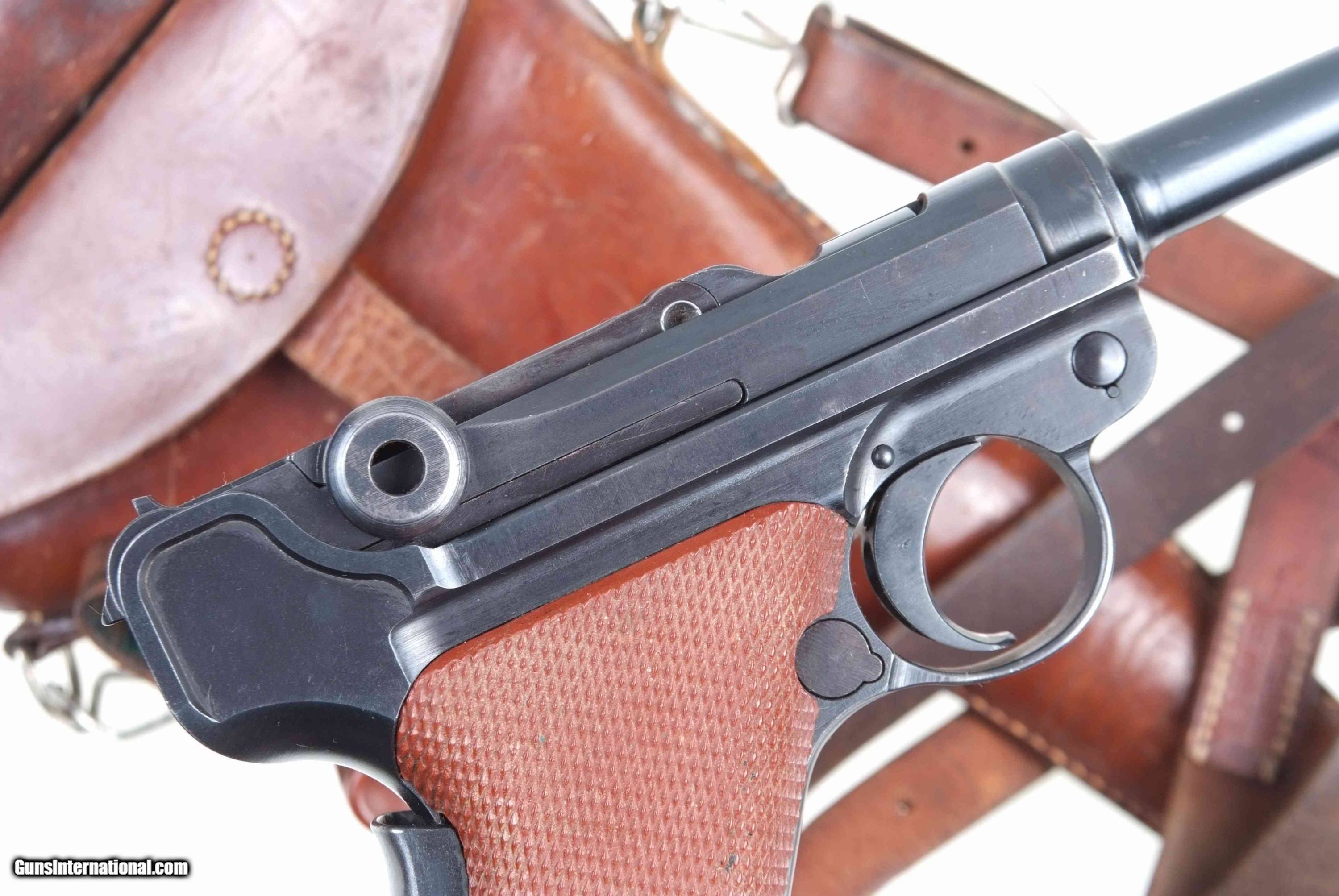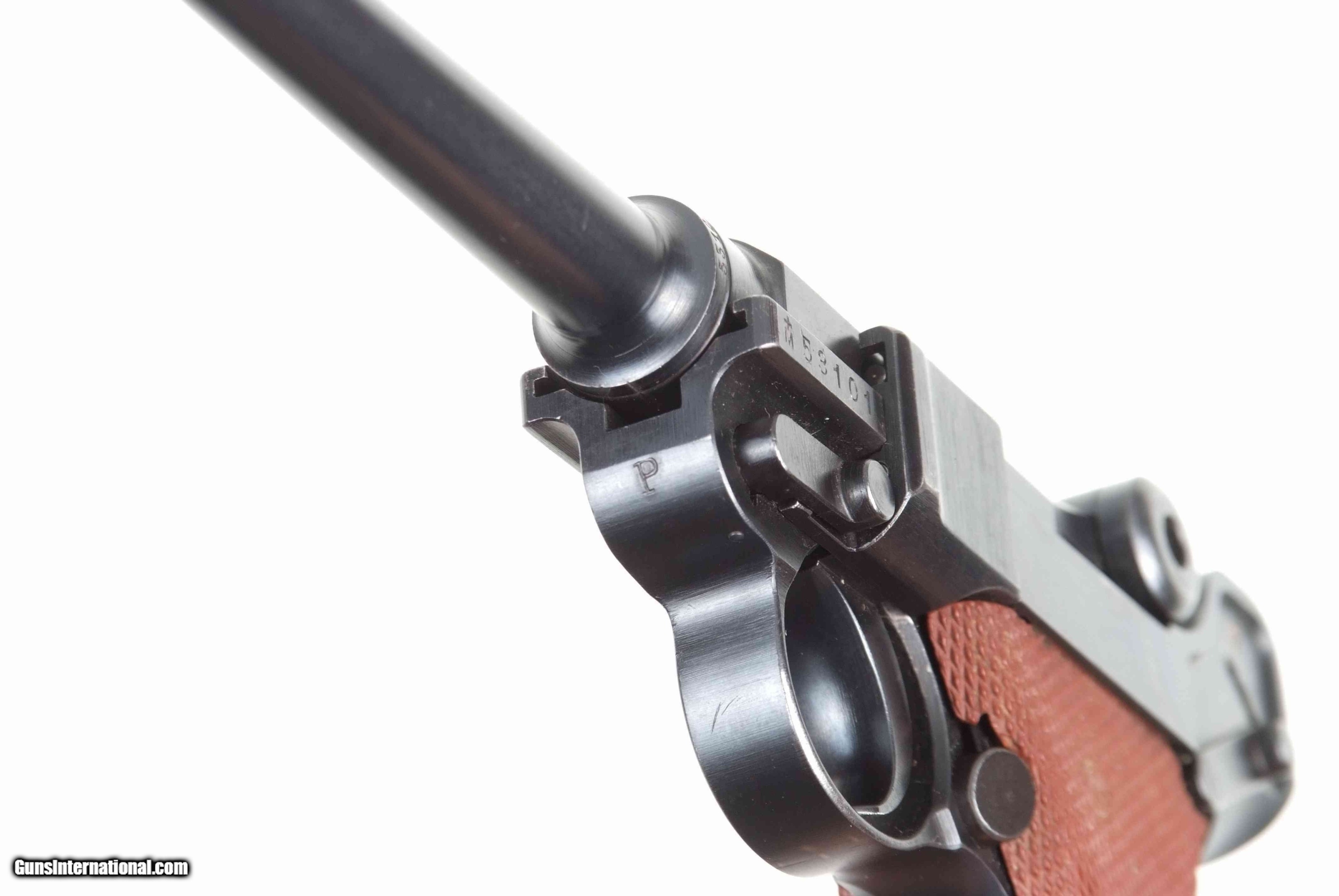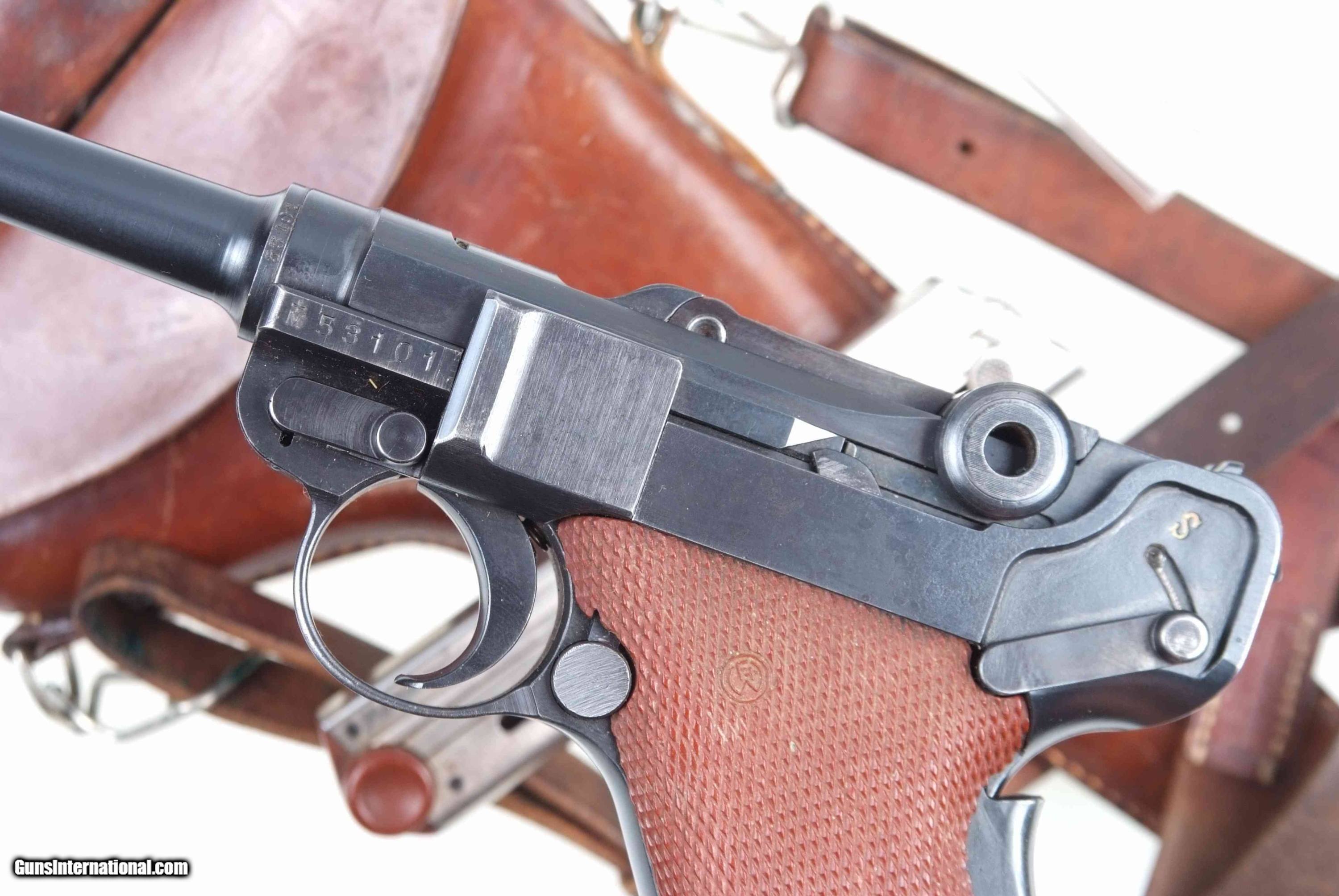 Description: Standard 4.75” barrel with drift adjustable front sight and fixed rear sight. Full matching serial number on barrel, left rail, and rear toggle link with last few digits repeated on sideplate. Unnumbered receiver lug. All small parts with usual inspector markings. P release on forward frame whose recess is marked "9.35" reflecting production in September 1935. W/F logo on back of frame. Uniformly checkered red grips, the left panel molded with two small circles, the upper with the W/F logo. Original red bottom magazine with blued follower. Earlier era Swiss military holster with added magazine pouch, holster manufacturer marked and dated "17"; shoulder strap "39". Synopsis: Swiss Bern 1929 Luger, Early Military, all matching with red grips, correct red bottom magazine, earlier era holster and strap. Condition: Near excellent original salt blue finish with holster wear in expected locations as well as slight thinning of sideplate. Surprisingly strong front and back straps. Excellent grips with sharply molded checkering, no splits or losses. Comparable condition magazine with plug having several chips on left side as photographed. Near mirror bore with sharp rifling. Perfect manual mechanics. VG+ holster and strap with supple leather and original stitching showing no repair. A very attractive, early Swiss military Bern with the highly desirable red grip and magazine in an earlier era holster but correctly dated shoulder strap. ~~Insured shipping fee of $65; most packages shipped using FedEx 2nd Day.~~ SOLD Curio/Relic: Yes Manufacturer: Bern Serial Number: 53101 Caliber Info: 7.65P |