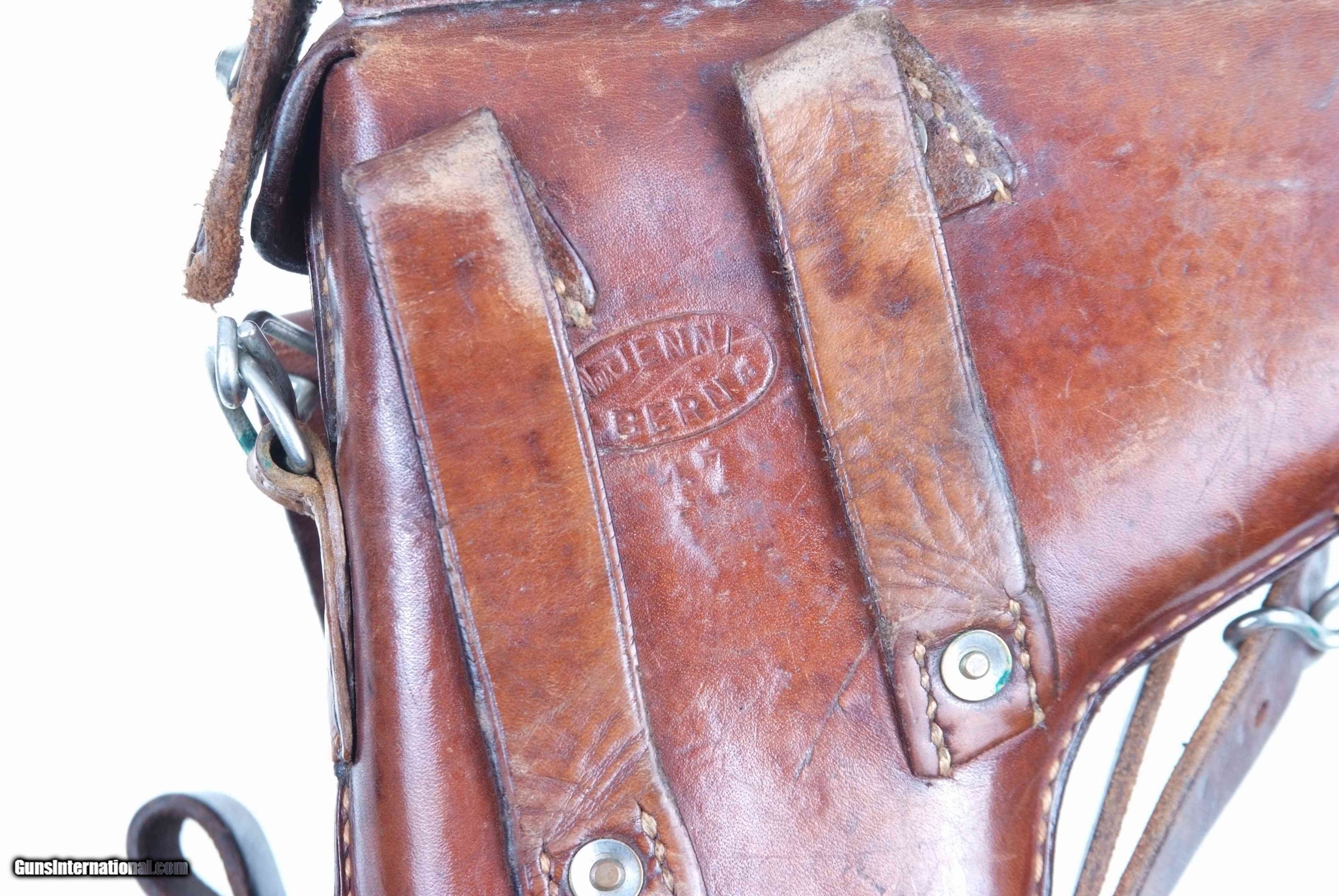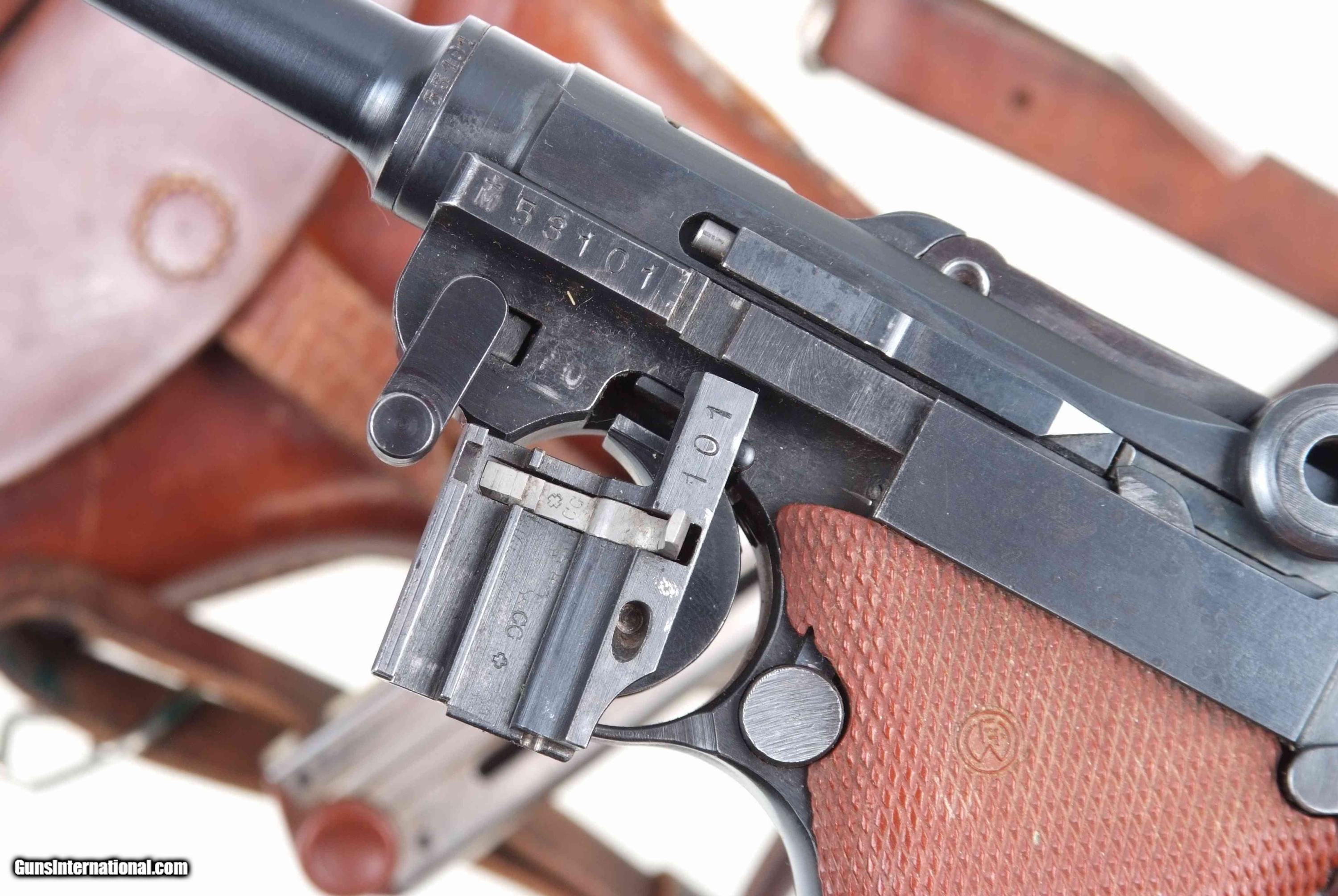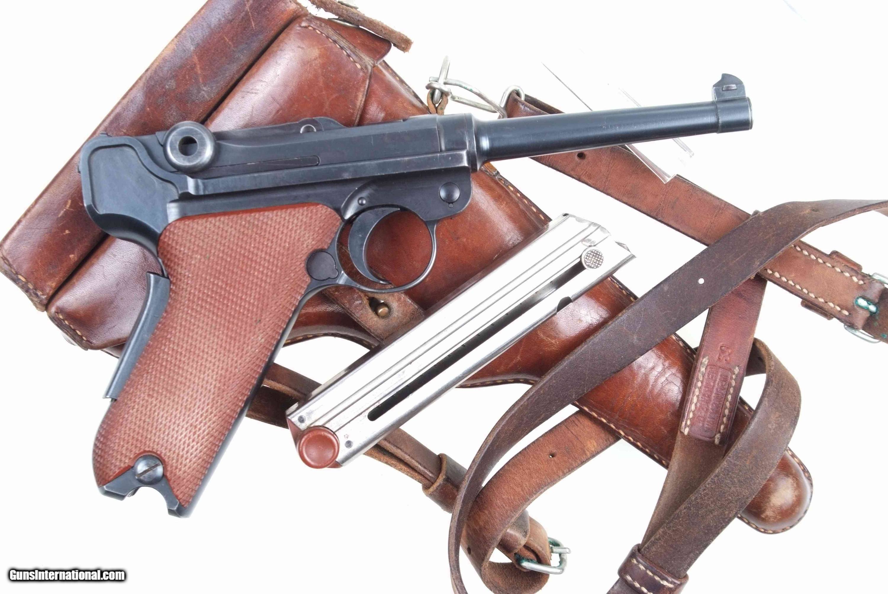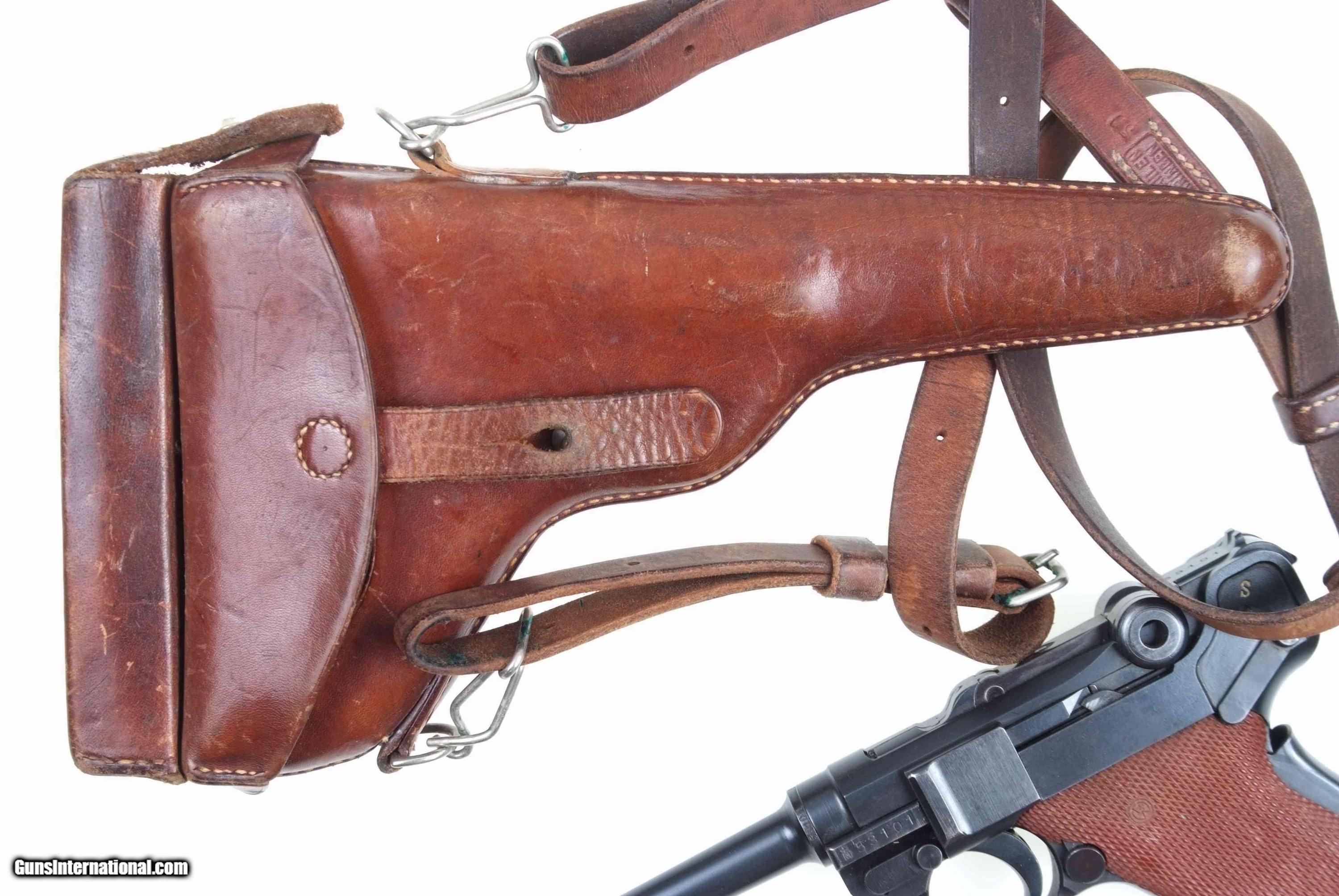 Description: Standard 4.75” barrel with drift adjustable front sight and fixed rear sight. Full matching serial number on barrel, left rail, and rear toggle link with last few digits repeated on sideplate. Unnumbered receiver lug. All small parts with usual inspector markings. P release on forward frame whose recess is marked "9.35" reflecting production in September 1935. W/F logo on back of frame. Uniformly checkered red grips, the left panel molded with two small circles, the upper with the W/F logo. Original red bottom magazine with blued follower. Earlier era Swiss military holster with added magazine pouch, holster manufacturer marked and dated "17"; shoulder strap "39". Synopsis: Swiss Bern 1929 Luger, Early Military, all matching with red grips, correct red bottom magazine, earlier era holster and strap. Condition: Near excellent original salt blue finish with holster wear in expected locations as well as slight thinning of sideplate. Surprisingly strong front and back straps. Excellent grips with sharply molded checkering, no splits or losses. Comparable condition magazine with plug having several chips on left side as photographed. Near mirror bore with sharp rifling. Perfect manual mechanics. VG+ holster and strap with supple leather and original stitching showing no repair. A very attractive, early Swiss military Bern with the highly desirable red grip and magazine in an earlier era holster but correctly dated shoulder strap. ~~Insured shipping fee of $65; most packages shipped using FedEx 2nd Day.~~ SOLD Curio/Relic: Yes Manufacturer: Bern Serial Number: 53101 Caliber Info: 7.65P |