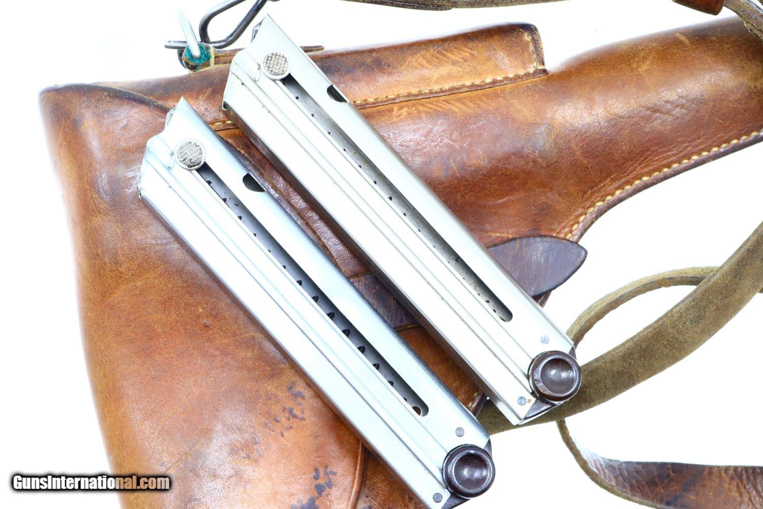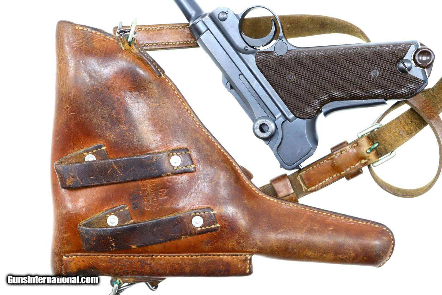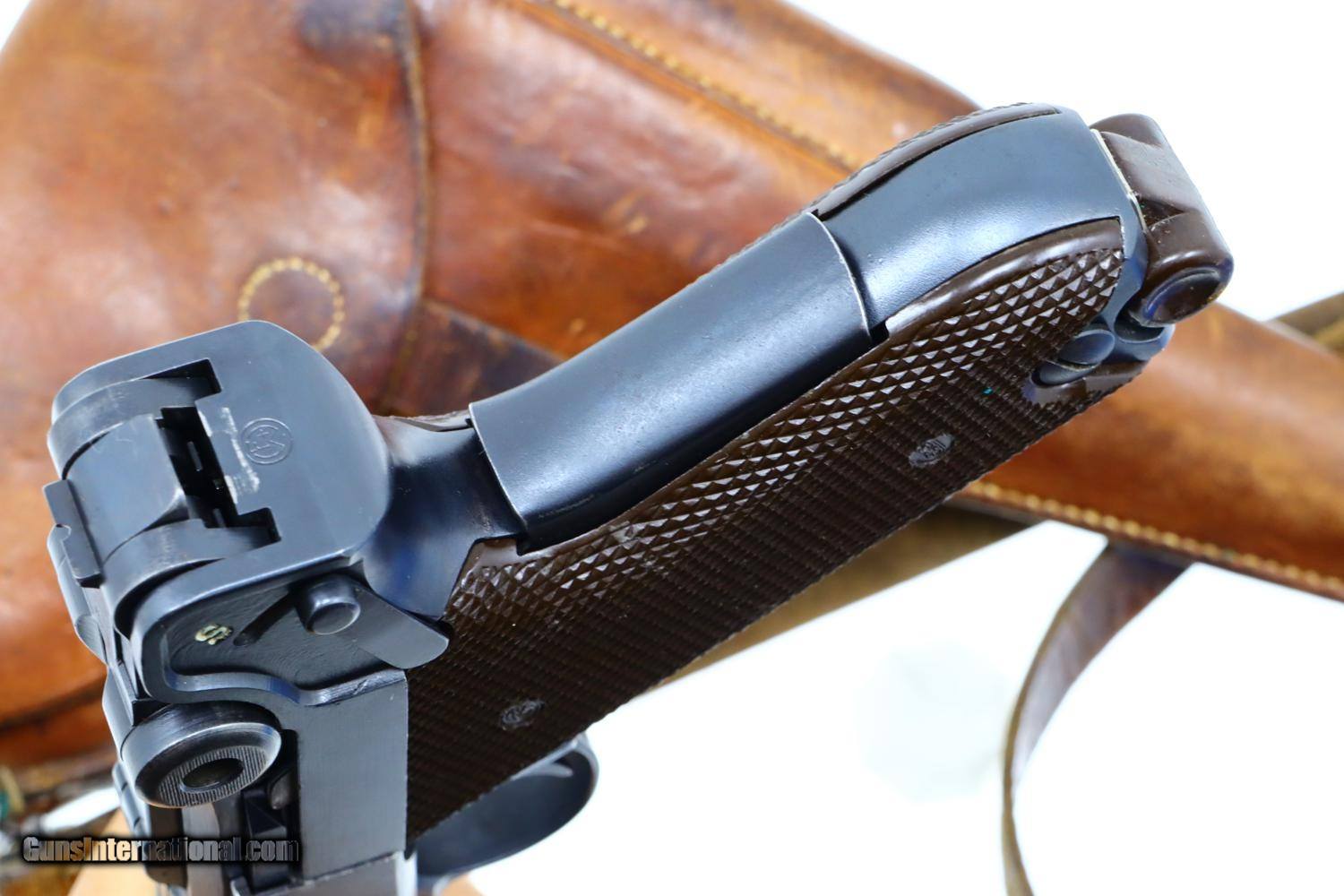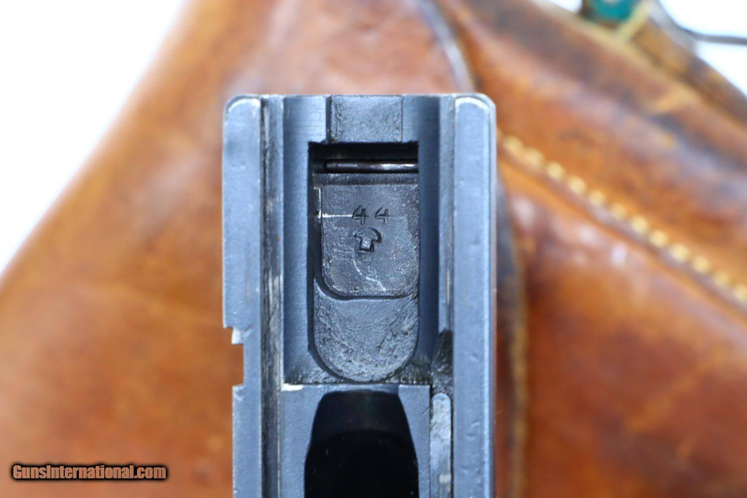 Description: Standard 4.75” barrel with drift adjustable front sight and fixed rear sight. Full matching serial number on barrel, left rail, and rear toggle link with last three digits repeated on sideplate and receiver lug. All small parts with usual inspector markings. Forward frame recess marked "44" reflecting production 1944, month not specified. W/F logo on back of frame. Uniformly checkered chocolate brown plastic grips, each panel molded with an encircled "W/F" logo. Original primary and spare magazine, both with matching colored plugs. Original holster, dated 39, with shoulder strap. Synopsis: Bern, Swiss, 1929 Luger, Military Rig, 73112, I-157 Condition: Near excellent original matte finish with sharp edge wear as photographed. Crisp grips with sharply molded checkering, no discernible losses. Excellent magazines. Mirror bore. Perfect manual mechanics. VG holster and strap. An extremely attractive example of the Swiss M1929 Bern Luger with chocolate brown grips, this example assembled in late WWII. ~~Insured shipping fee of $55; most packages shipped using FedEx 2nd Day.~~ SOLD Curio/Relic: Yes Manufacturer: Bern Serial Number: 73112 Caliber Info: 7.65 Para |