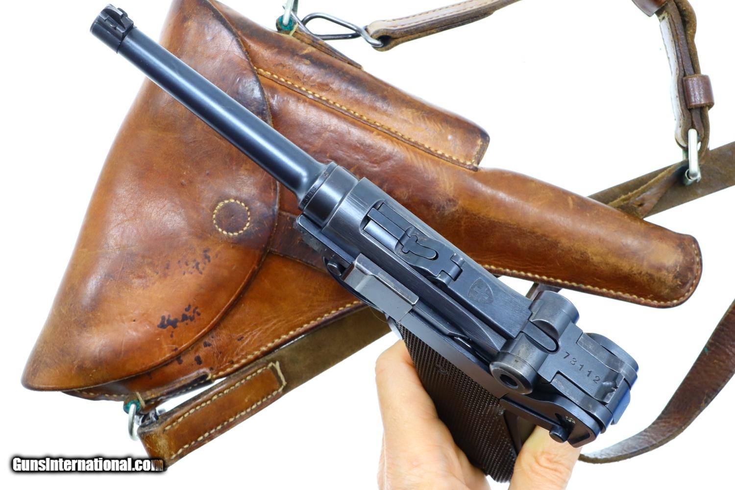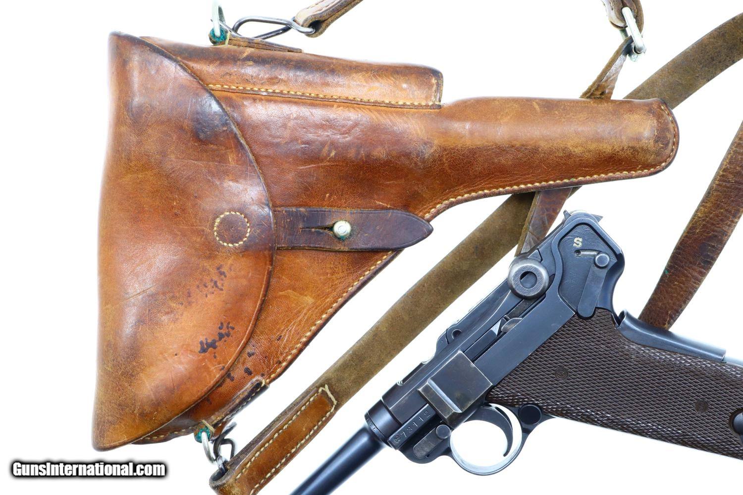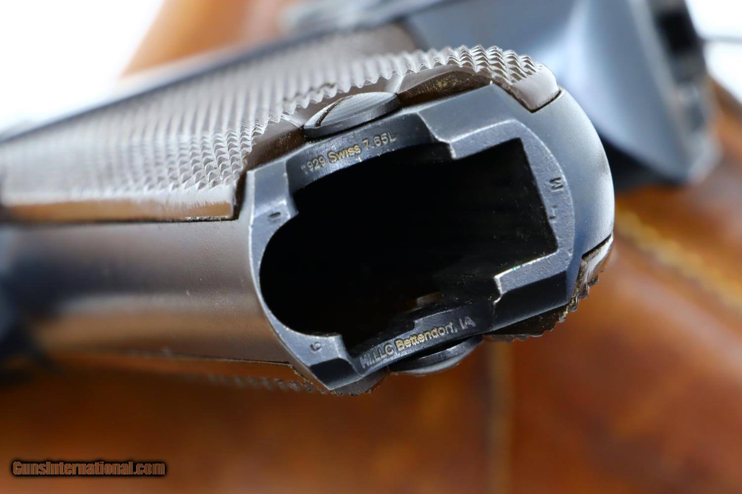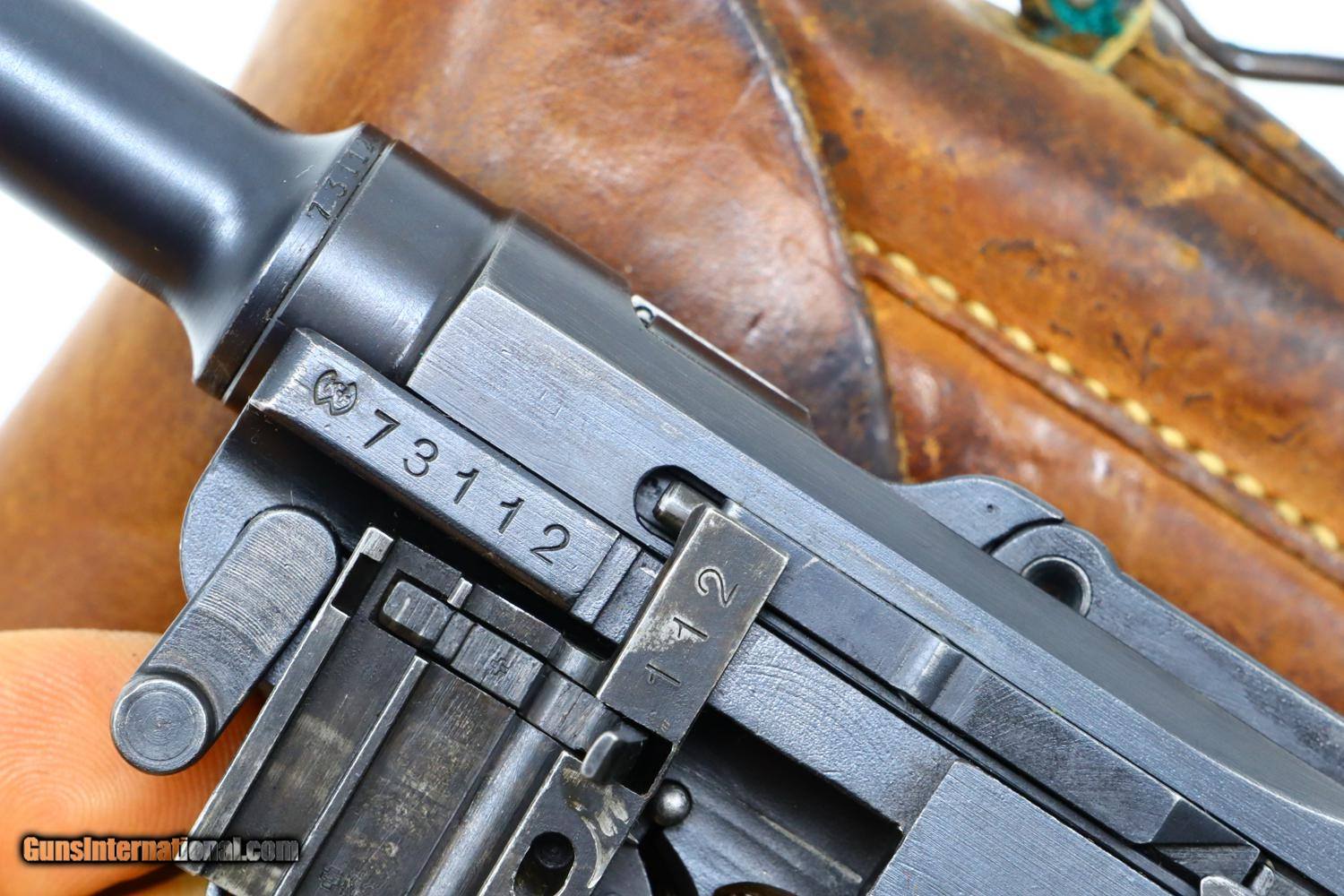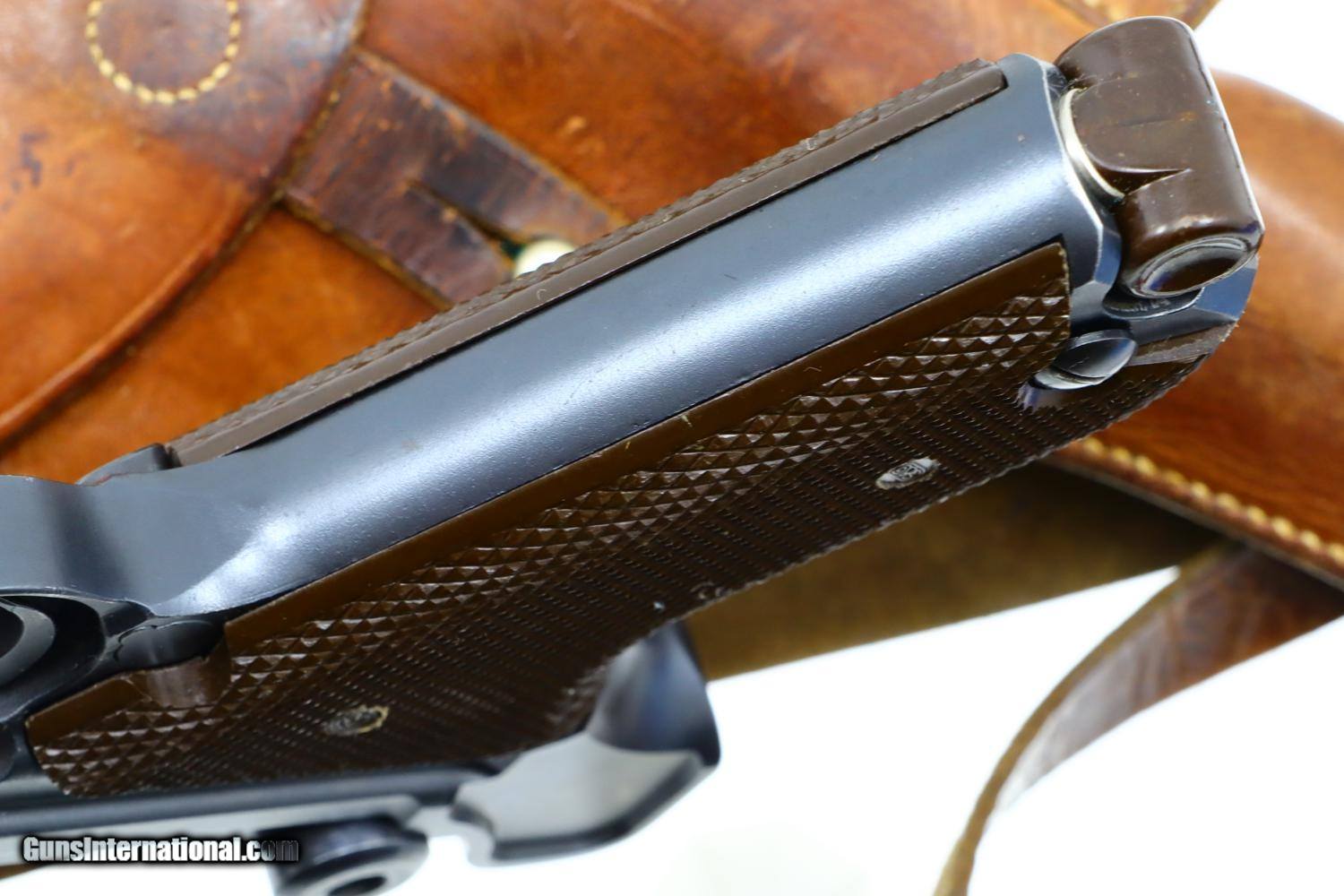 Description: Standard 4.75” barrel with drift adjustable front sight and fixed rear sight. Full matching serial number on barrel, left rail, and rear toggle link with last three digits repeated on sideplate and receiver lug. All small parts with usual inspector markings. Forward frame recess marked "44" reflecting production 1944, month not specified. W/F logo on back of frame. Uniformly checkered chocolate brown plastic grips, each panel molded with an encircled "W/F" logo. Original primary and spare magazine, both with matching colored plugs. Original holster, dated 39, with shoulder strap. Synopsis: Bern, Swiss, 1929 Luger, Military Rig, 73112, I-157 Condition: Near excellent original matte finish with sharp edge wear as photographed. Crisp grips with sharply molded checkering, no discernible losses. Excellent magazines. Mirror bore. Perfect manual mechanics. VG holster and strap. An extremely attractive example of the Swiss M1929 Bern Luger with chocolate brown grips, this example assembled in late WWII. ~~Insured shipping fee of $55; most packages shipped using FedEx 2nd Day.~~ SOLD Curio/Relic: Yes Manufacturer: Bern Serial Number: 73112 Caliber Info: 7.65 Para |
