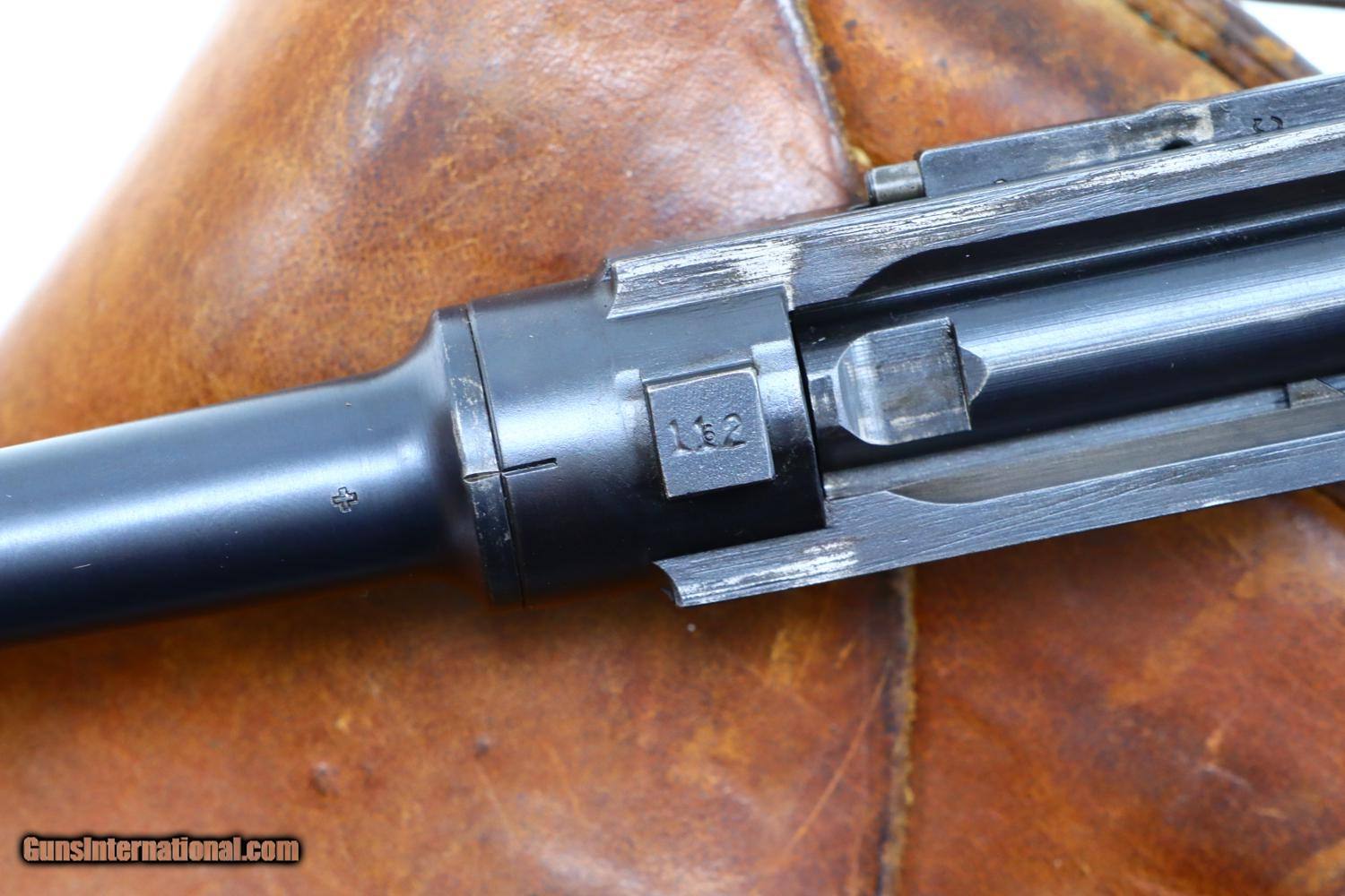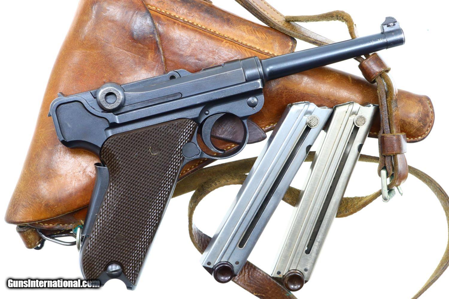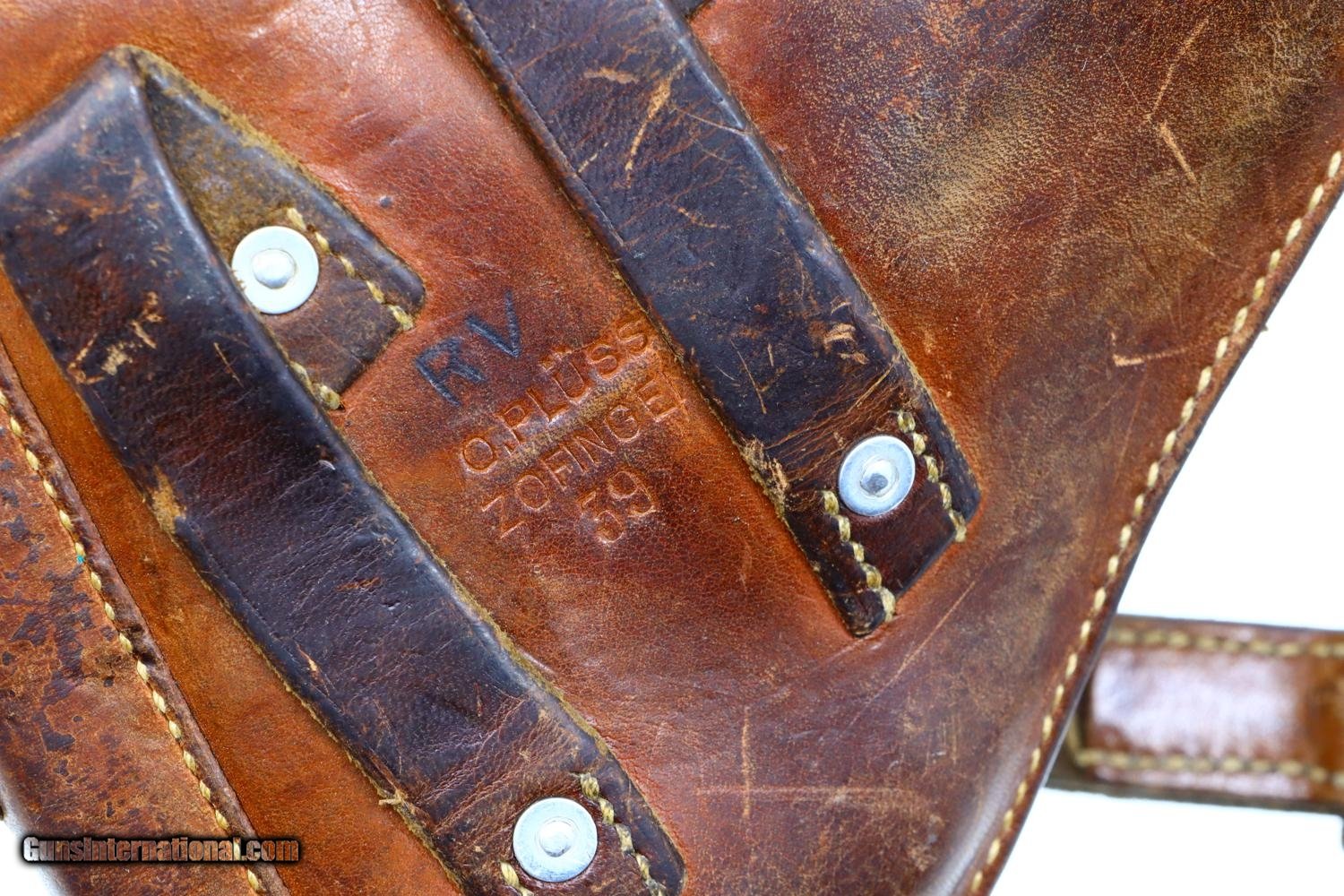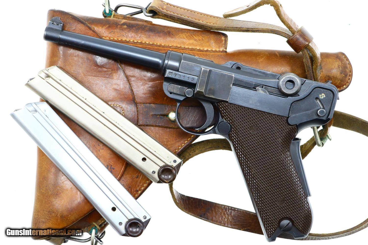 Description: Standard 4.75” barrel with drift adjustable front sight and fixed rear sight. Full matching serial number on barrel, left rail, and rear toggle link with last three digits repeated on sideplate and receiver lug. All small parts with usual inspector markings. Forward frame recess marked "44" reflecting production 1944, month not specified. W/F logo on back of frame. Uniformly checkered chocolate brown plastic grips, each panel molded with an encircled "W/F" logo. Original primary and spare magazine, both with matching colored plugs. Original holster, dated 39, with shoulder strap. Synopsis: Bern, Swiss, 1929 Luger, Military Rig, 73112, I-157 Condition: Near excellent original matte finish with sharp edge wear as photographed. Crisp grips with sharply molded checkering, no discernible losses. Excellent magazines. Mirror bore. Perfect manual mechanics. VG holster and strap. An extremely attractive example of the Swiss M1929 Bern Luger with chocolate brown grips, this example assembled in late WWII. ~~Insured shipping fee of $55; most packages shipped using FedEx 2nd Day.~~ SOLD Curio/Relic: Yes Manufacturer: Bern Serial Number: 73112 Caliber Info: 7.65 Para |