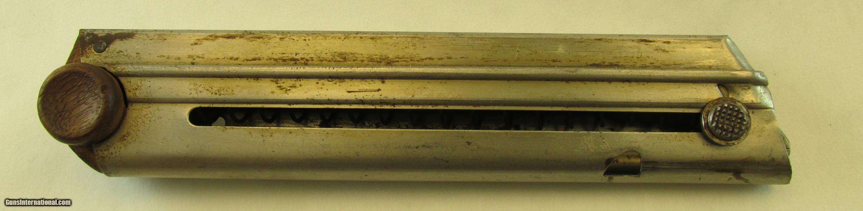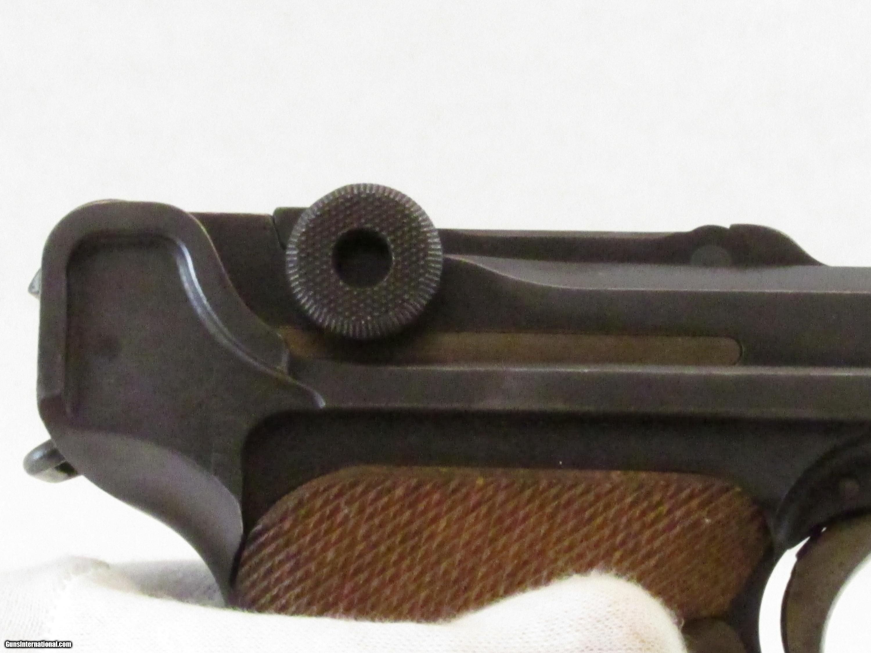 Description: A very attractive artillery Luger. One of the iconic German handguns of WWI. Manufactured by DWM in 1918. Matching numbers,except magazine. Nice original grips. Excellent bore, bright no frosting or pitting. 85% straw color on trigger and small parts. 90% original blue. Small rough place on outside of barrel. .Artillery Lugers have long been one of the most desirable WWI handguns. Honest original examples like this continue to increase in value. Will make a great addition to any collection. SOLD Curio/Relic: Yes Manufacturer: DWM Model: Artillery Caliber Info: 9mm para Condition: excellent Metal Condition: 90% Wood Condition: very good Bore Condition: Excellent Finish: Blue Sights: Tangent Manufacture Date: 1918 Proof:Nitro: Imperial German Military |