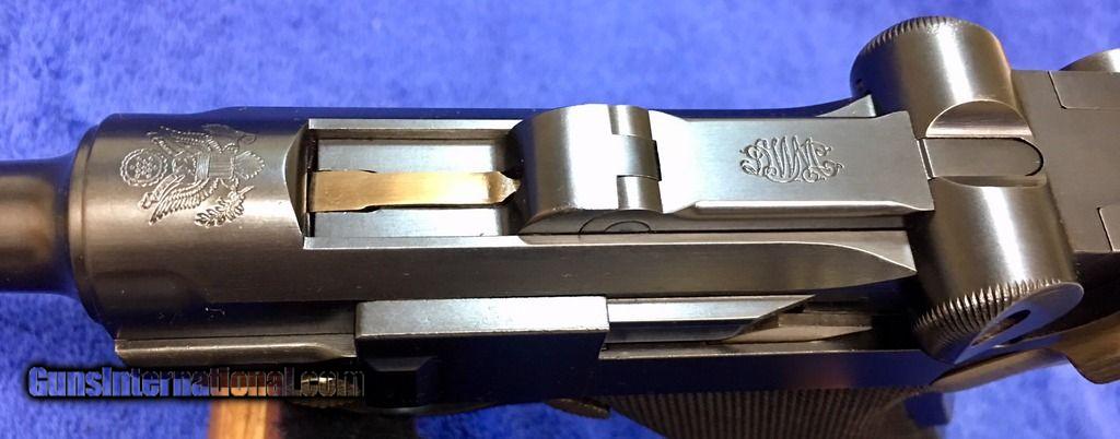Description: Classic DWM 1900 American Eagle 30 Luger in exceptional condition complete with two plain (correct) wood bottom magazines and original style fitted wood case. This historic firearm was meticulously refinished to it's original glory a few years back by one of the foremost restoration experts in the Luger gun smith community. The early dished toggle design is considered by many to be the most elegant looking model of the very early pistols by virtue of it's slightly longer and more slender barrel chambered in the original 30 Luger caliber. The rich rust blue finish provides the ideal background to showcase the delicately strawed small parts that adorn the sides and top of the pistol. This handsome example is of course all matching on the numbered parts including both back sides of the original and near perfect walnut grips. The excellent shiny bore is commensurate with the overall extra fine condition of this iconic firearm. Additional photos available. This item is subject to prior sale as it is offered on several venues. Insured ground shipping fifty dollars. **SALE PENDING** - SOLD Curio/Relic: Yes |