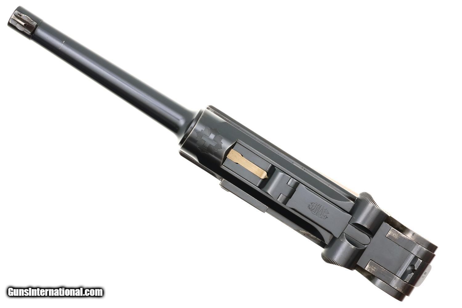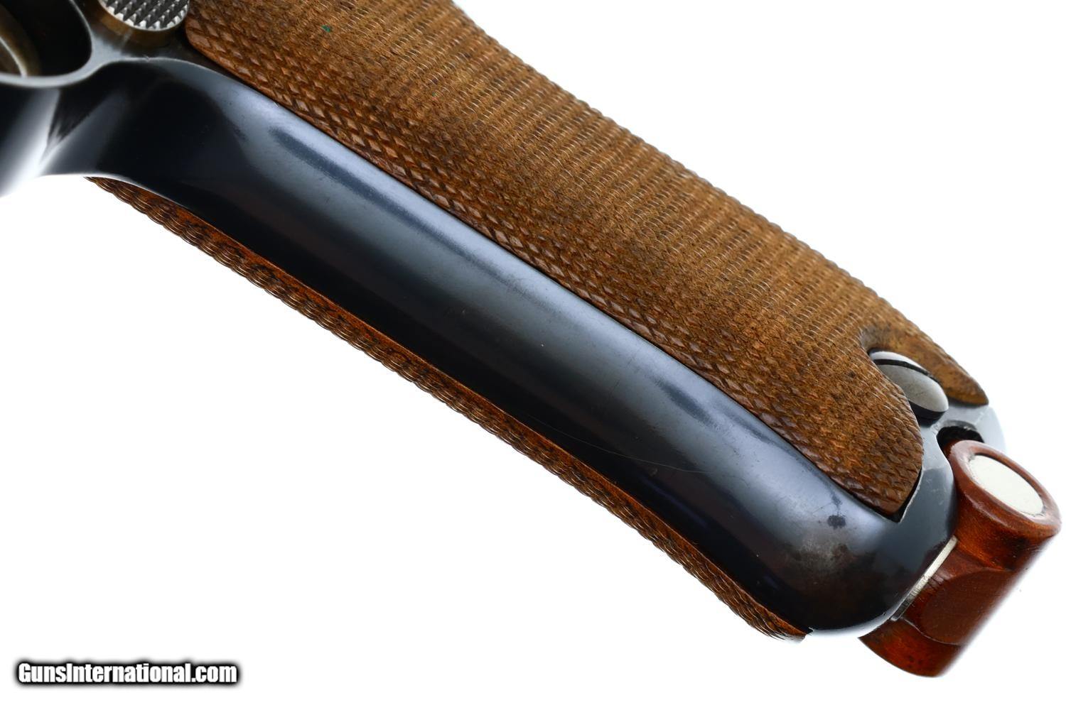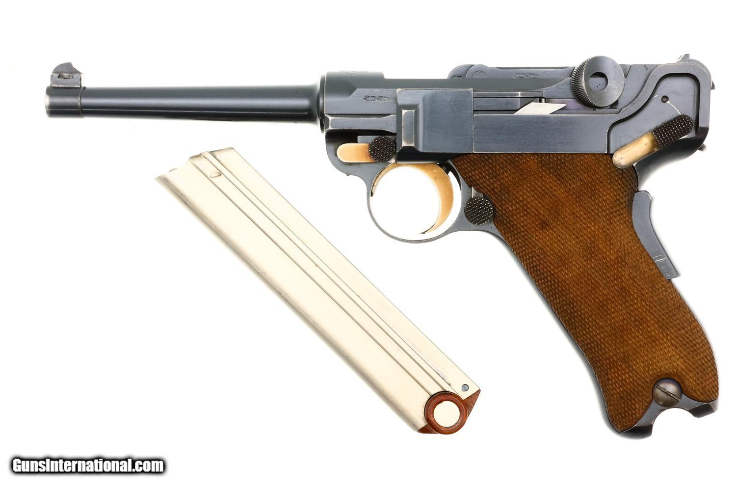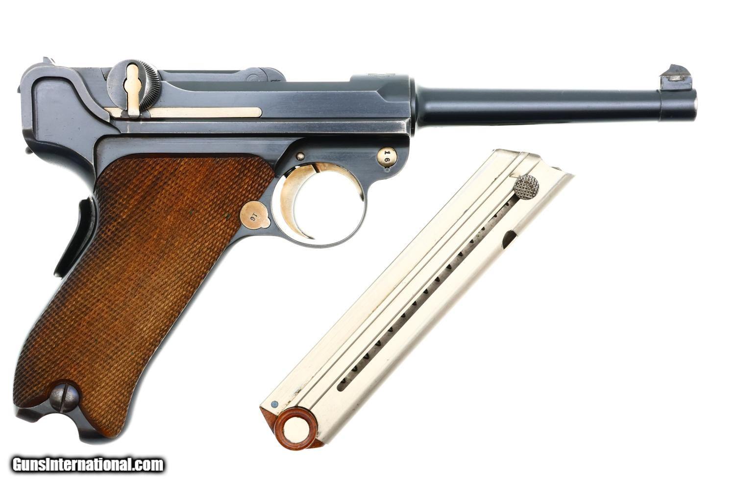 Bright 98% bright original rust blue with minimal sharp edge wear in the usual locations to include the muzzle, tips of the rails, and hump of the sideplate. Comparable condition strawed parts. Grips with sharp checkering and light oil staining. Excellent plus magazine with the plug pin showing no disturbance. Mirror bright bore. Correct manual mechanics. A wonderful early 1900 Swiss Commercial Luger made by DWM with all of the earliest features, much, much scarcer than the usual military model familiar to most collectors.