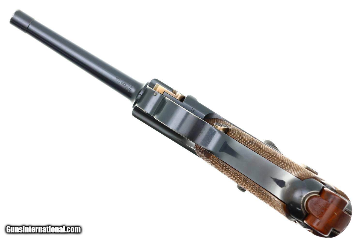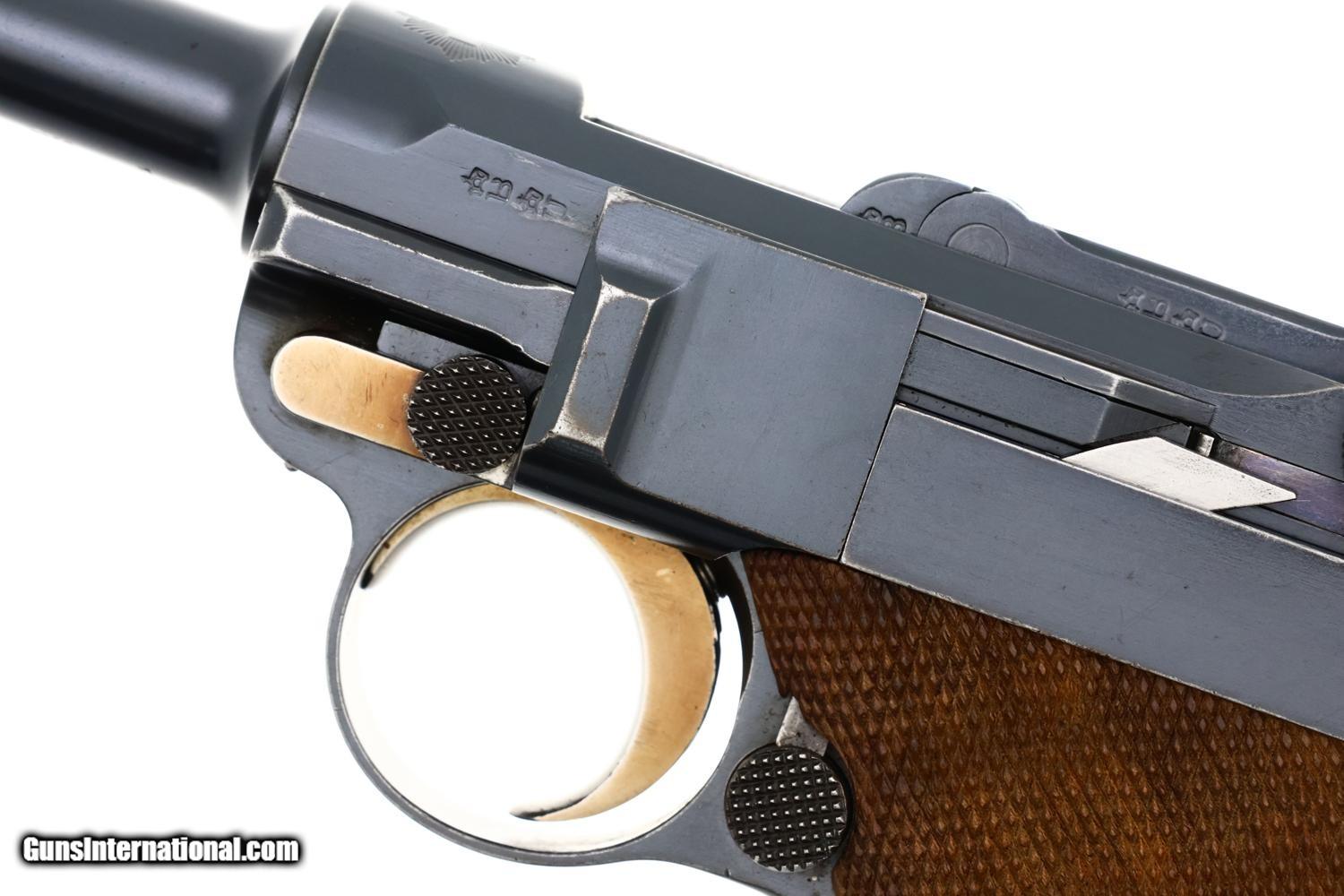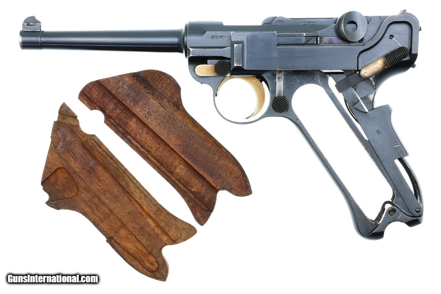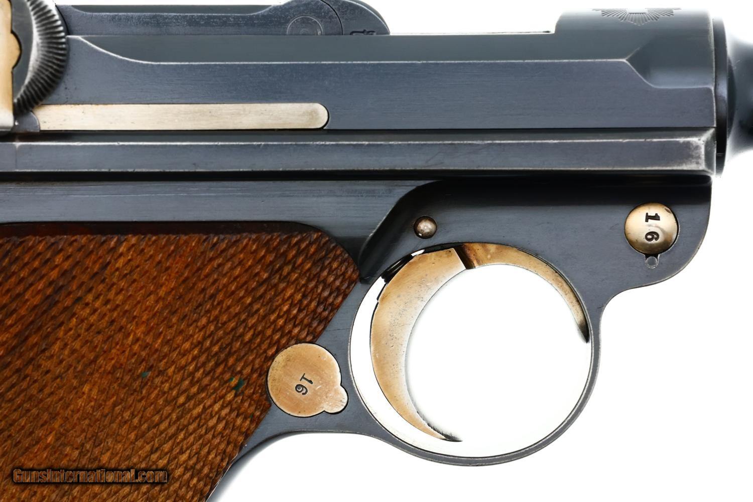 Bright 98% bright original rust blue with minimal sharp edge wear in the usual locations to include the muzzle, tips of the rails, and hump of the sideplate. Comparable condition strawed parts. Grips with sharp checkering and light oil staining. Excellent plus magazine with the plug pin showing no disturbance. Mirror bright bore. Correct manual mechanics. A wonderful early 1900 Swiss Commercial Luger made by DWM with all of the earliest features, much, much scarcer than the usual military model familiar to most collectors.