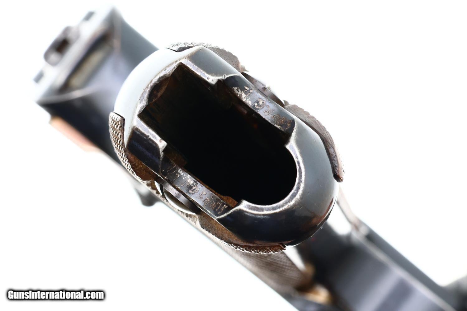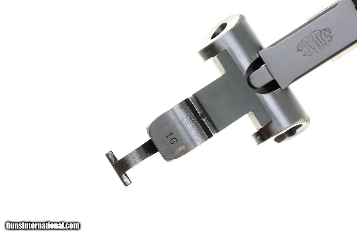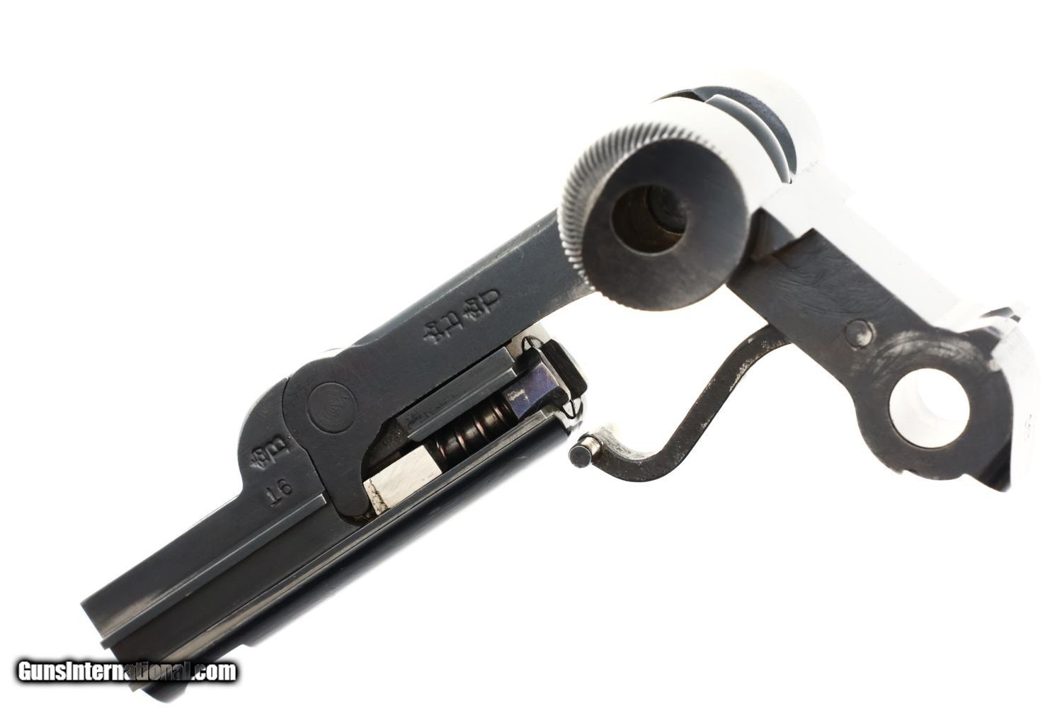 Description: Synopsis: The Model 1900 represents the first production model Parabellum pistol, this example made by DWM with a Swiss sunburst chamber, was one of the earliest, in high original condition, with unaltered features, desirable BUG proofs, and correct flat button magazine. Much, much scarcer than the usually encountered military version, a real find for the advanced or historically focused collector! Description: Exceedingly scarce DWM Model 1900 Swiss Commercial Luger pistol, cal 7.65 Para (.30 Luger), SN 916, in high original condition and original configuration with non-relieved frame. Unlike the vast majority of these Lugers that were earmarked for the Swiss military, this is a Commercial model with "BUG" proofs under the barrel and on the left side of the breechblock and front toggle link. It is otherwise a classic 1900 toggle action mechanism with Swiss sunburst on chamber, 4.75" bbl, drift adjustable front sight and V-notch rear sight. SN "916" on frame with matching parts numbered "16" on all the usual parts to include the trigger, front toggle link, rear toggle link, grip safety, and each of the grips. Complete with tin-plated magazine with early flat checkered button and wooden plug with disc inserts. Condition: Bright 98% bright original rust blue with minimal sharp edge wear in the usual locations to include the muzzle, tips of the rails, and hump of the sideplate. Comparable condition strawed parts. Grips with sharp checkering and light oil staining. Excellent plus magazine with the plug pin showing no disturbance. Mirror bright bore. Correct manual mechanics. A wonderful early 1900 Swiss Commercial Luger made by DWM with all of the earliest features, much, much scarcer than the usual military model familiar to most collectors. Manufacturer: DWM Model: 1900 Swiss Commercial Luger Serial Number: 916 Caliber Info: .30 Luger Condition: EXC Price: $8,995.00 Contact Seller |