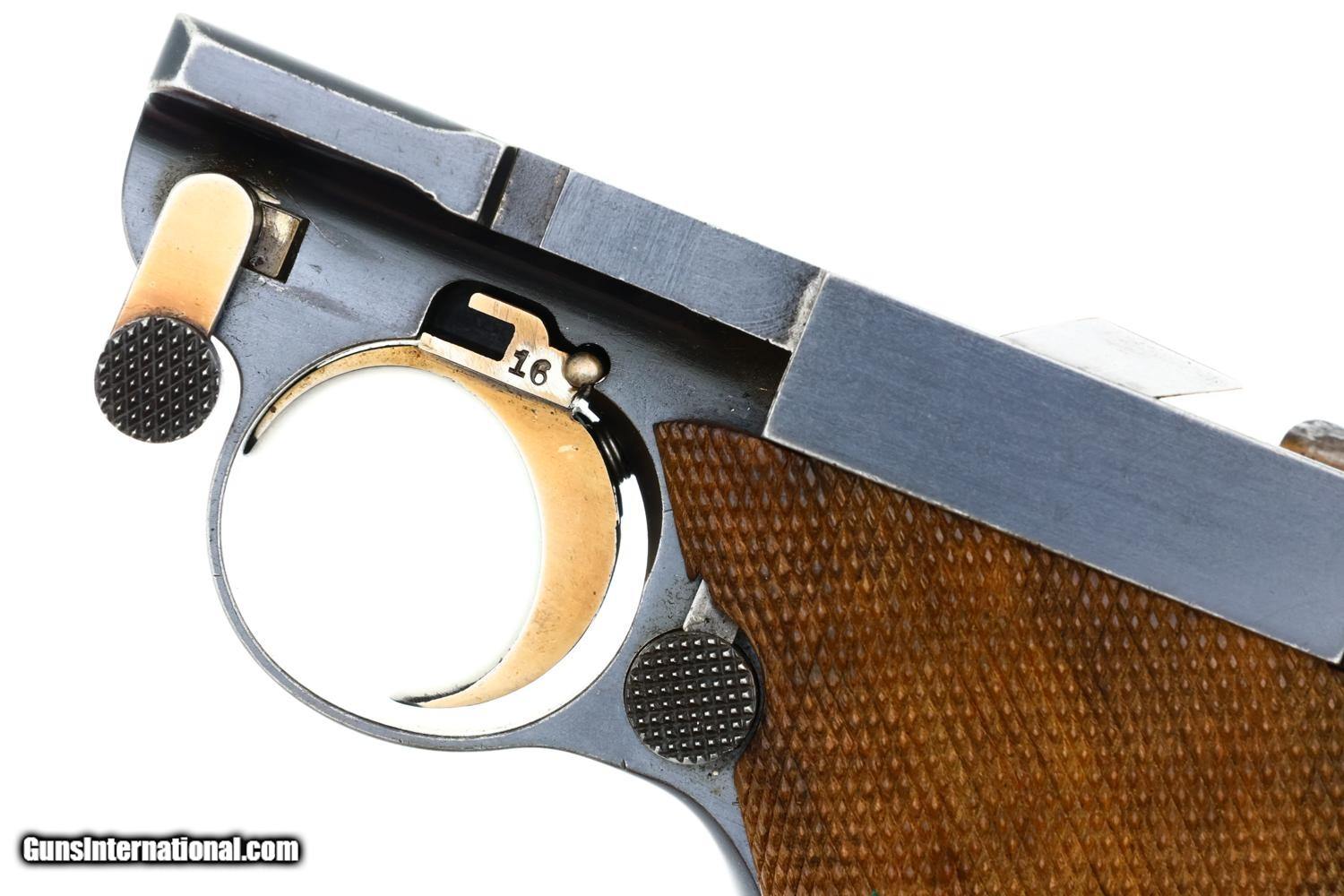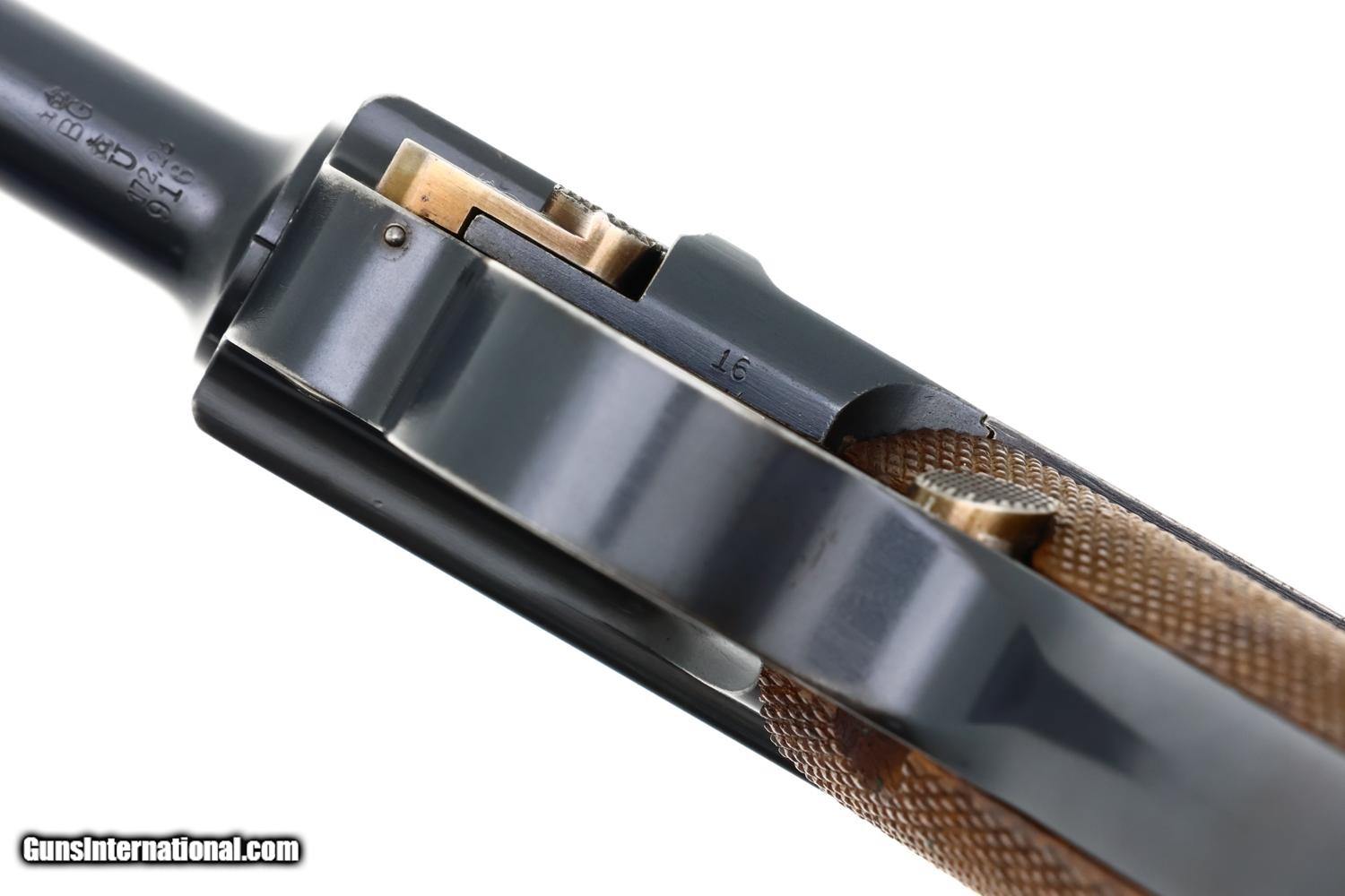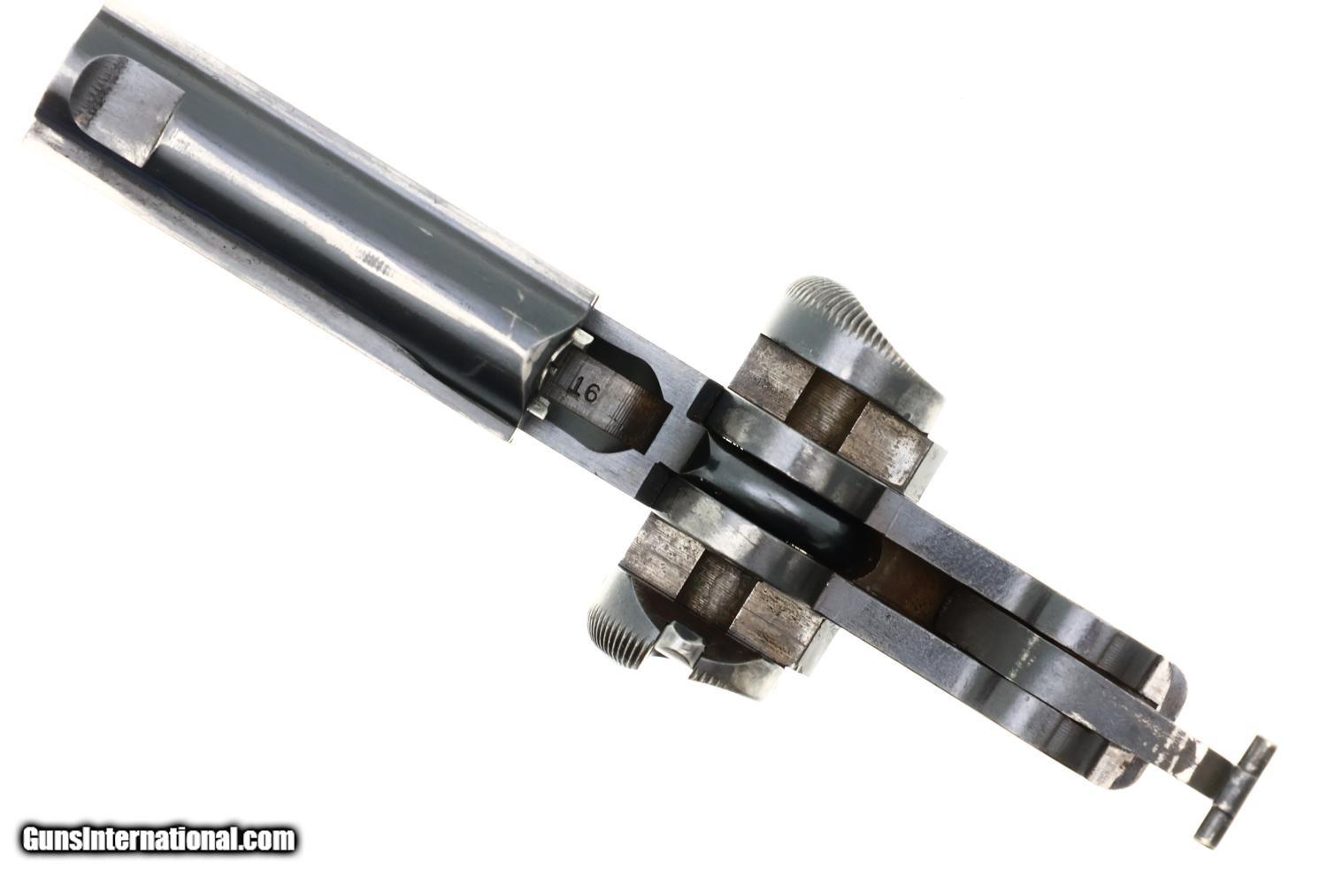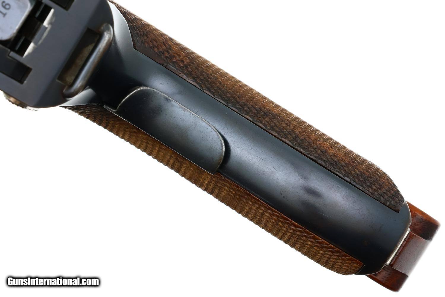 Description: Synopsis: The Model 1900 represents the first production model Parabellum pistol, this example made by DWM with a Swiss sunburst chamber, was one of the earliest, in high original condition, with unaltered features, desirable BUG proofs, and correct flat button magazine. Much, much scarcer than the usually encountered military version, a real find for the advanced or historically focused collector! Description: Exceedingly scarce DWM Model 1900 Swiss Commercial Luger pistol, cal 7.65 Para (.30 Luger), SN 916, in high original condition and original configuration with non-relieved frame. Unlike the vast majority of these Lugers that were earmarked for the Swiss military, this is a Commercial model with "BUG" proofs under the barrel and on the left side of the breechblock and front toggle link. It is otherwise a classic 1900 toggle action mechanism with Swiss sunburst on chamber, 4.75" bbl, drift adjustable front sight and V-notch rear sight. SN "916" on frame with matching parts numbered "16" on all the usual parts to include the trigger, front toggle link, rear toggle link, grip safety, and each of the grips. Complete with tin-plated magazine with early flat checkered button and wooden plug with disc inserts. Condition: Bright 98% bright original rust blue with minimal sharp edge wear in the usual locations to include the muzzle, tips of the rails, and hump of the sideplate. Comparable condition strawed parts. Grips with sharp checkering and light oil staining. Excellent plus magazine with the plug pin showing no disturbance. Mirror bright bore. Correct manual mechanics. A wonderful early 1900 Swiss Commercial Luger made by DWM with all of the earliest features, much, much scarcer than the usual military model familiar to most collectors. Manufacturer: DWM Model: 1900 Swiss Commercial Luger Serial Number: 916 Caliber Info: .30 Luger Condition: EXC Price: $8,995.00 Contact Seller |