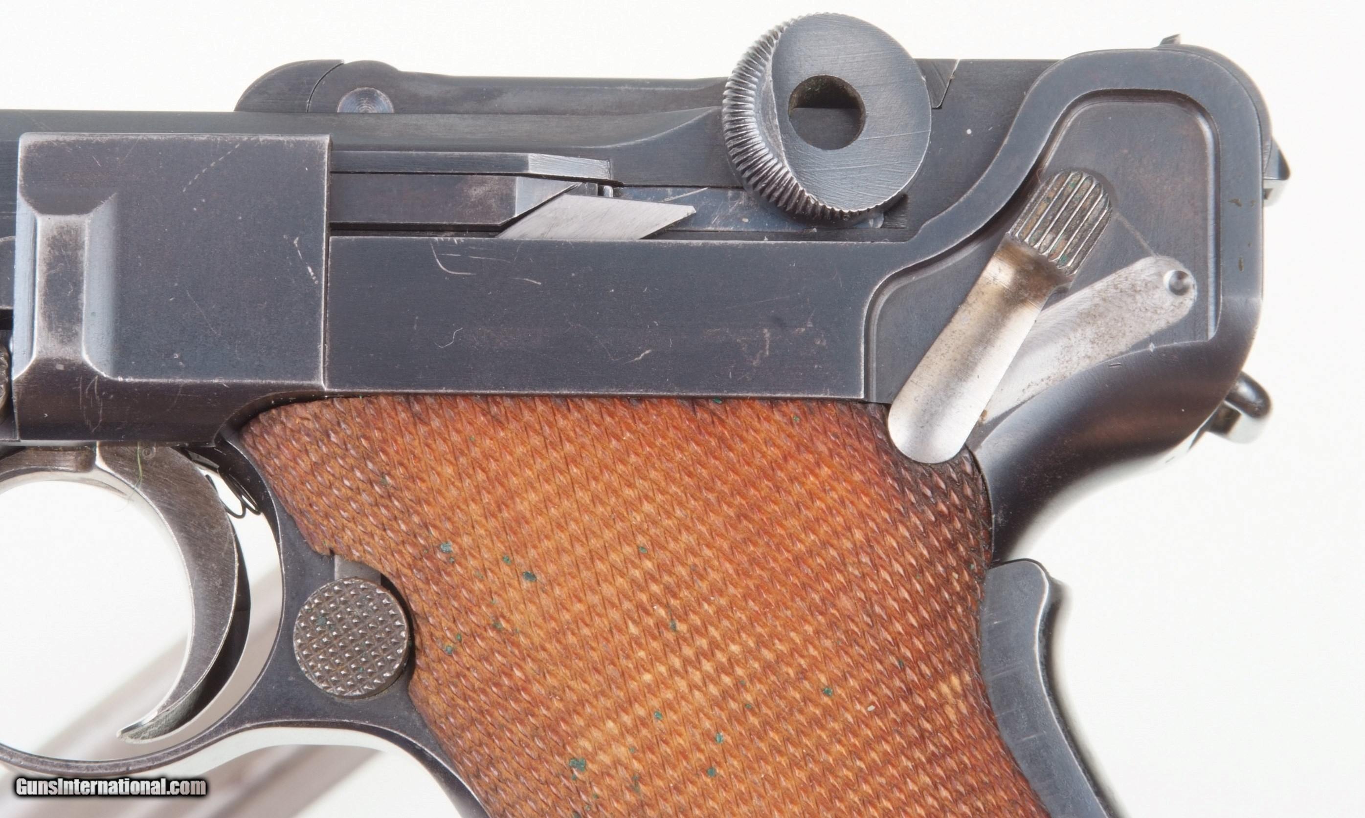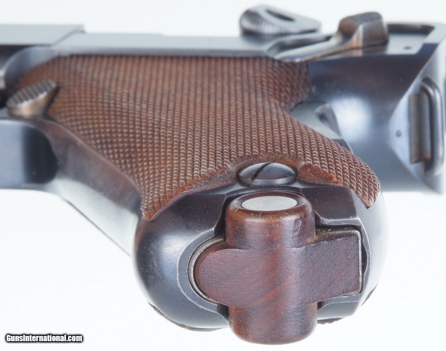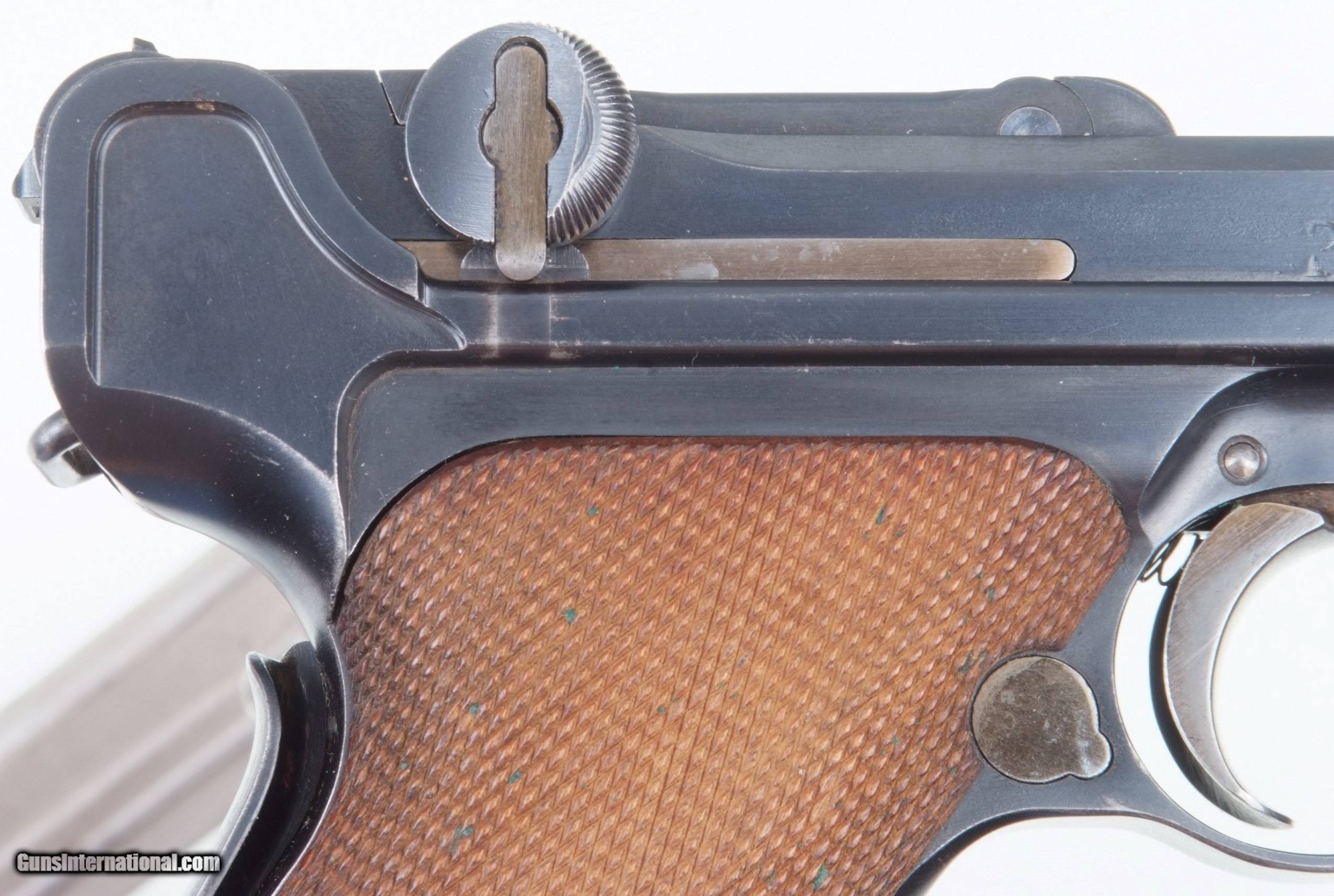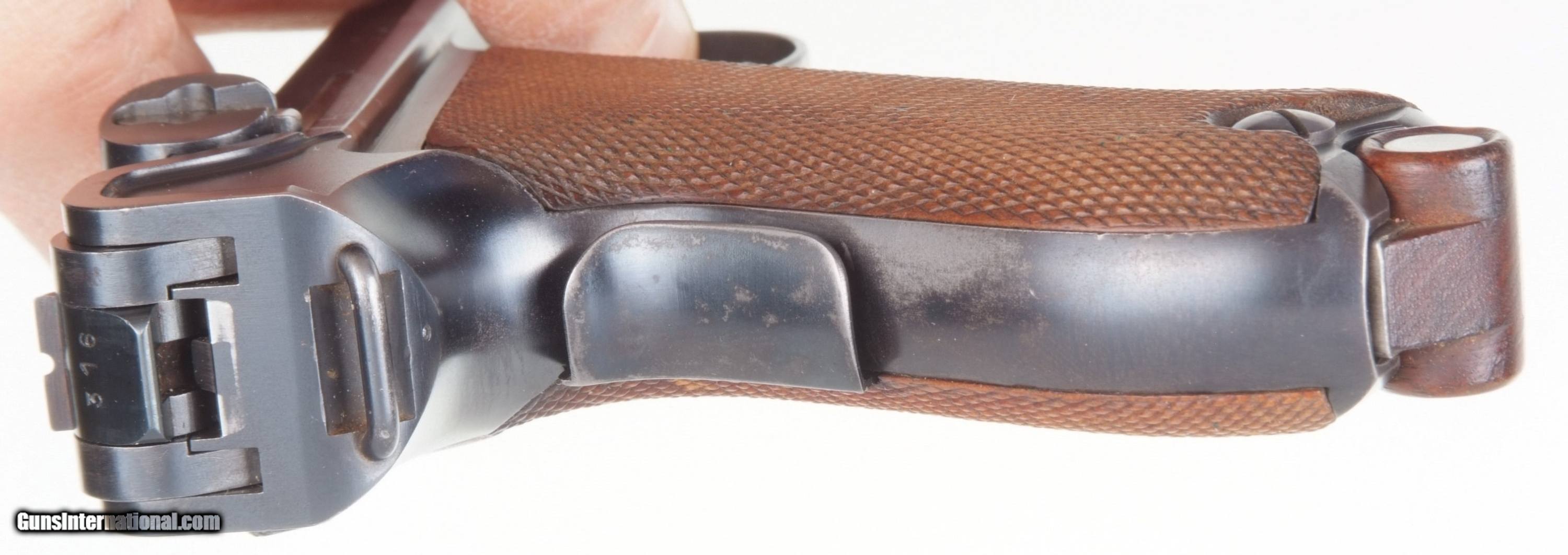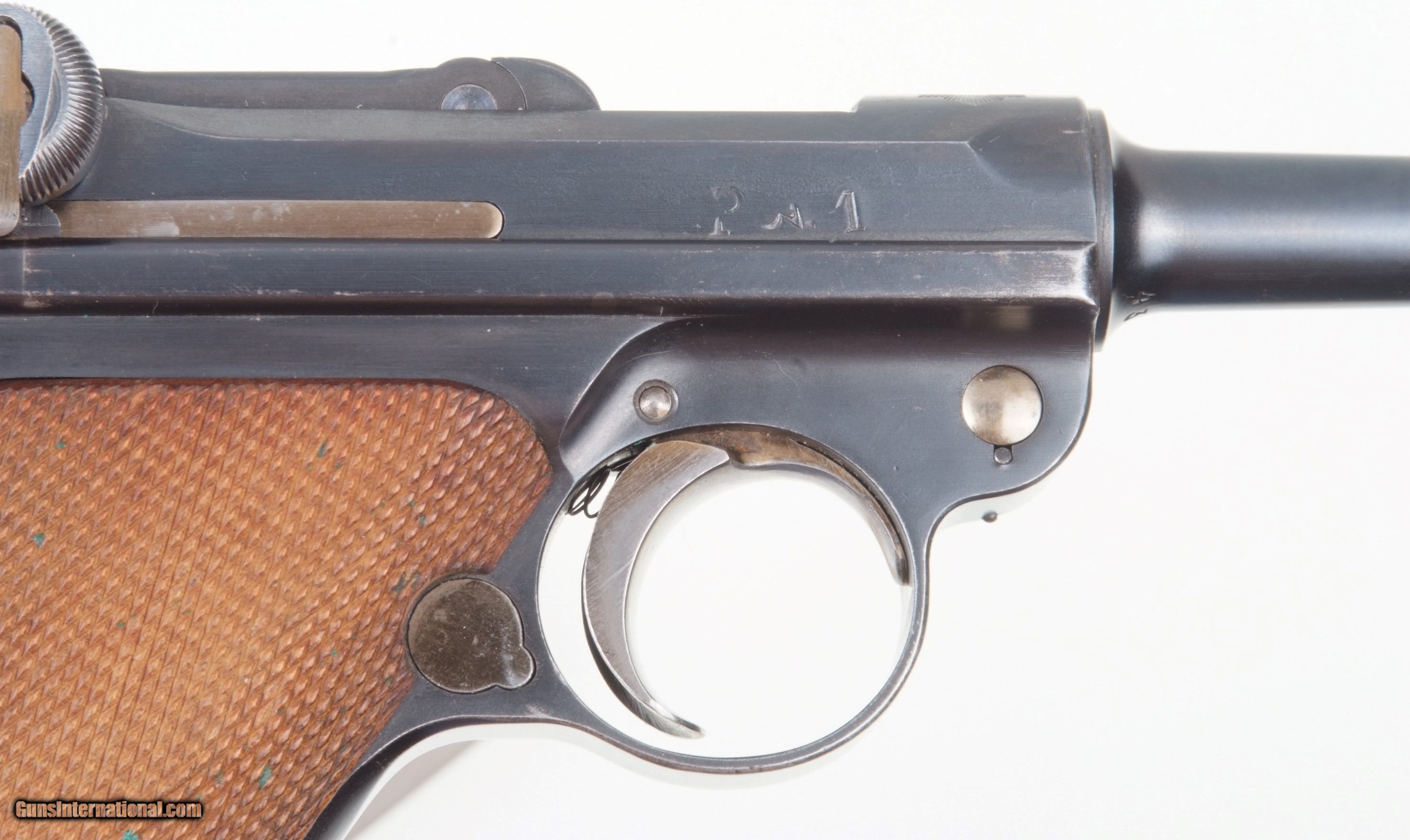 Description: Standard configuration with 4.75” tapered barrel having drift adjustable fire blued front sight and fixed rear sight, modified with “U” notch. Flat top breech block, with toggle train having dished ears and anti-rebound lock. Chamber marked with cross in sunburst. Intertwined DWM on middle toggle link. Small Swiss proofs on left side of barrel and left receiver. Right receiver with “P” release and “31” with lazy three. Full serial number under barrel and forward frame. All small parts correctly matched with the last two or three digits of the serial number. Usual strawed small parts. Finely checkered walnut grips, both panels matching with last three digits. Correct original magazine, unmarked, with base having inserted disks. Synopsis: Nice M1900 Swiss Luger, Military, all matching with wide trigger and correct magazine. Condition: At least 95% bright original rust blue with most of the wear on the front and backstraps. Comparable condition small parts with no suggestion of the straw having been freshened. Bright mirror bore. Perfect manual mechanics. A very desirable Swiss Military Luger, particularly when all matching and with the wide trigger. A HISTORIC INVESTMENT! ~~Insured shipping fee of $75; most packages shipped using FedEx 2nd Day.~~ SOLD Manufacturer: DWM Serial Number: 4316 Caliber Info: .30 Luger |