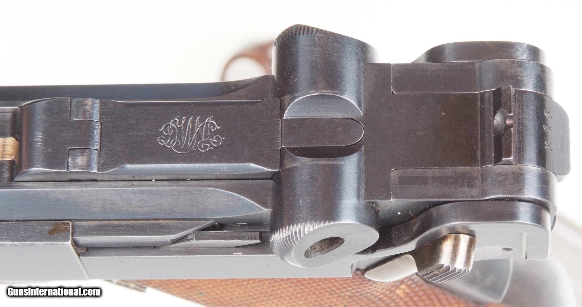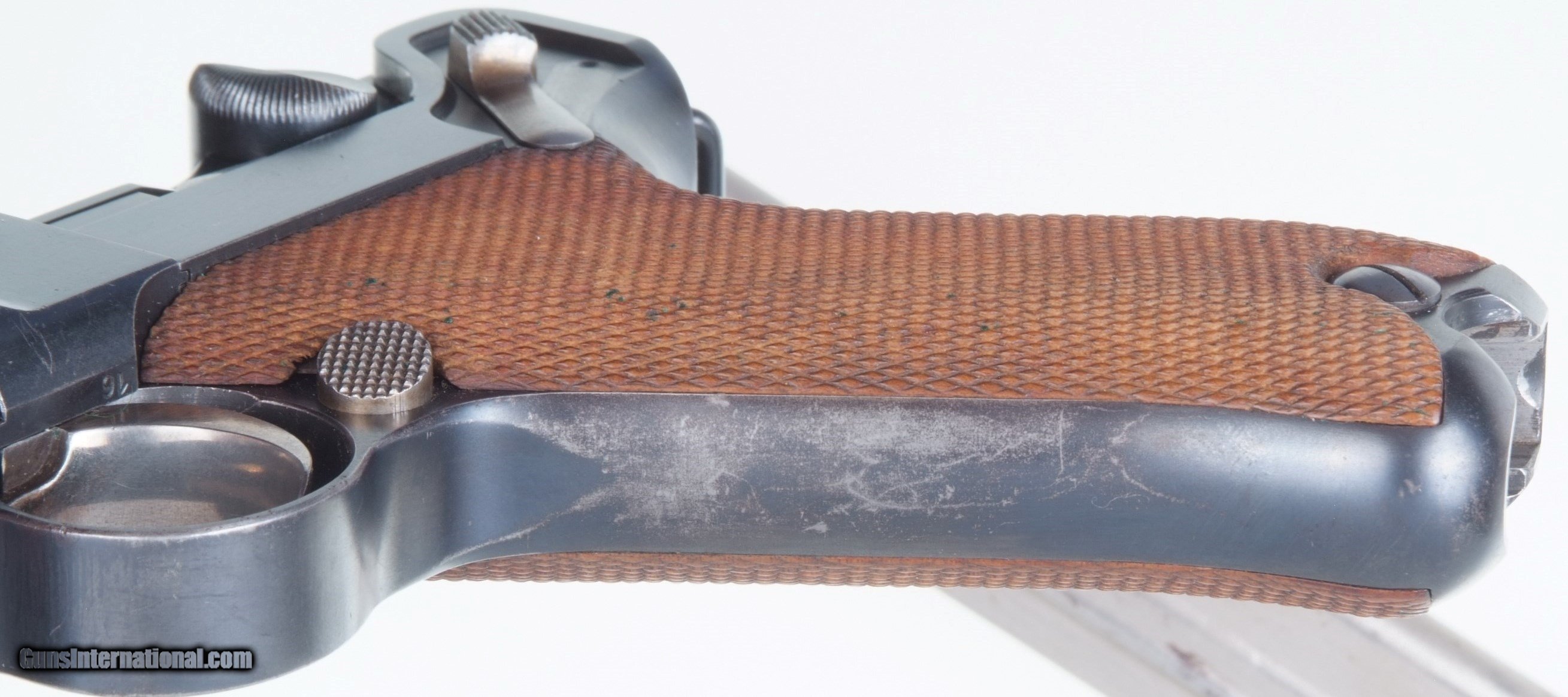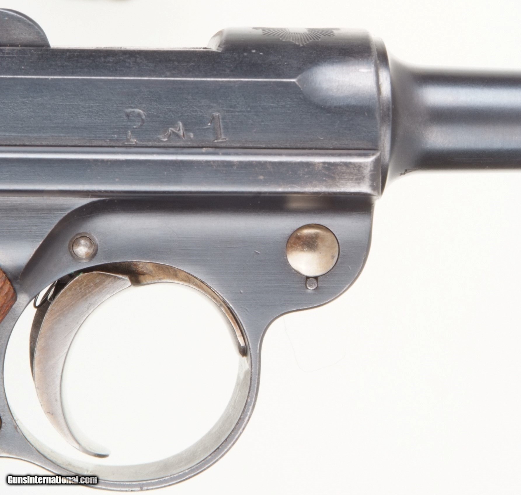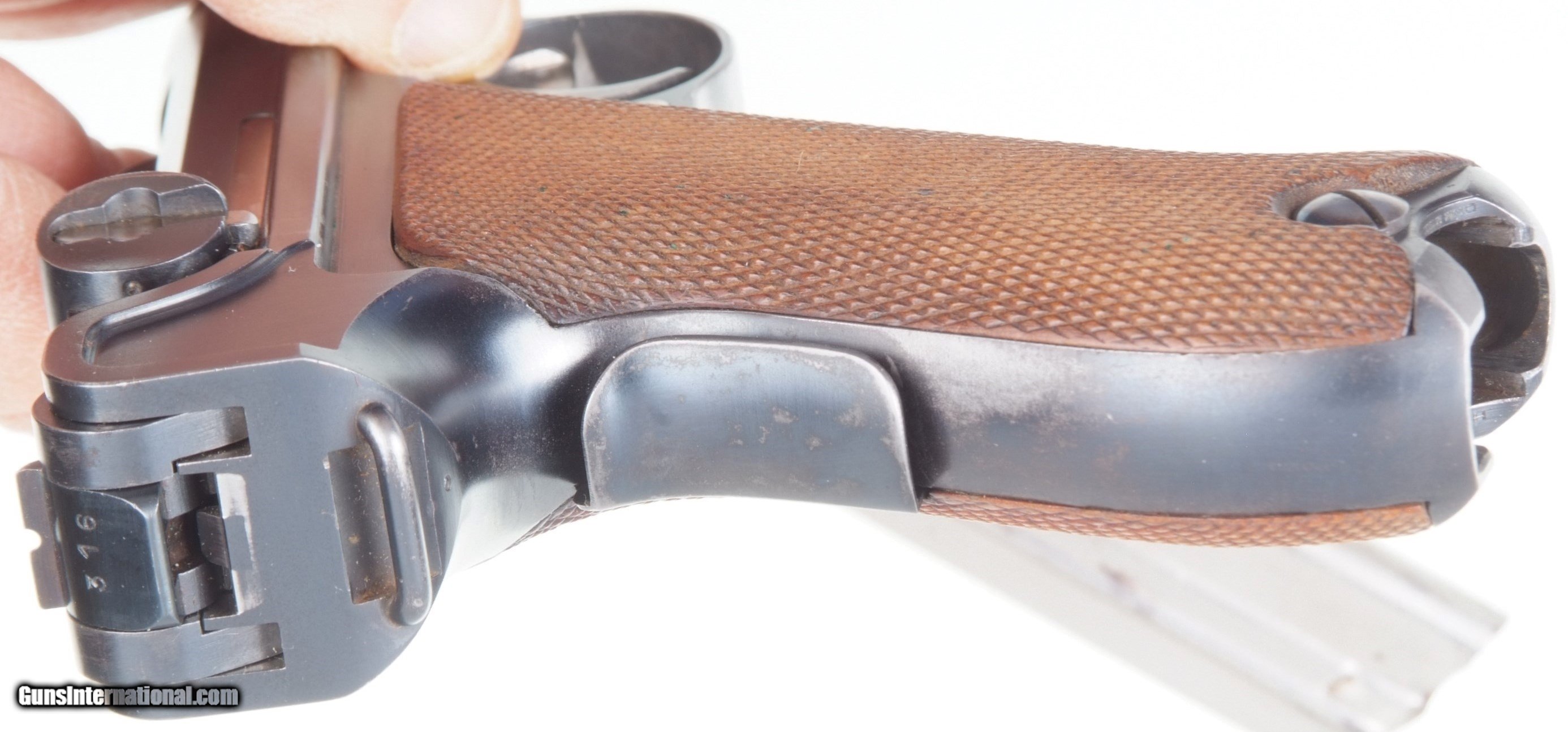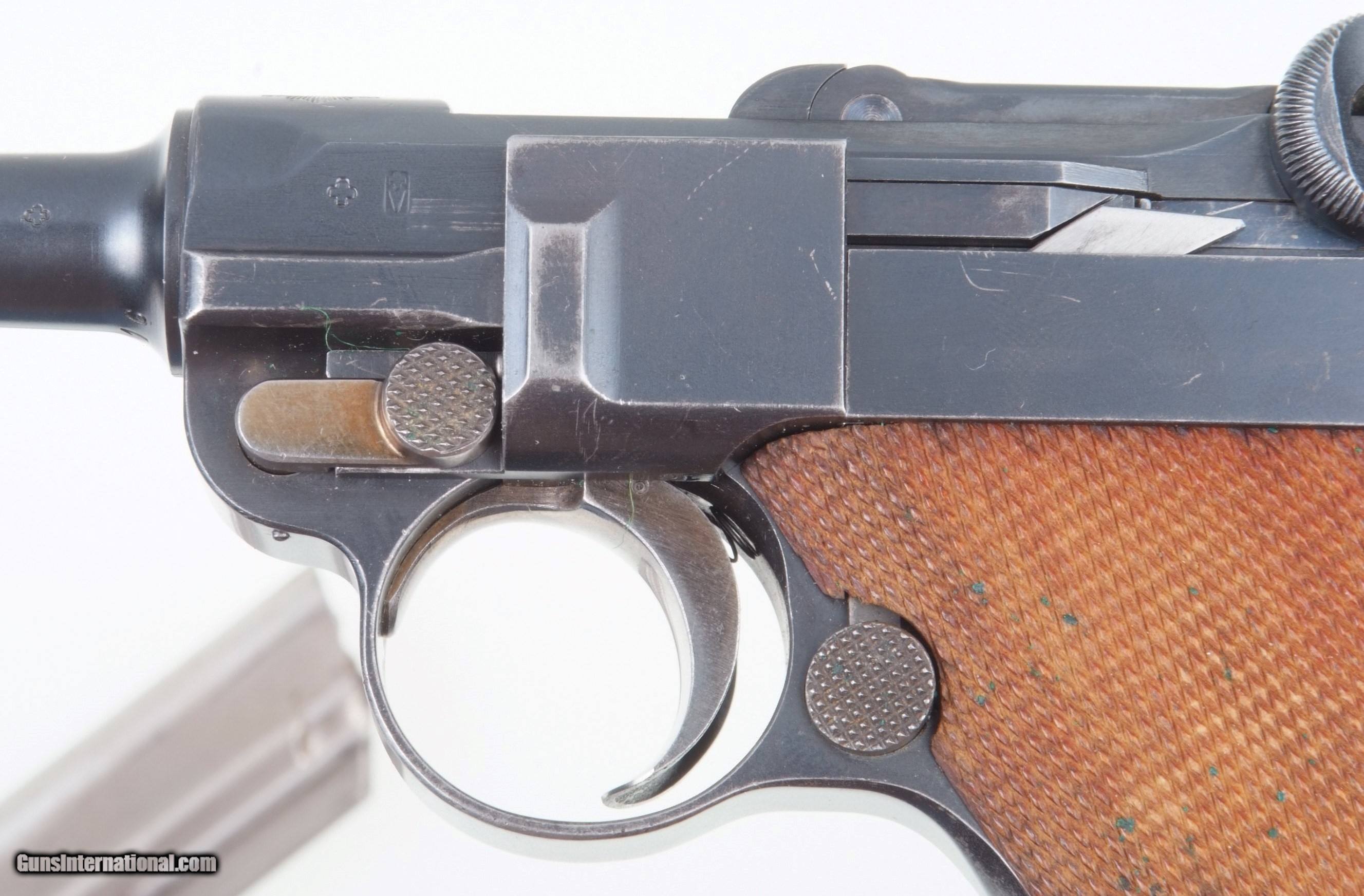 Description: Standard configuration with 4.75” tapered barrel having drift adjustable fire blued front sight and fixed rear sight, modified with “U” notch. Flat top breech block, with toggle train having dished ears and anti-rebound lock. Chamber marked with cross in sunburst. Intertwined DWM on middle toggle link. Small Swiss proofs on left side of barrel and left receiver. Right receiver with “P” release and “31” with lazy three. Full serial number under barrel and forward frame. All small parts correctly matched with the last two or three digits of the serial number. Usual strawed small parts. Finely checkered walnut grips, both panels matching with last three digits. Correct original magazine, unmarked, with base having inserted disks. Synopsis: Nice M1900 Swiss Luger, Military, all matching with wide trigger and correct magazine. Condition: At least 95% bright original rust blue with most of the wear on the front and backstraps. Comparable condition small parts with no suggestion of the straw having been freshened. Bright mirror bore. Perfect manual mechanics. A very desirable Swiss Military Luger, particularly when all matching and with the wide trigger. A HISTORIC INVESTMENT! ~~Insured shipping fee of $75; most packages shipped using FedEx 2nd Day.~~ SOLD Manufacturer: DWM Serial Number: 4316 Caliber Info: .30 Luger |