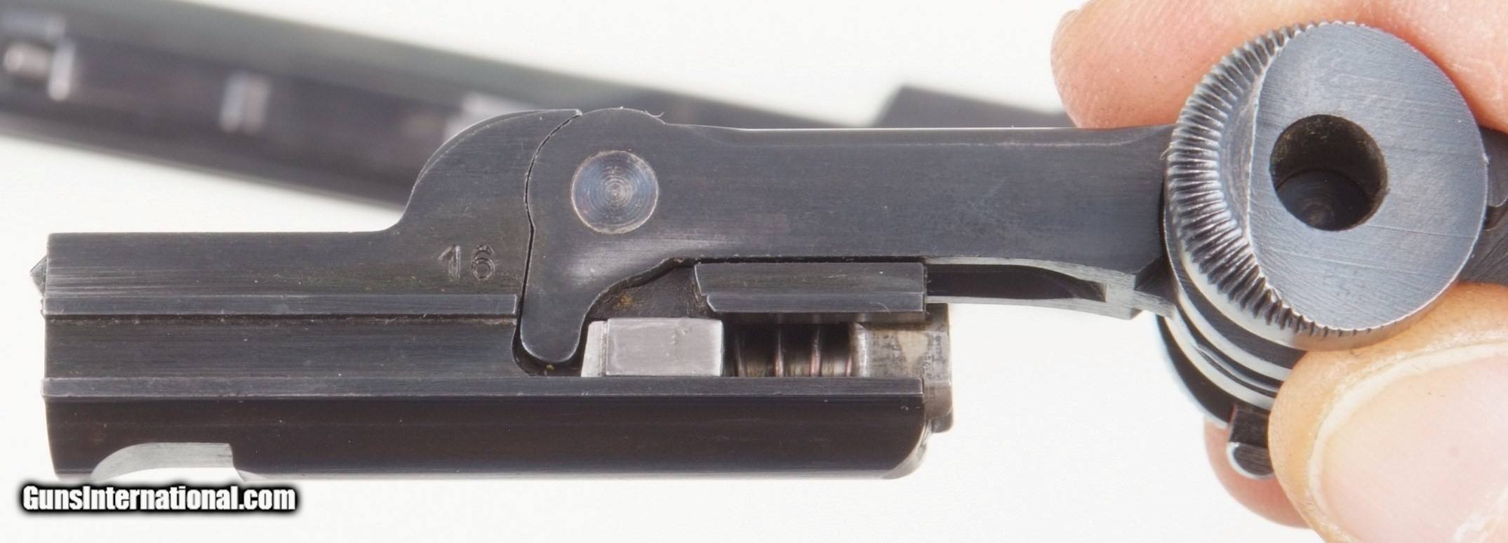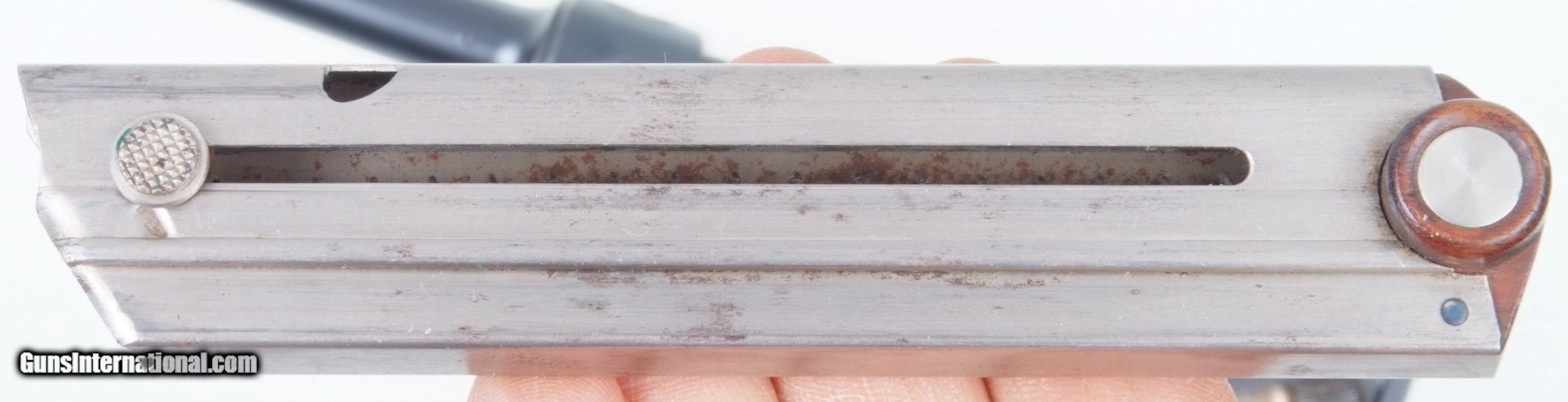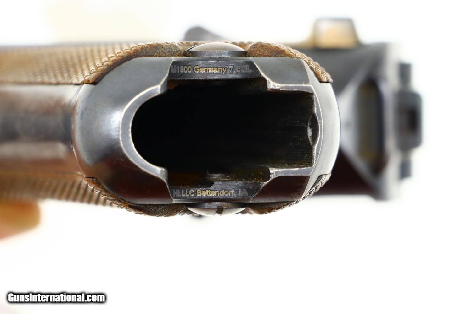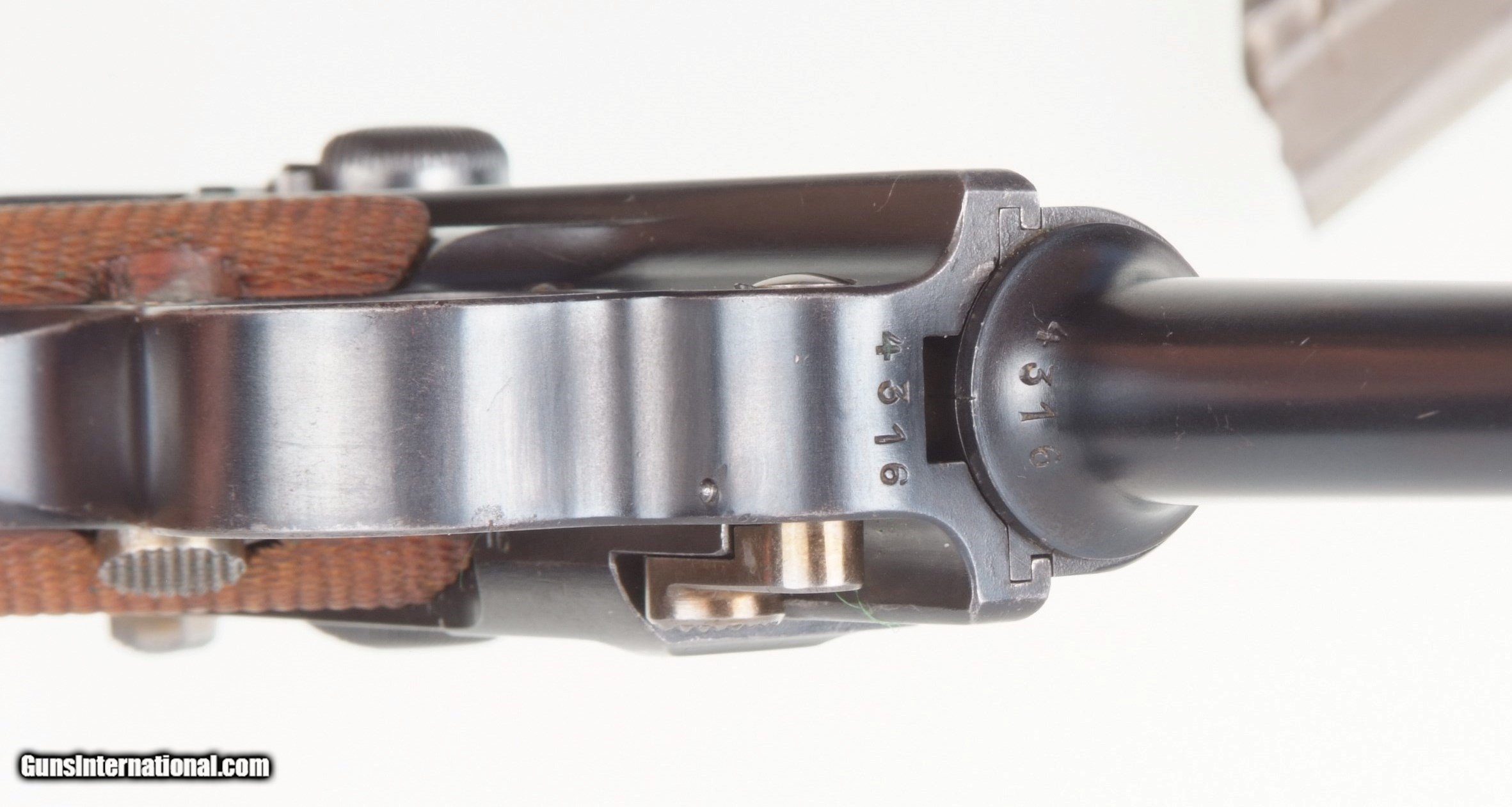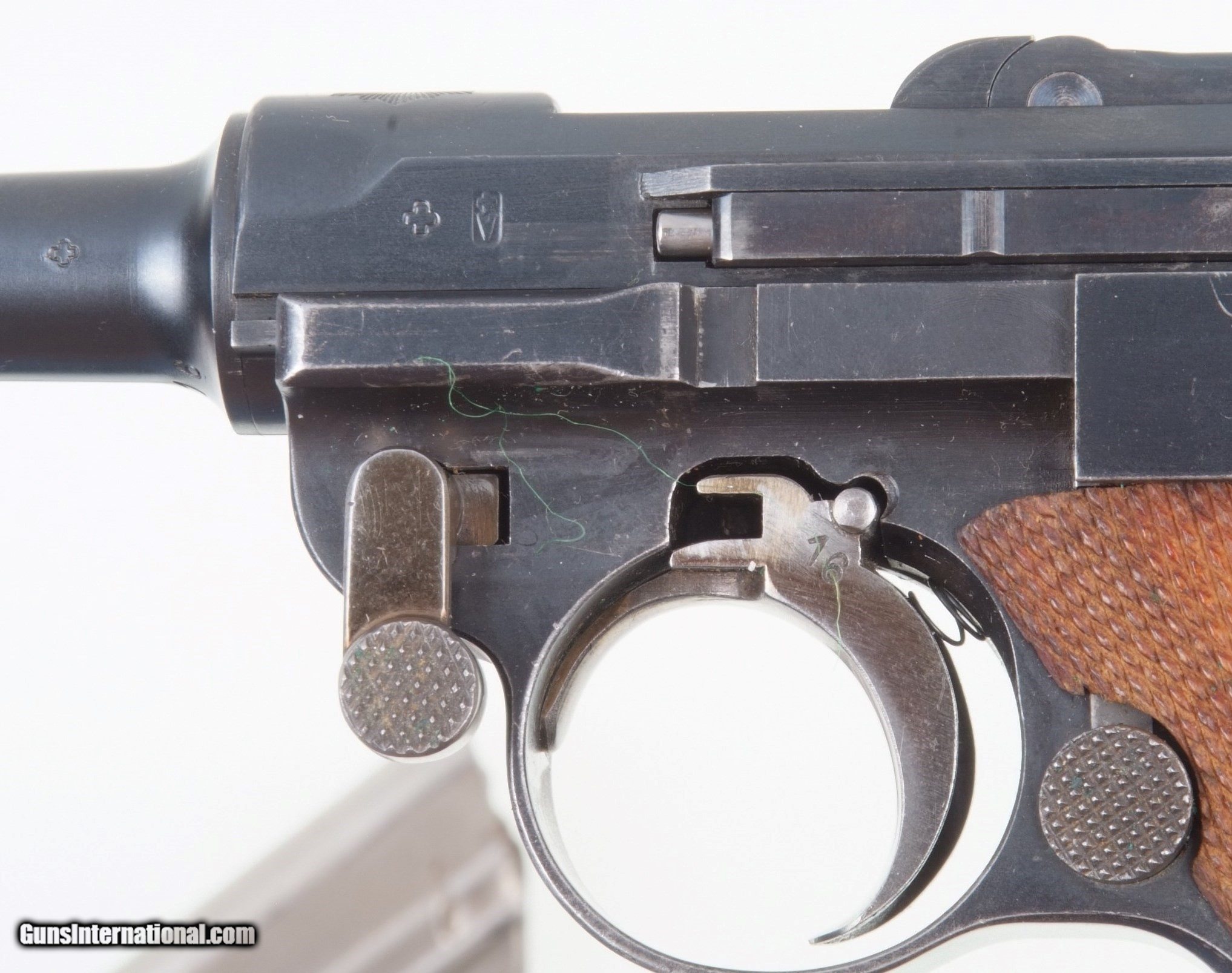 Description: Standard configuration with 4.75” tapered barrel having drift adjustable fire blued front sight and fixed rear sight, modified with “U” notch. Flat top breech block, with toggle train having dished ears and anti-rebound lock. Chamber marked with cross in sunburst. Intertwined DWM on middle toggle link. Small Swiss proofs on left side of barrel and left receiver. Right receiver with “P” release and “31” with lazy three. Full serial number under barrel and forward frame. All small parts correctly matched with the last two or three digits of the serial number. Usual strawed small parts. Finely checkered walnut grips, both panels matching with last three digits. Correct original magazine, unmarked, with base having inserted disks. Synopsis: Nice M1900 Swiss Luger, Military, all matching with wide trigger and correct magazine. Condition: At least 95% bright original rust blue with most of the wear on the front and backstraps. Comparable condition small parts with no suggestion of the straw having been freshened. Bright mirror bore. Perfect manual mechanics. A very desirable Swiss Military Luger, particularly when all matching and with the wide trigger. A HISTORIC INVESTMENT! ~~Insured shipping fee of $75; most packages shipped using FedEx 2nd Day.~~ SOLD Manufacturer: DWM Serial Number: 4316 Caliber Info: .30 Luger |