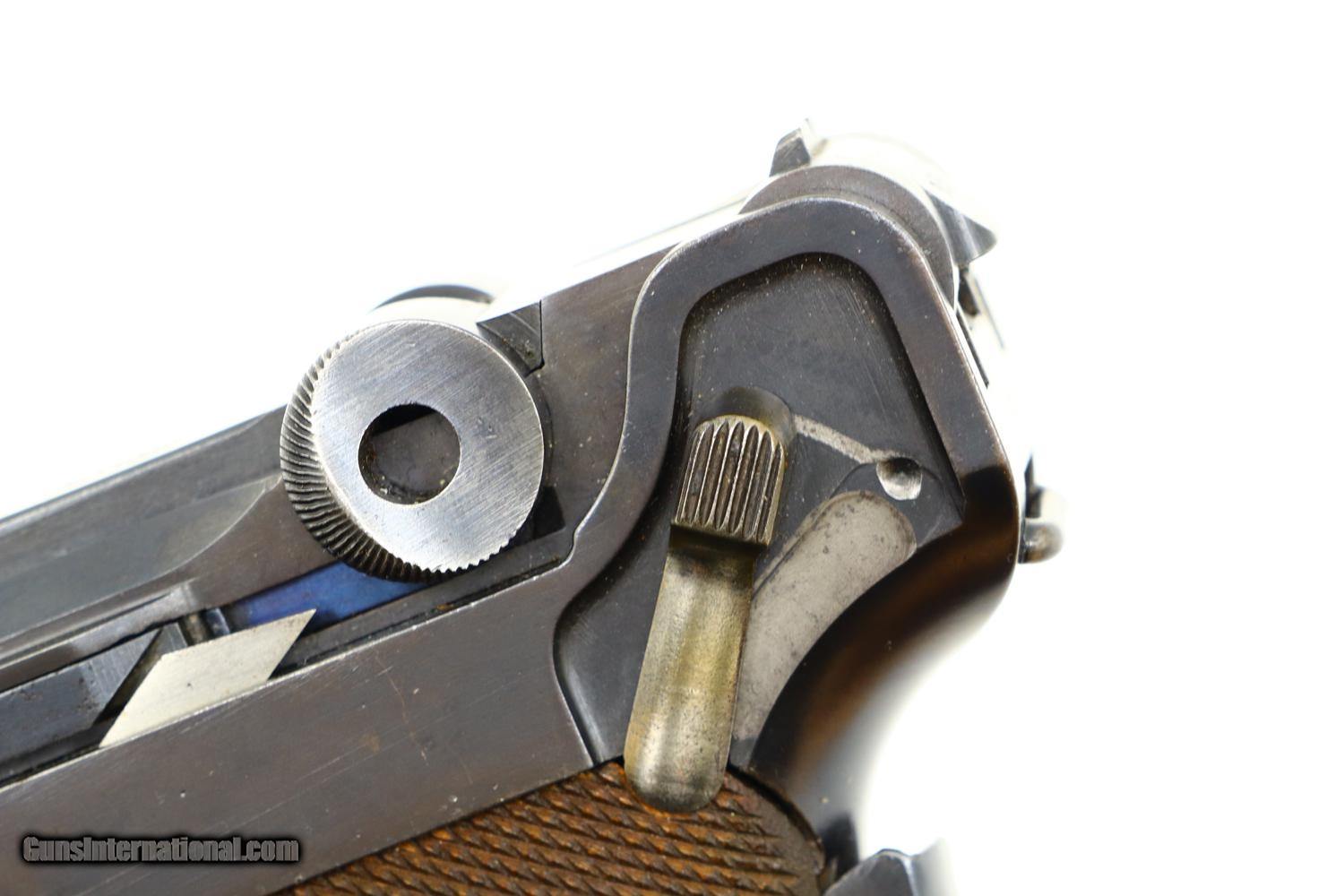 Description: Synopsis: DWM 1902 American Eagle Luger, 23365, A-1847 Description: Scarce DWM 1902 American Eagle Fat Barrel Luger, cal. 9MmP, with 4” barrel, drift adjustable serrated ramp front sight and fixed “V” notch rear sight. Deeply impressed American Eagle on chamber. “DWM” intertwined on forward toggle link. Full serial number on forward frame, just above “GERMANY”, repeated on barrel, the last 2-3 digits on all the usual small parts including each of the walnut checkered grips. Correct magazine with “Cal 9m/m” base. Major componets rust blued; strawed small parts excepting fire blued grip screws. Condition: EXC as professionally restored with correct rust blue, sharp edge/holster wear in appropiate locations. Several of the small parts have been restrawed, while others, such as the take down lever and anti-bounce lock appear unaltered. Extractor slightly bowed. Magazine body is original, the plug is super high quality replacement. Mirror bright bore with sharp rifling. Perfect manual mechanics. A great looking DWM 1902 American Eagle Fat Barrel Luger for about half the price of an all-original example. SOLD Manufacturer: DWM Model: 1902 American Eagle Luger Serial Number: 23365 Caliber Info: 9mmP Condition: Exc/Restored |