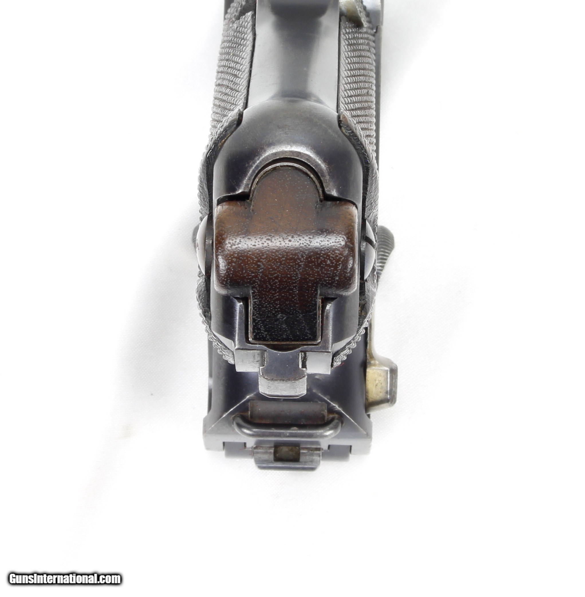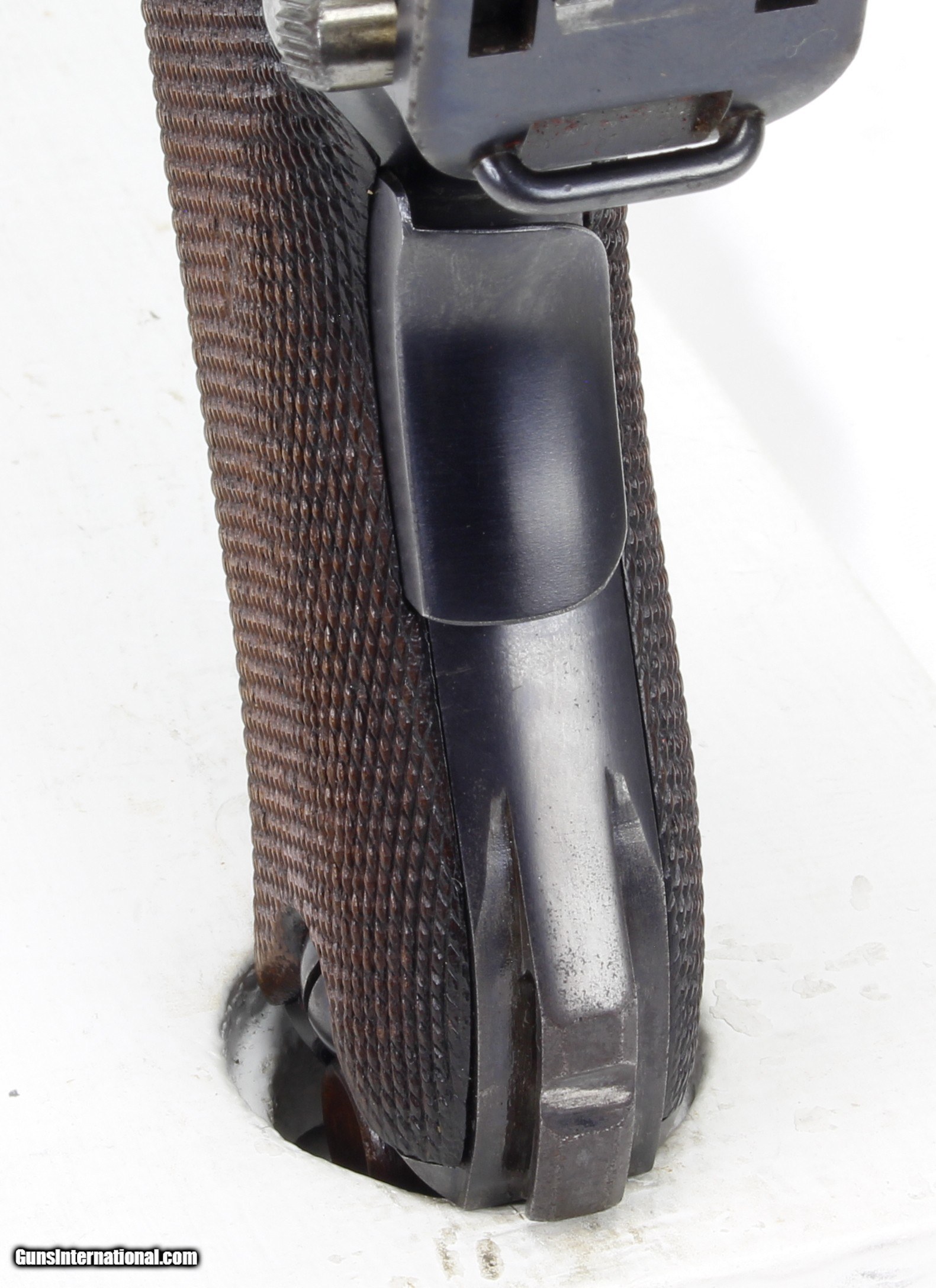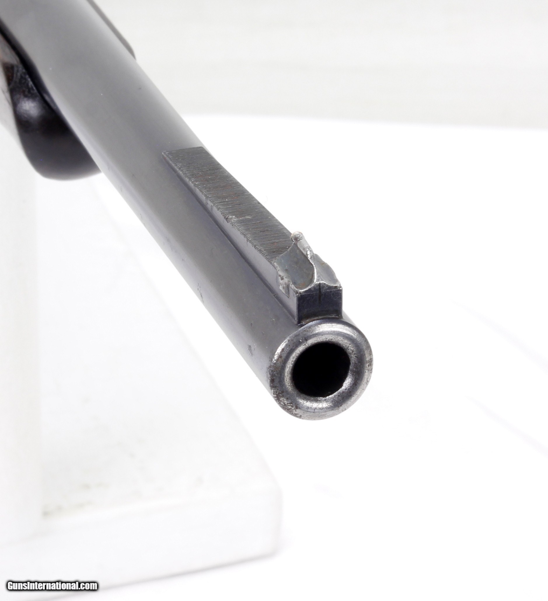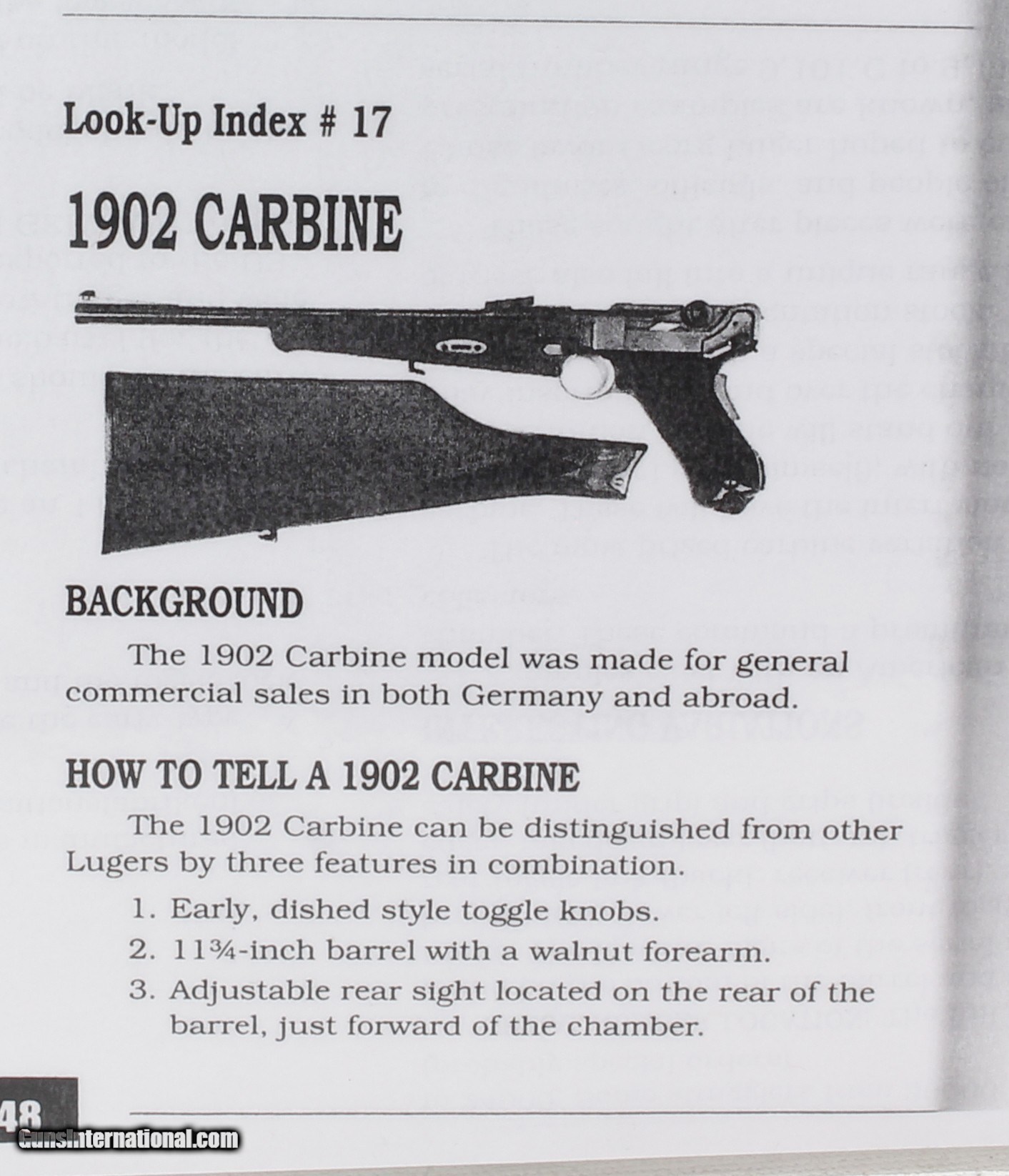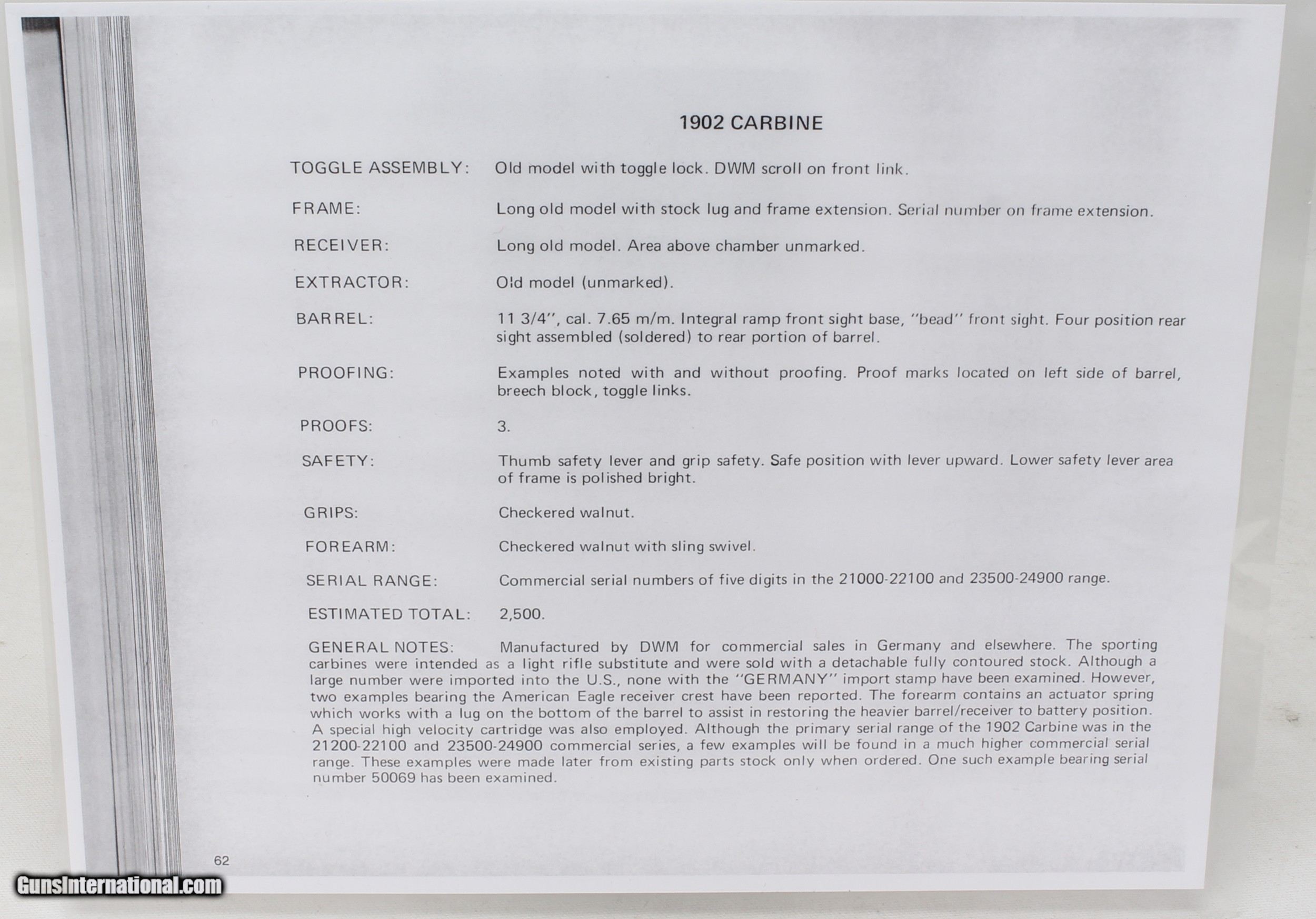 Description: DWM Model 1902 Commercial Luger Carbine in 7.65MM (.30 Luger) SN #23953. Mfg. in 1902-1903. One of Approximately 2500 ever produced. ALL MARKED PARTS HAVE MATCHING NUMBERS, 11 3/4" Barrel with an EXCELLENT Bore for it's age. The Blued Metal Finish and Straw Colored Parts are EXCELLENT condition. The ORIGINAL Checkered Walnut Grips are in VERY GOOD to EXCELLENT condition with some very slight wear to the checkering. This Model 1902 also includes the DETACHABLE, FULLY CONTOURED STOCK WITH MATCHING SERIAL NUMBER. Included in the Photos is a Model 1902 Checklist with authenticating proofs for the gun including Markings and Features. Includes a VERY NICE, RED VELVET LINED PADDED WOODEN DISPLAY CASE. EXCEPTIONAL ORIGINAL CONDITION. Weight: 2.87 lbs w/o stock. 3.94 lbs. with stock. Trigger Pull: 8+ lbs. We took 80 pictures of this Pistol so more photos are available upon request. Ships to Lower 48 W/ Insurance "FREE". "THIS IS A COLLECTORS QUALITY, RARE 1902 DWM MODEL 1902 SOLD Curio/Relic: Yes Handgun Caliber: 7.65x22mm Parabellum (7.65x22mm Luger, .30 Luger) Manufacturer: DWM Model: 1902 Luger Carbine Serial Number: 23953 Barrel Length: 11 3/4 Condition: Excellent Metal Condition: Excellent Wood Condition: Excellent Bore Condition: Excellent Action: Semi-Auto Finish: Blue Manufacture Date: 1902-03 |
