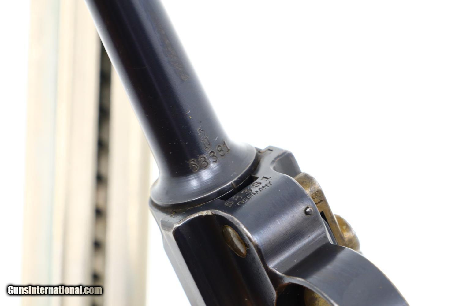 Description: Standard configuration 1906 AE with 4.75” barrel having drift adjustable front sight and fixed rear sight. Bold American Eagle over chamber and intertwined DWM over middle toggle link. Made for export as denoted by the “GERMANY” on front frame. Full serial number on forward frame is repeated under barrel with the last two digits “81” on all appropriate small parts. Major parts rust blued. Takedown lever, trigger, safety, ejector and magazine release button are strawed. Fire blued pins and grip screws. Finely checkered grips. Correct magazine with tinned body and walnut plug. Synopsis: Striking DWM 1906 American Eagle Luger with correct magazine. Deeply impressed American Eagle on chamber! Condition: Crisp 98-99% original rust blue with muzzle and sharp edge wear as might be expected from careful use. Comparable condition strawed small parts, grips, and magazine. Bright bore with strong rifling. Perfect manual mechanics. An extremely nice, no excuse 1906 American Eagle Luger. ~~Insured shipping fee of $65; most packages shipped using FedEx 2nd Day.~~ SOLD Manufacturer: DWM Serial Number: 68381 Caliber Info: .30 Luger |