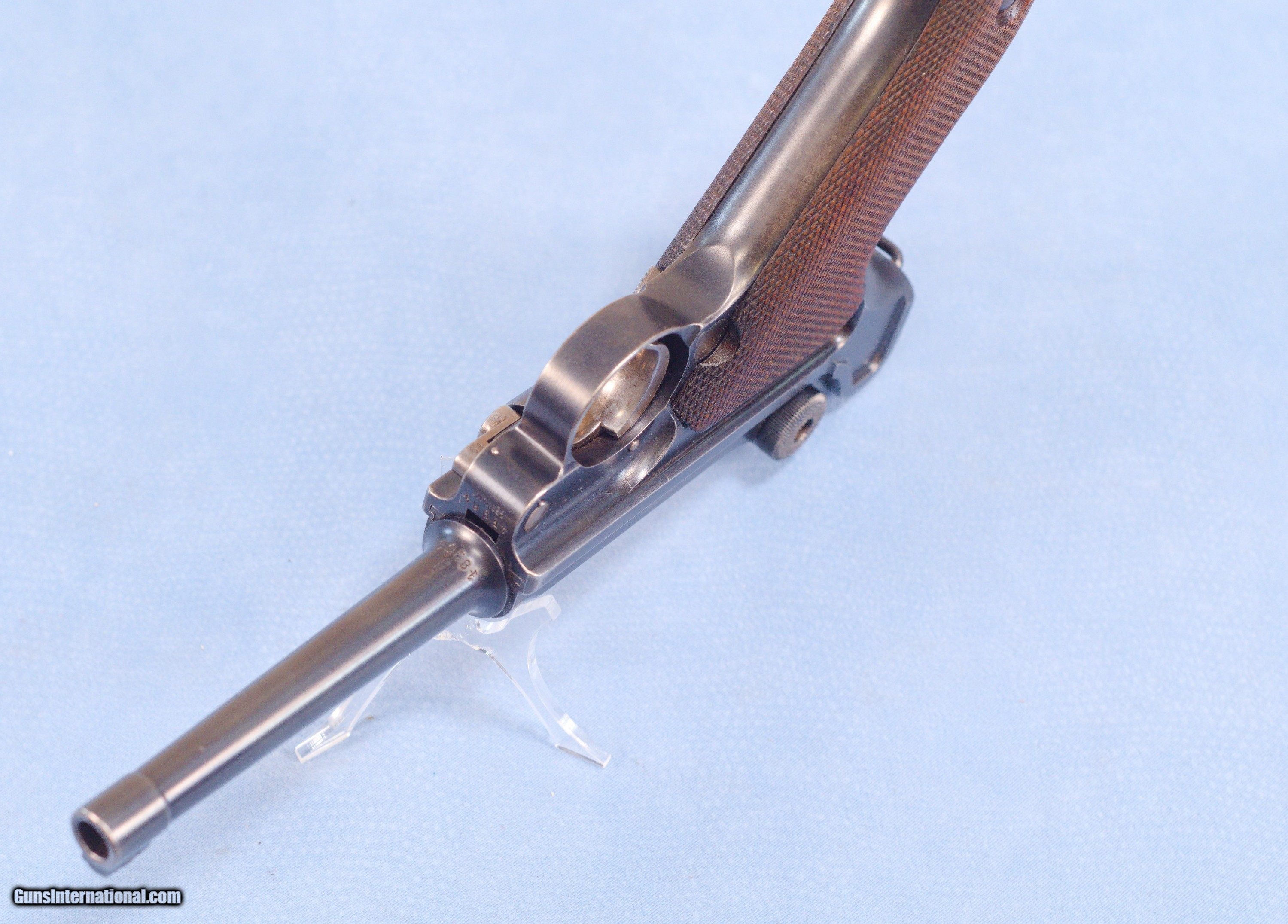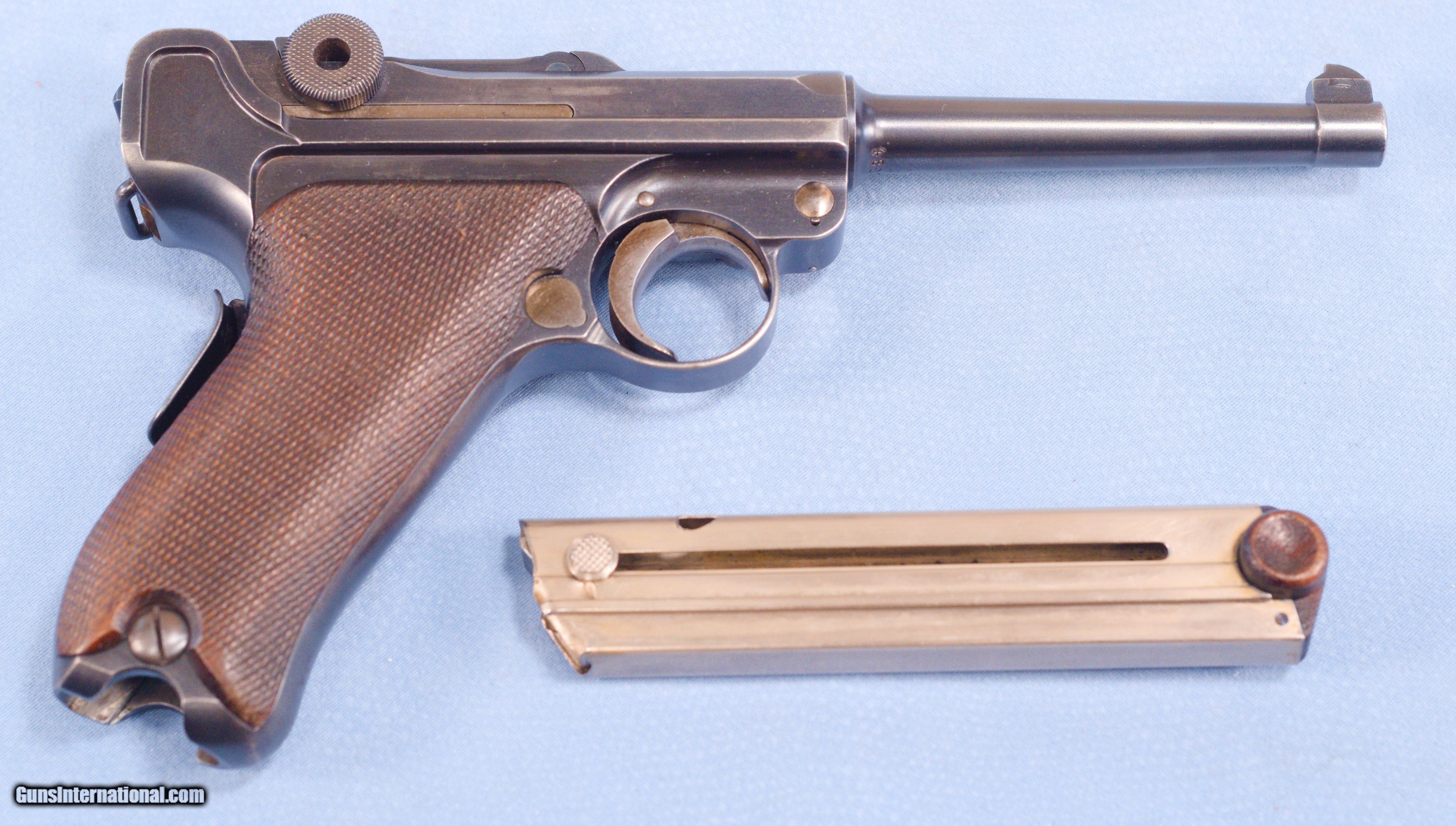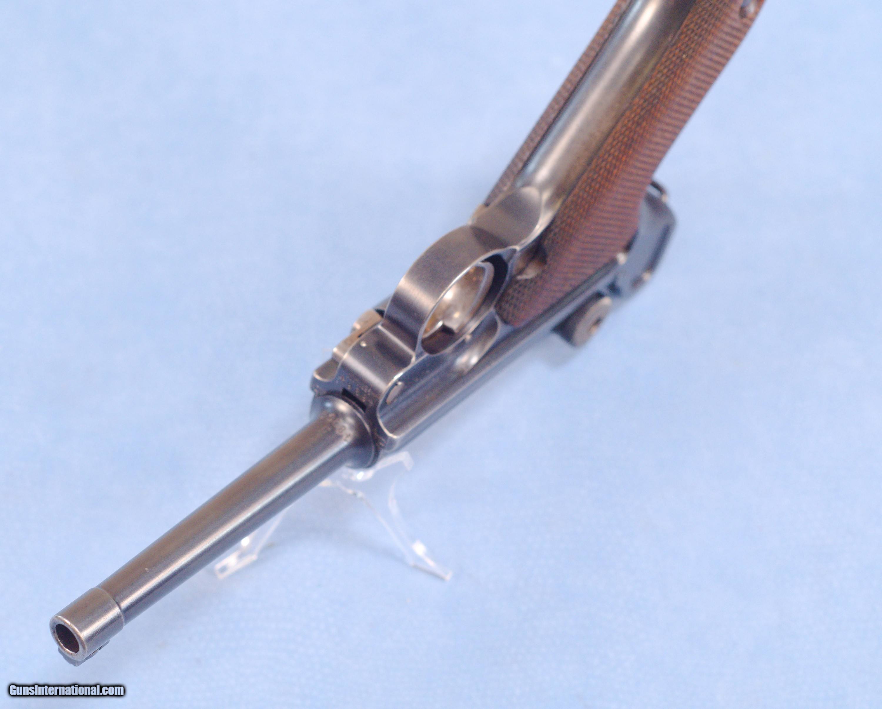 Description: This is an excellent DWM 1906 American Eagle Luger pistol in .30 Luger caliber. The Pistole Parabellum or Parabellum-Pistole (Pistol Parabellum), commonly known as just the Luger or Luger P08, is a toggle-locked recoil-operated semi-automatic pistol. The Luger was produced in several models and by several nations from 1898 to 1949. The design was first patented by Georg Luger. It was meant to be an improvement of the Borchardt C-93 pistol, and was initially produced as the Parabellum Automatic Pistol, Borchardt-Luger System by the German arms manufacturer Deutsche Waffen- und Munitionsfabriken (DWM). The first production model was known as the Modell 1900 Parabellum. It was followed by the "Marinepistole 1904" for the Imperial German Navy. These pistols went to the US retail market and the manufacturers at DWM realized that nation-based crests increased sales of these Lugers, so that is why you find the American Eagle over the chamber. This is also why you see GERMANY marked on the frame, denoting these were exported for commercial sale. This example is in very good condition exhibiting some high edge and muzzle wear but nothing serious. The DWM and American Eagles on top of the pistol are sharp and clear. The barrel has a very good bore with strong rifling. Grips are free of cracks or chips. One magazine comes with the pistol. This is a very nice Luger that be a strong addition to a collection or an outstanding start to a new collection. PRICE: $2395.00 Plus Shipping We are Antique & Modern Firearms in Lexington, KY, a dealer of fine firearms since 1974. To Inquire please call PH. 859-276-1419 We Buy, Sell, and Trade Firearms & Knives. Have an Individual Firearm, Firearms Collection, or Firearms Estate to sell, let us know, and we can buy or consignment sell it for you. NOTE: No additional fee for a Credit Card payment SOLD Handgun Caliber: 7.65x22mm Parabellum (7.65x22mm Luger, .30 Luger) Manufacturer: DWM Model: American Eagle Luger Serial Number: 48964 Barrel Length: 4.7 Condition: Very Good Metal Condition: very good Wood Condition: Very Good Bore Condition: Very Good strong rifling Action: Semi Automatic Item Location: Kentucky |