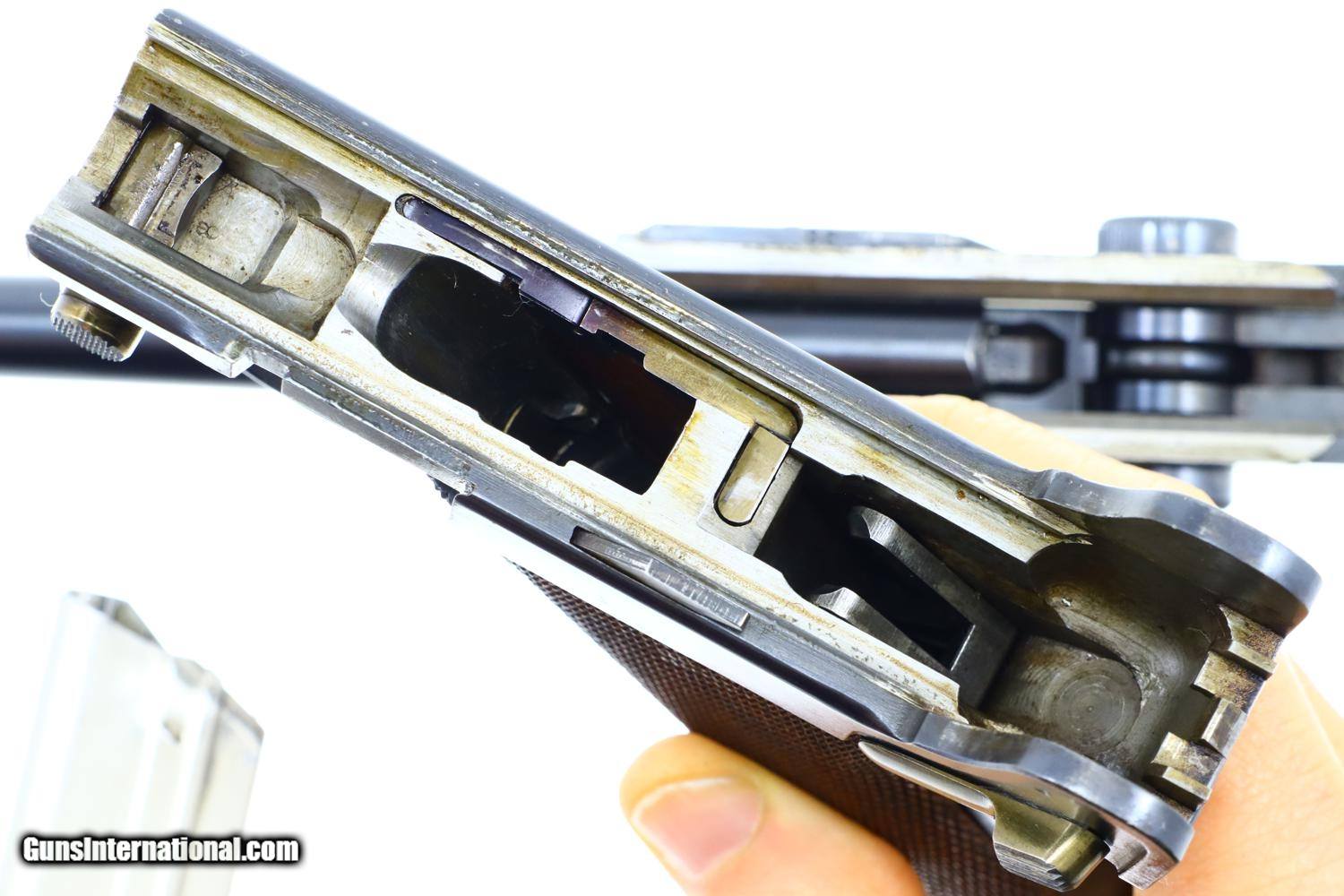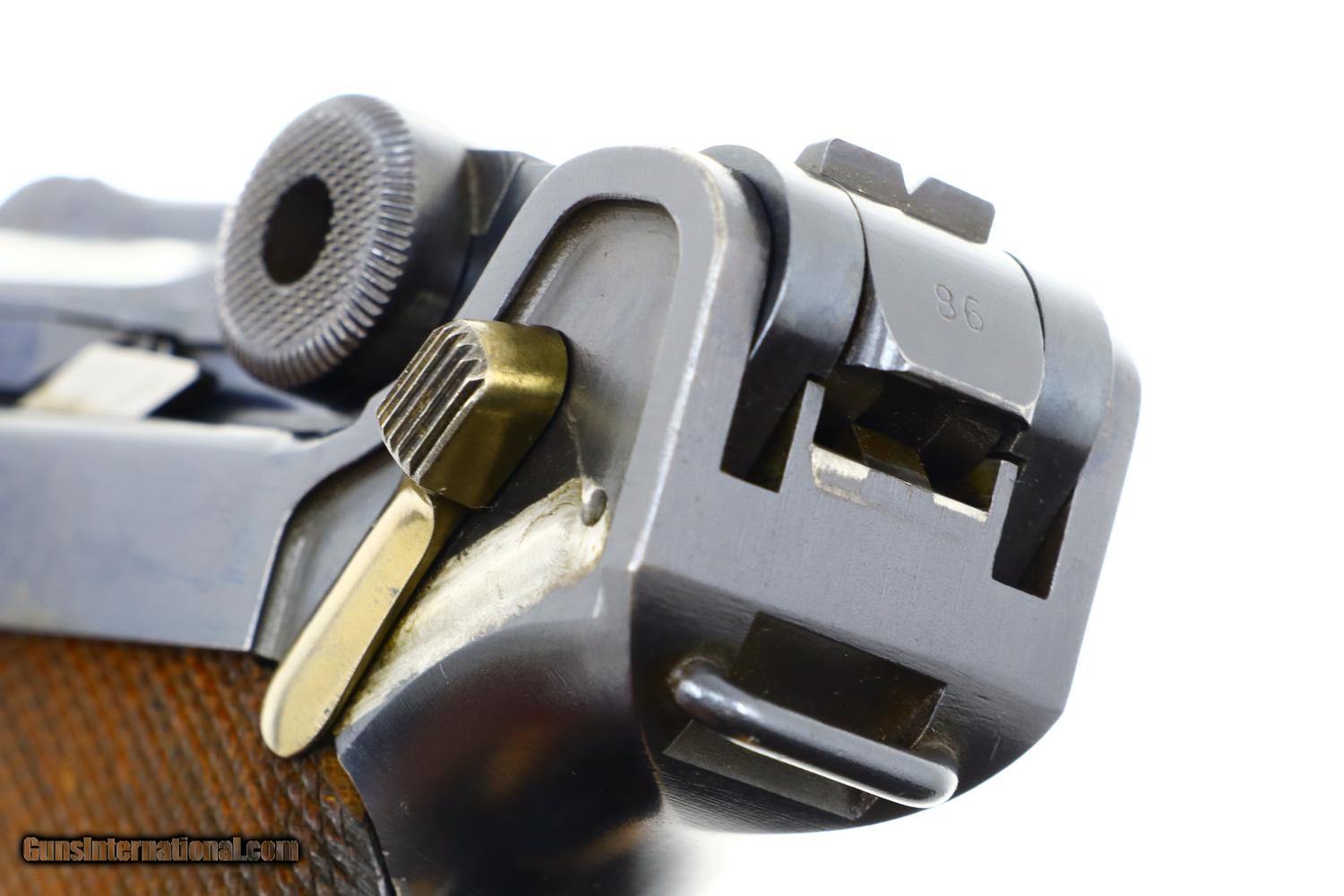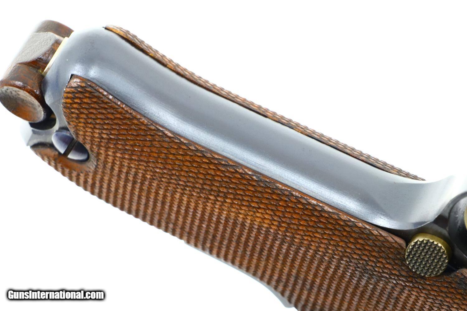 Description: This beautiful example of a DWM Model 1906 Commercial Luger, cal 7.65mmL, has a 4.75” tapered barrel with drift adjustable front sight and fixed rear sight. No chamber marking. Intertwined DWM on front toggle link, grip safety and no stock lug. Serrated safety with exposed in-the-white metal to indicate the safe position. Correct short frame. Full serial number in front of frame and repeated under barrel, last two digits in usual commercial locations except for the walnut checkered grips: the left grip panel has been over stamped with a small cross and "43", the right grip has the small cross with the small letter "I". Interestingly, and unlike most commercial guns, there are no Crown/N proofs although the receiver is marked “GERMANY”, reflecting the intent to export. Complete with a standard magazine with tinned body and an unmarked walnut plug. Synopsis: Beautiful DWM, 1906 Commercial German Luger, 7.65mmL, 35086, A-1814 Condition: Excellent bright original rust blue with faint sharp edge wear. Comparable condition strawed parts though these have had their straw colors enhanced. Grips with light oil staining, sharp checkering, no cracks or splits. Very bright bore with sharp rifling. Perfect manual mechanics. A great looking DWM 1906 Commercial, now over a hundred years old! ~~Insured shipping fee of $75; most packages shipped using FedEx 2nd Day.~~ SOLD Manufacturer: DWM Serial Number: 35086 Caliber Info: 7.65mm Luger |