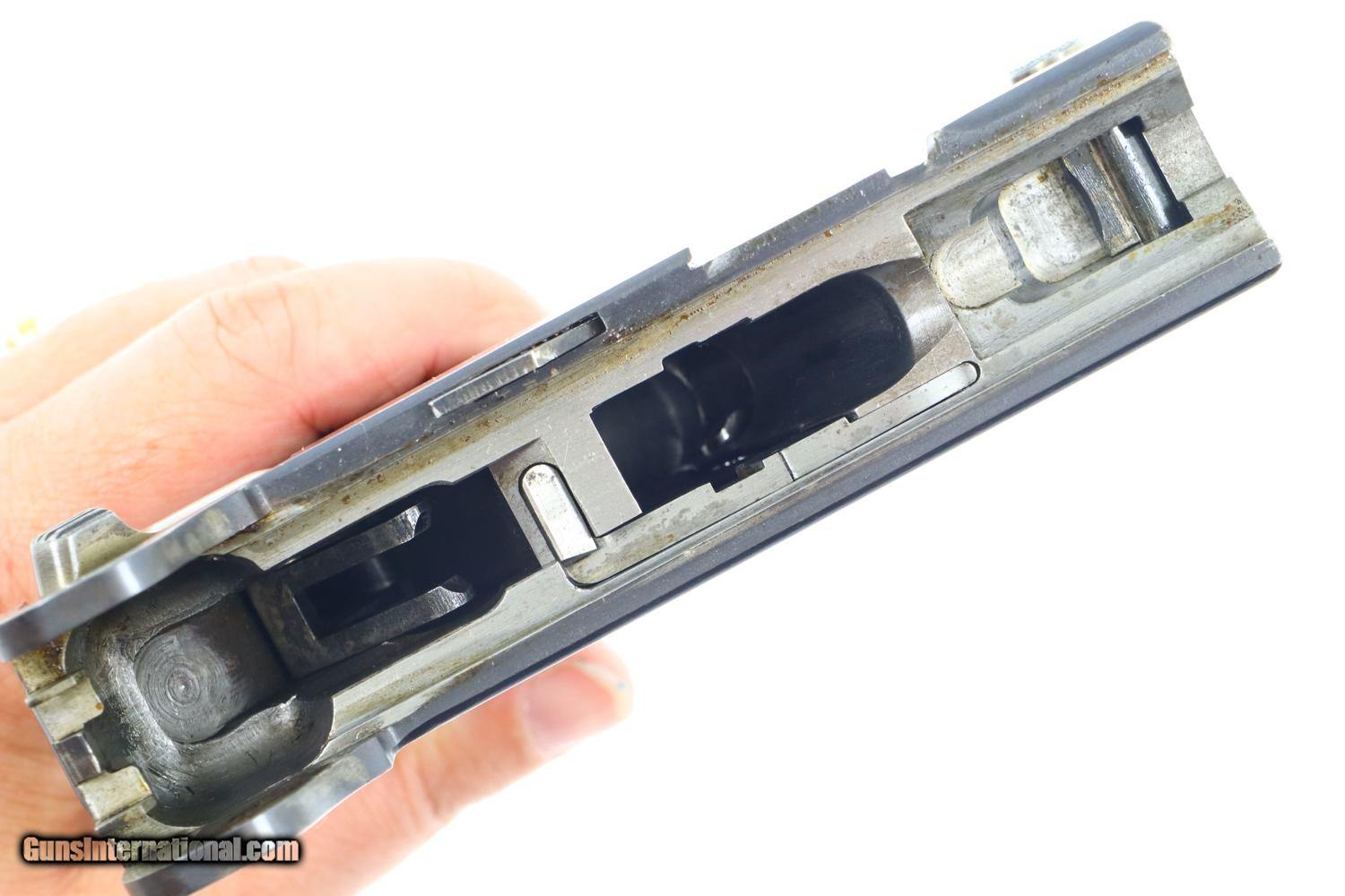 Description: Synopsis: Beautiful DWM, 1906 Commercial Navy Luger, Complete Rig, 2824, FB00850 Description: High condition DWM 1906 Navy Commercial Rig, cal 9mmP, with 3 matching magazines, correct holster, cleaning rod, flat board stock, straps, and double magazine pouch. Navy Luger with usual drift adjustable front sight, 6" barrel and two position rear sight marked 100/200. Forward toggel link with DWM logo. Full serial number on forward frame and adjacent to Crown/M under barrel. Last two digits on all the usual small parts including each of the grip panels. Usual strawed and fire blued small parts. Fine checkered walnut grips. Primary and both spare magazines with matching "2824". Complete with original flatboard stock having a Crown/M marked naval disc. Correct leather holster and original Navy cleaning rod with brass tip. Shoulder strap secured with paired brass studs. Unmarked double magazine pouch. Consigner states this exact rig was previously sold as part of the Putnam Green Collection. Condition: Pistol in near excellent original condition except for touched up front sight and minimally enhanced straw on safety lever, takedown lever and trigger. Oil darkened grips with the right panel having a few areas of blunted checkering. Comparable condtion primary magazine whose darkened plug has a scattering of handling marks. Near excellent stock and associated leather with no suggestion of restitching or replacements. Paired magazines in pouch are identically marked with a font slightly different than the primary magazine. Mirror bright bore, sharp rifling. Perfect manual mechanics with all three magazines. An very high condition and extremely attractive and complete 1906 Navy rig. ~~Insured shipping fee of $155; most packages shipped using FedEx 2nd Day.~~ SOLD Curio/Relic: Yes Manufacturer: DWM Serial Number: 2824 Caliber Info: 9mmP |