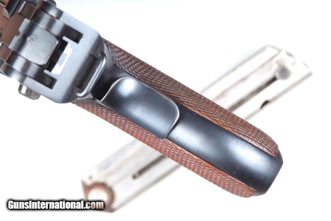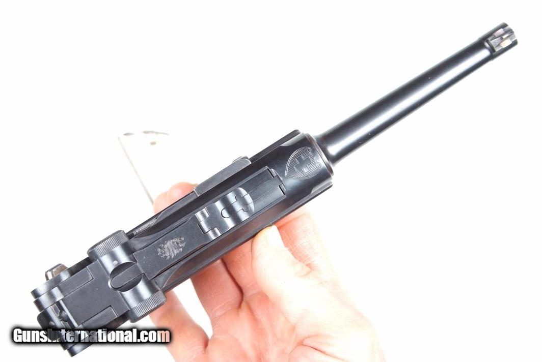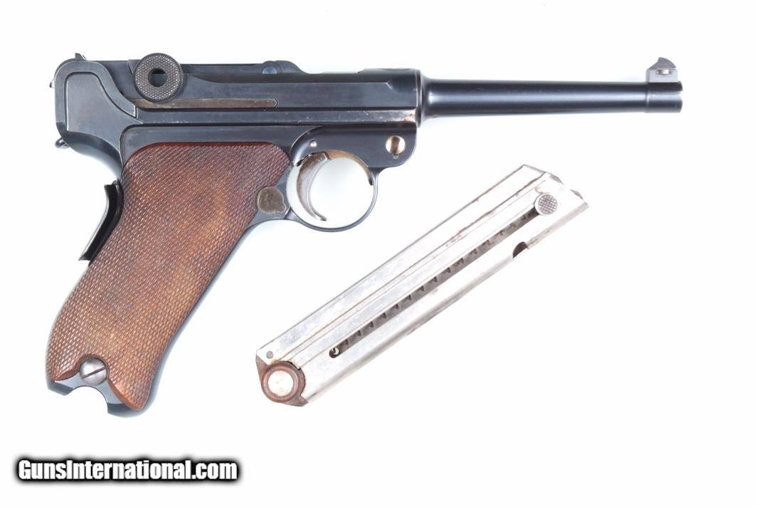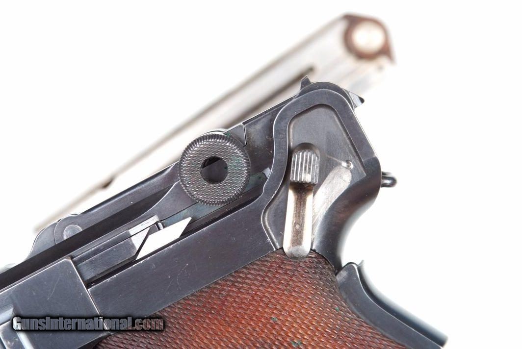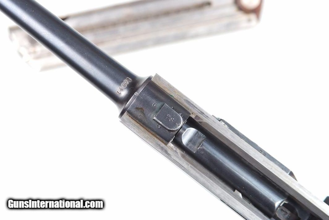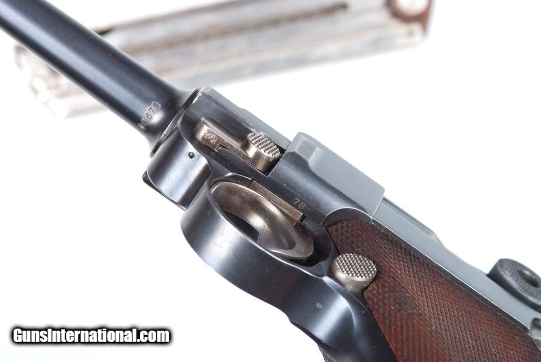 Description: Standard M1906 Cross in Shield military with 4 ¾” barrel having a drift adjustable front sight and fixed U-notch rear sight. Deeply impressed cross in shield over chamber with usual DWM over middle toggle link. Full serial number under barrel and on forward frame. Numbered small parts are all matching with unnumbered grips. Magazine with tinned body and walnut base bracketed with aluminum discs. NO DEACCESSIONED MARKINGS! Synopsis: DWM Model 1906, Swiss Military Luger, Cross in Shield, Correct Magazine. Condition: Approximately 98% bright original rust blue with light sharp edge wear. Comparable condition strawed parts showing no enhancement. Sharply checkered grips with light oil staining and blunting as photographed. Mirror bore. Perfect manual mechanics. Overall, an extremely-nice and all matching, Swiss 1906 Cross in Shield Luger, now about one hundred years old! ~~Insured shipping fee of $65; most packages shipped using FedEx 2nd Day.~~ SOLD Curio/Relic: Yes Manufacturer: DWM Serial Number: 14678 Caliber Info: 7.65 mm Luger |