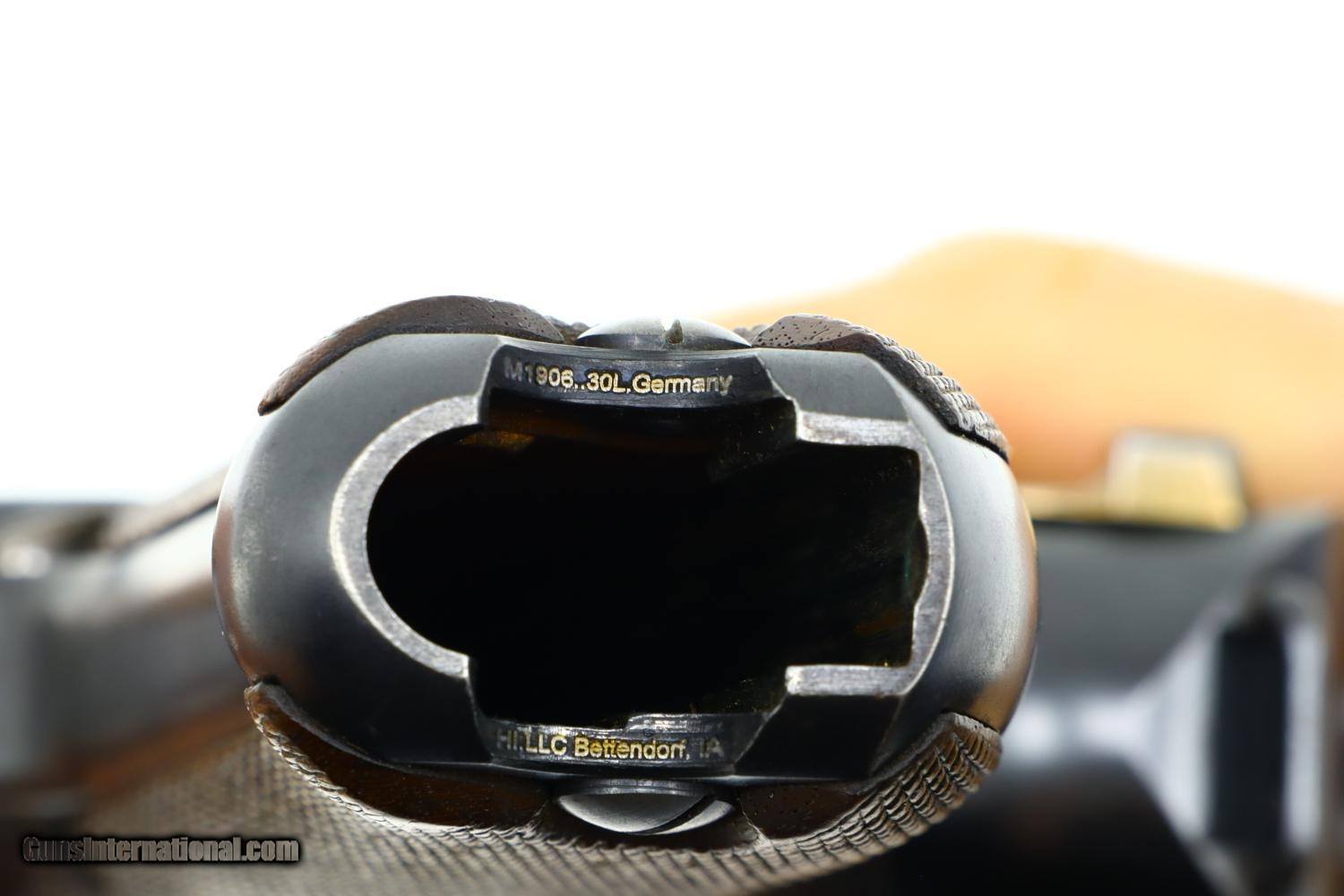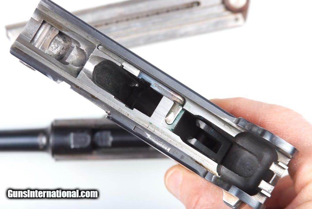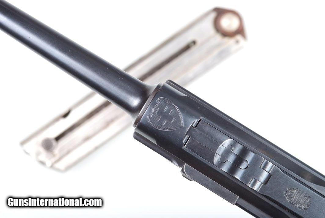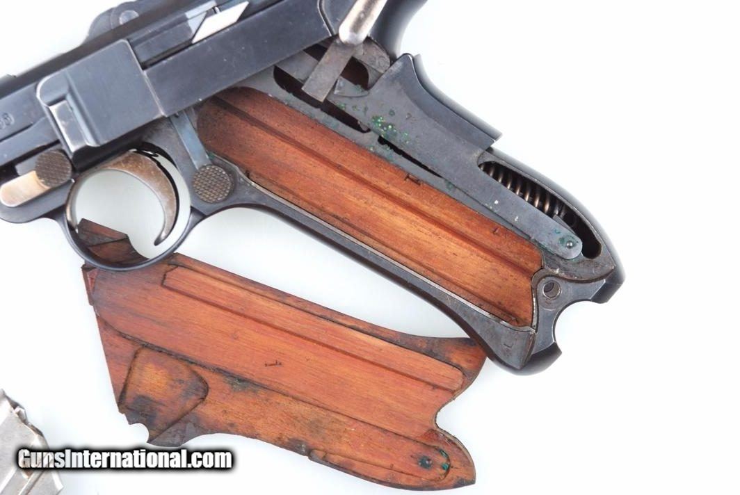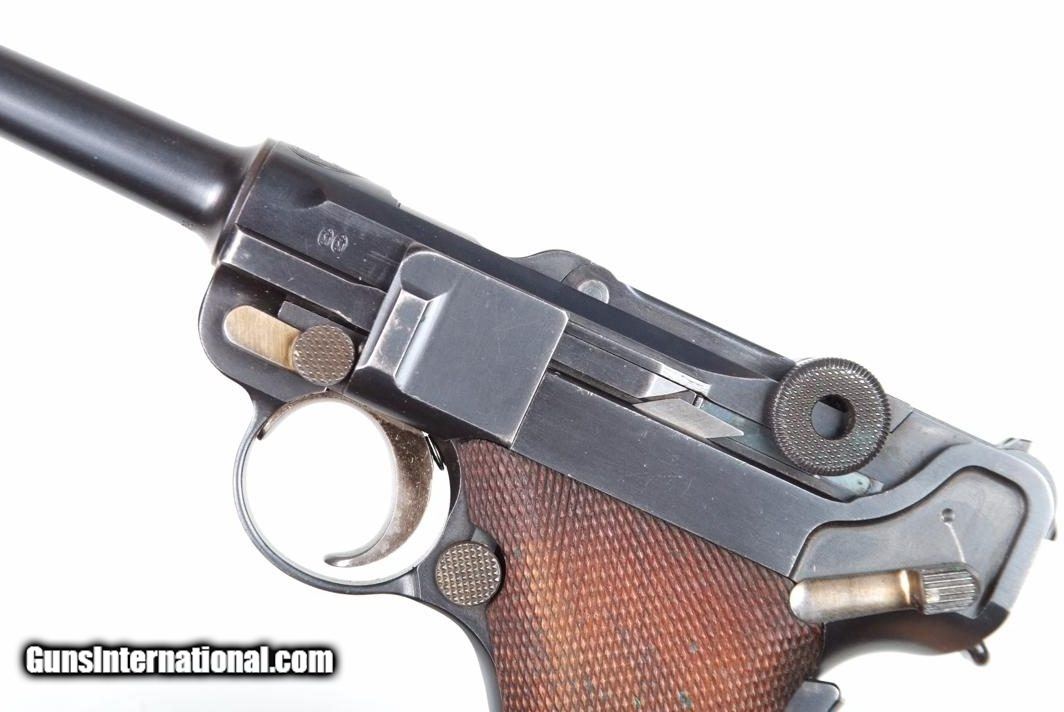 Description: Standard M1906 Cross in Shield military with 4 ¾” barrel having a drift adjustable front sight and fixed U-notch rear sight. Deeply impressed cross in shield over chamber with usual DWM over middle toggle link. Full serial number under barrel and on forward frame. Numbered small parts are all matching with unnumbered grips. Magazine with tinned body and walnut base bracketed with aluminum discs. NO DEACCESSIONED MARKINGS! Synopsis: DWM Model 1906, Swiss Military Luger, Cross in Shield, Correct Magazine. Condition: Approximately 98% bright original rust blue with light sharp edge wear. Comparable condition strawed parts showing no enhancement. Sharply checkered grips with light oil staining and blunting as photographed. Mirror bore. Perfect manual mechanics. Overall, an extremely-nice and all matching, Swiss 1906 Cross in Shield Luger, now about one hundred years old! ~~Insured shipping fee of $65; most packages shipped using FedEx 2nd Day.~~ SOLD Curio/Relic: Yes Manufacturer: DWM Serial Number: 14678 Caliber Info: 7.65 mm Luger |