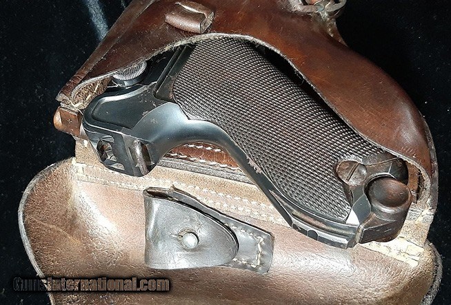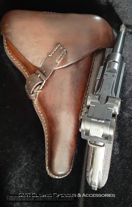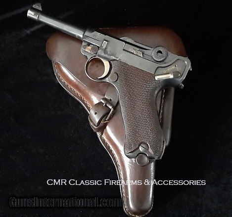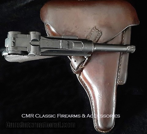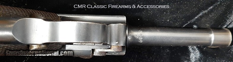 Description: WWI DWM P.08 RIG DATED 1916 WITH MATCHING NUMBERS INCLUDING THE MAGAZINE IN VERY GOOD CONDITION. THE 90% BLUING SHOWS MODERATE HIGH EDGE WEAR. THE STRAW SMALL PARTS RETAIN APPROX 80% -/+ OF THEIR COLOUR. THE BORE IS MIRROR BRIGHT WITH VERY EXCELLENT + RIFLING. THE CHECKERED WALNUT GRIPS ARE IN EXCELLENT CONDITION WITH MATCHED NUMBER 19 ON THE INSIDE OF THE GRIP PANEL. COMES WITH ONE MATCHING MAGAZINE AND A LOVELY CONDITION HOLSTER WITH ITS ORIGINAL UNMARKED STRIPPING/LOADING TOOL. PROVENANCE: IT IS BELIEVED THIS PISTOL BELONGED TO A US NAVAL OFFICER WW1/WW11 AND WAS KEPT IN SAFE KEEPING AS A MOMENTO AND LATER DISCOVERED STORED FOR SAFE KEEPING. THERE IS AN INTERESTING INSCRIPTION ON THE REAR OF THE HOLSTER "G.BOWER E.F, HALE E. EDDY. N.Y." ON THE INNER FLAP G.BOWER C/o A.DAY. HALE EDDY. N.Y.USA. Some interesting research could be forthcoming to discover the origin of this Luger Pistoloand to whom it belonged to? DWM monogram on the Center toggle. Right receiver marked with Imperial proofs and miltary acceptance mark. Chamber Dated 1916. Collectors Grade Condition. Handling & Shipping - H&S not included. Recommended FFL Shippers provided. Curio/Relic: Yes Handgun Caliber: 9x19mm Parabellum (9mm Luger, 9x19mm NATO) Manufacturer: DWM Model: Luger P08 Bore Info: Mint Condition: Good Condition Metal Condition: Good Wood Condition: Good Bore Condition: Mint Action: Semi-auto Item Location: United Kingdom Grips: Walnut Price: $3,750.00 Buy Now Contact Seller |