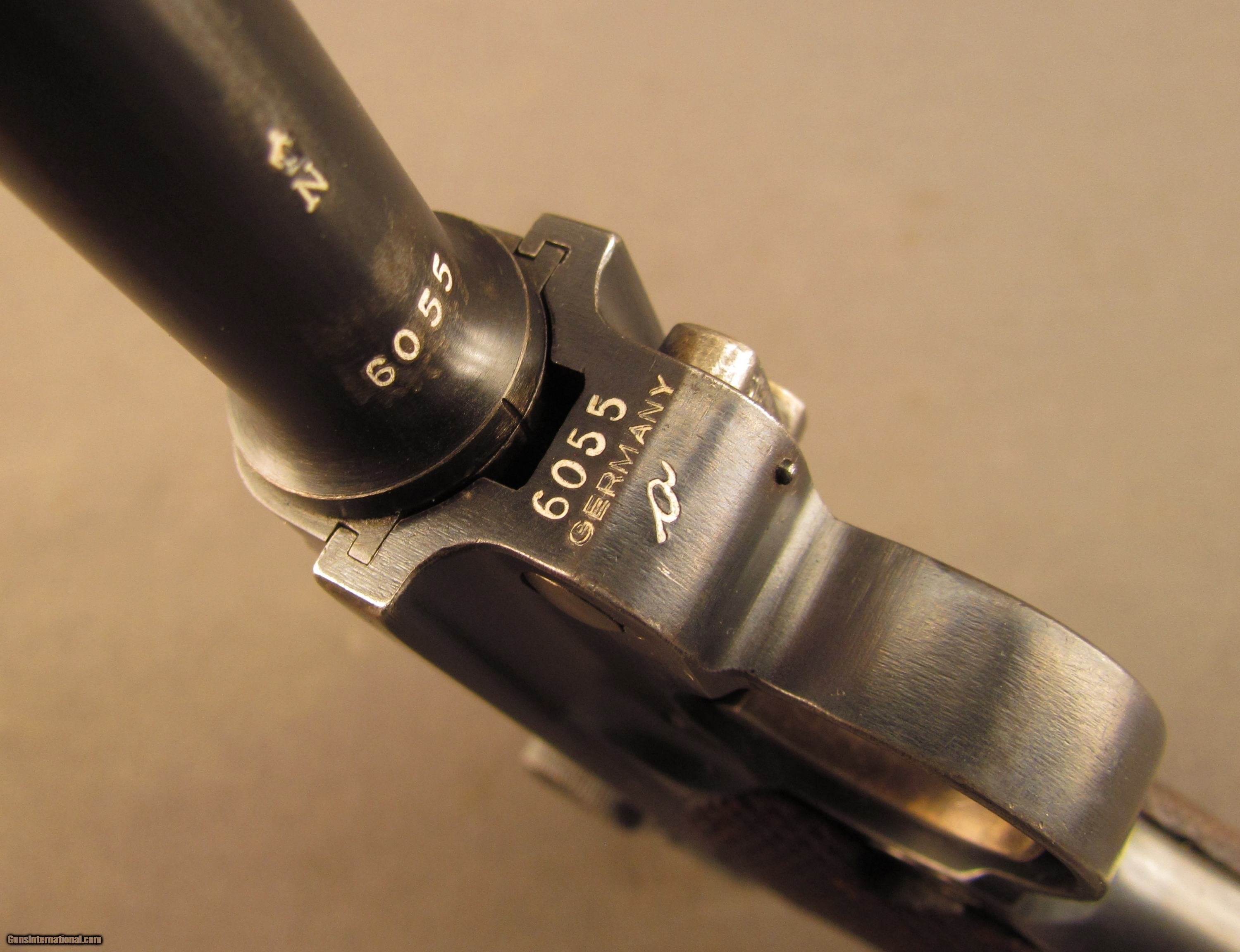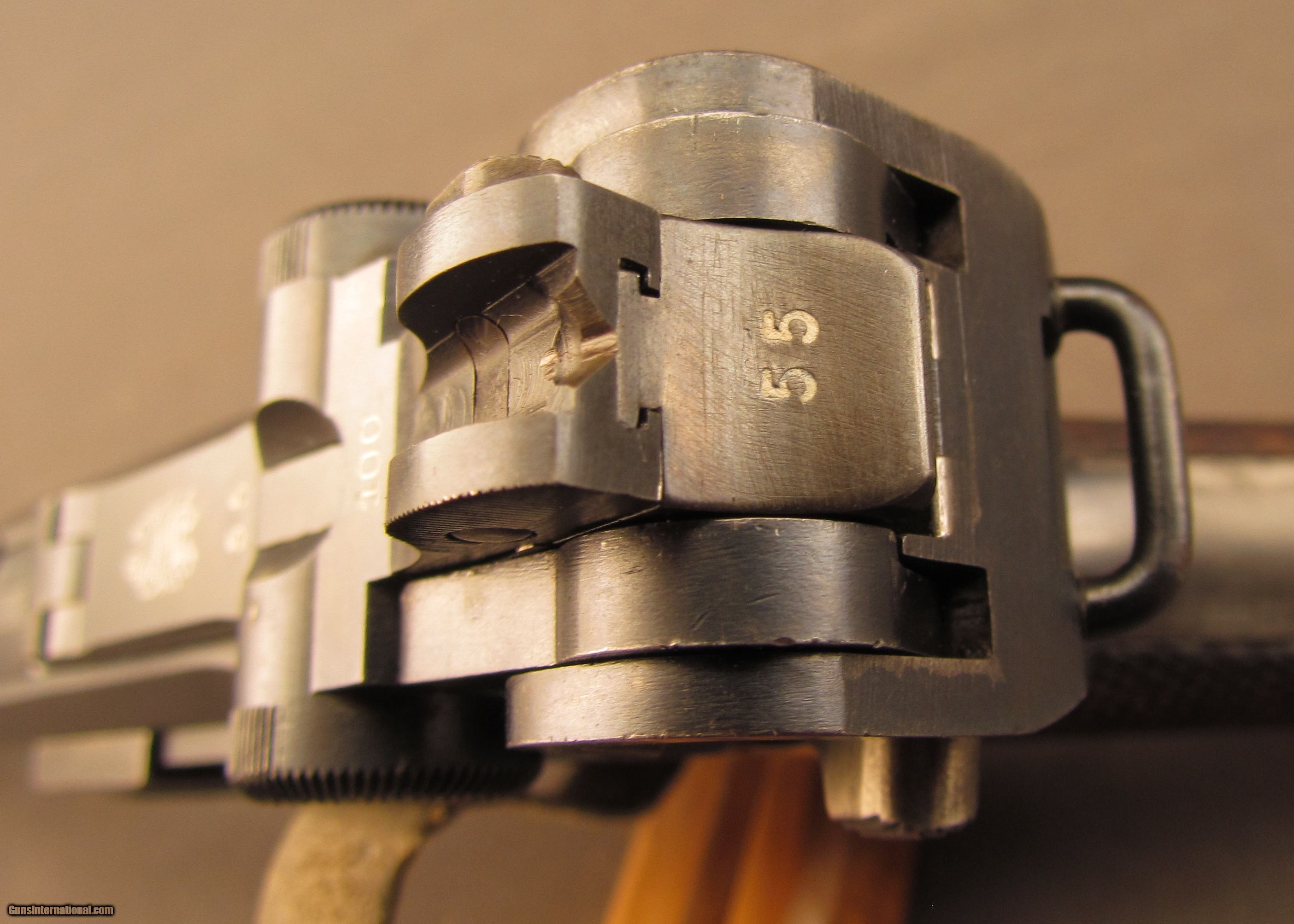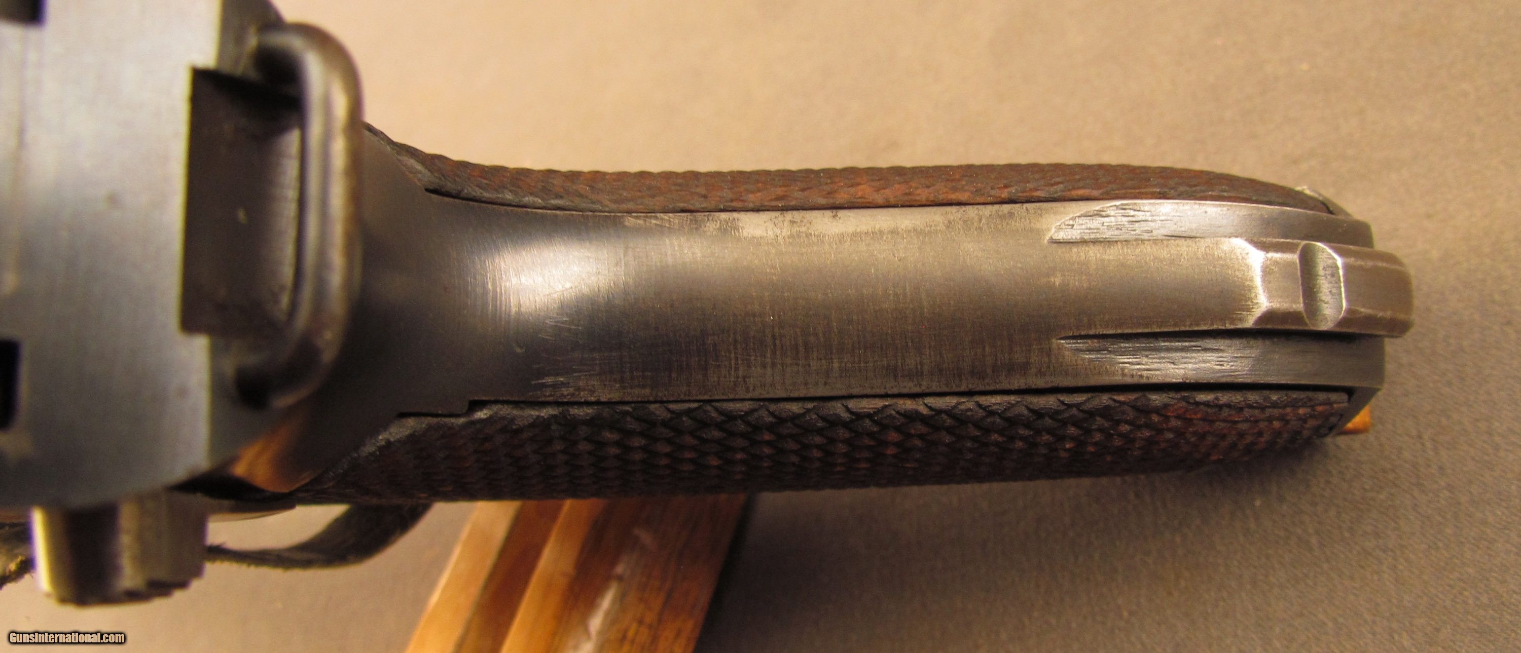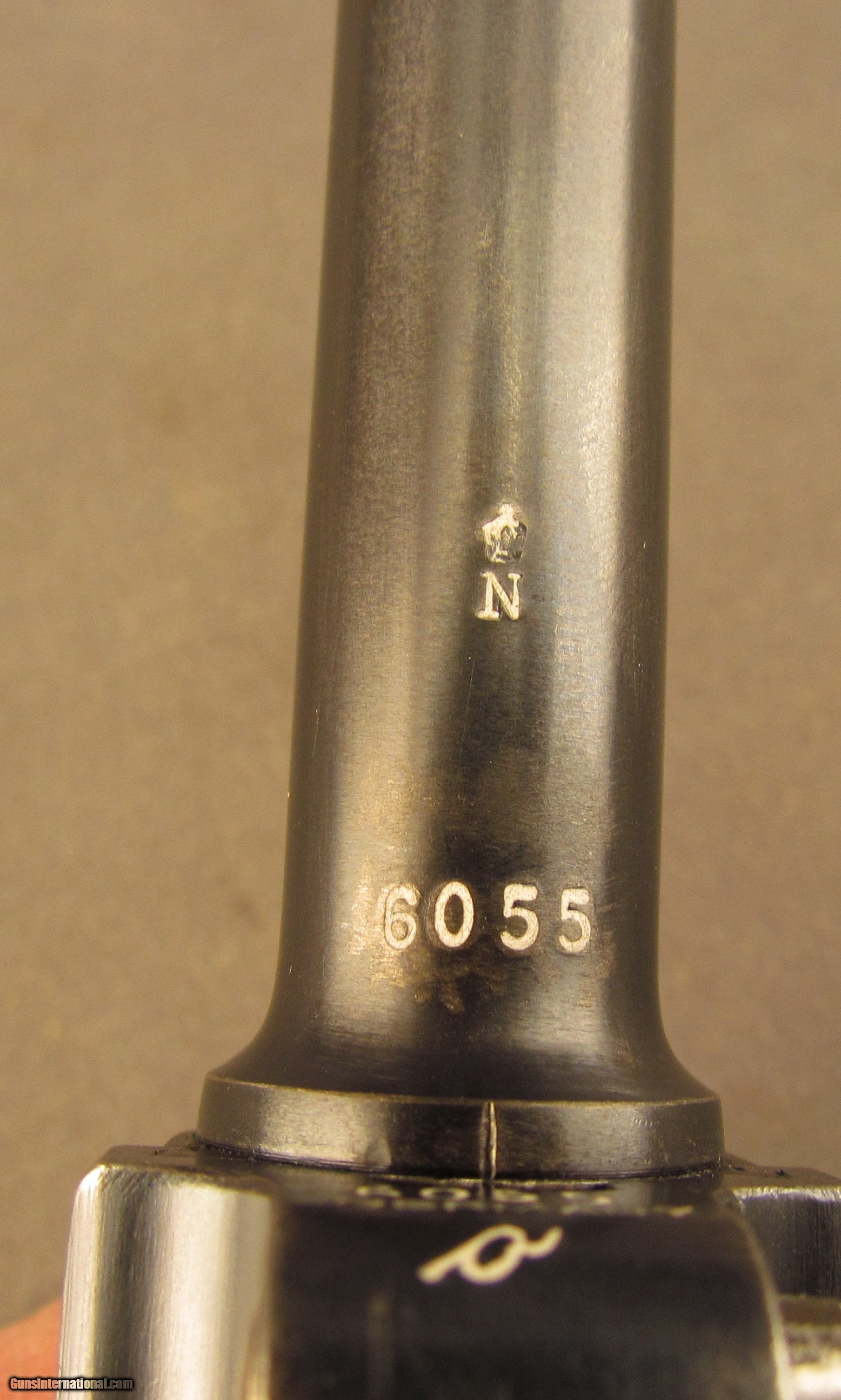 Description: Serial #6055o, 9mm Para., 6" barrel with an excellent, bright bore. This pistol has all matching numbers with the metal retaining 90-92% of the original blue finish that has silvered at the muzzle, as well as along some of the projecting edges and surfaces. There are some scattered specks of light surface freckling, but these are very minor without any pitting present, and there is some further fading on the gripstraps. The trigger, take-down lever, magazine release, and safety retain most of the original straw color, but the ejector has turned mostly bright gray. The checkered walnut grips are both in fine shape with few handling blemishes and only light flattening of the points. A reproduction Navy magazine with concentric circle wooden base is included. The 1920 Navy Commercial is a very rare variant, and this example rates excellent condition overall. FFL or C&R SOLD Curio/Relic: Yes Manufacturer: DWM Model: Luger Serial Number: 6055o Caliber Info: 9mm Gauge Info: 9mm |