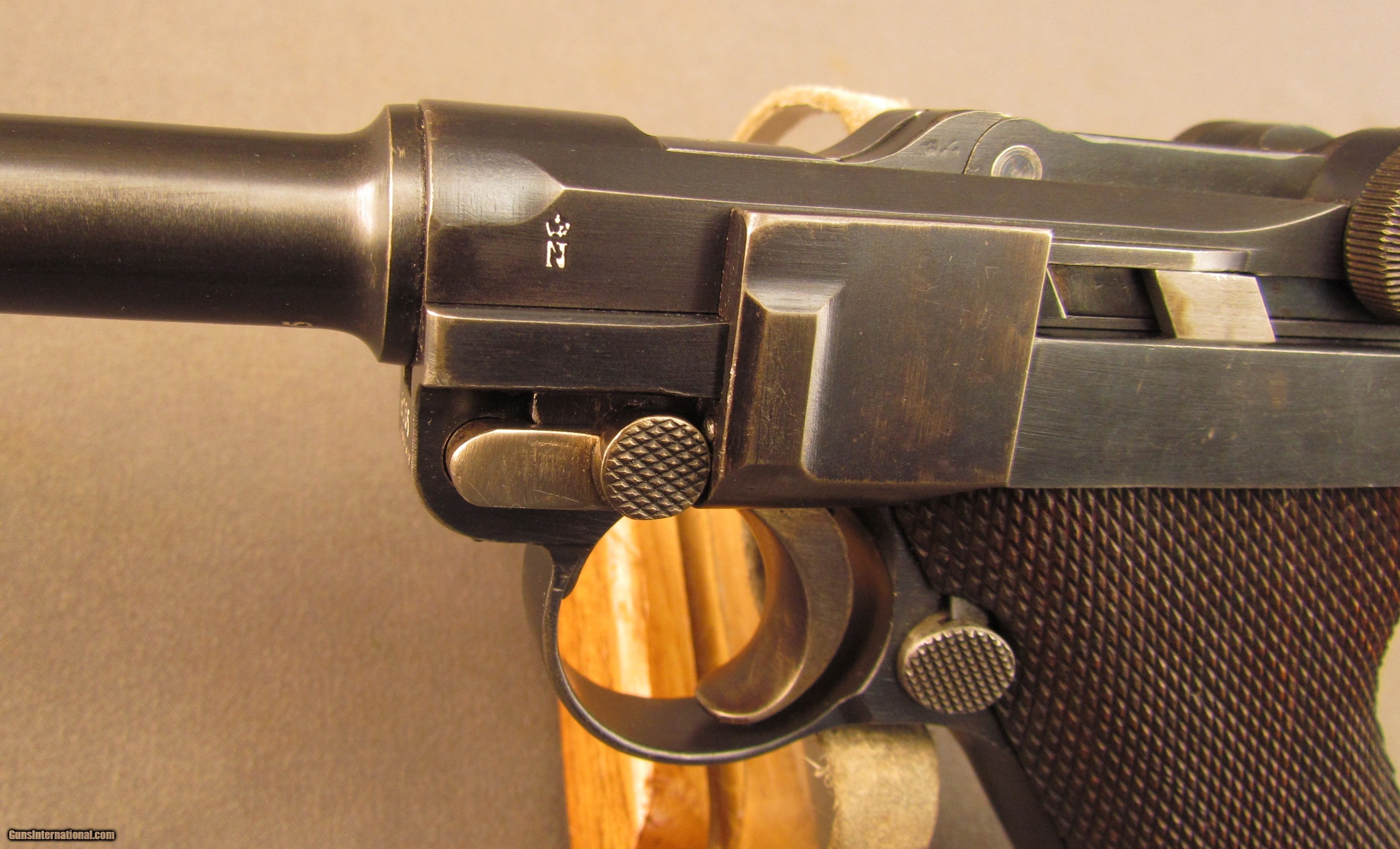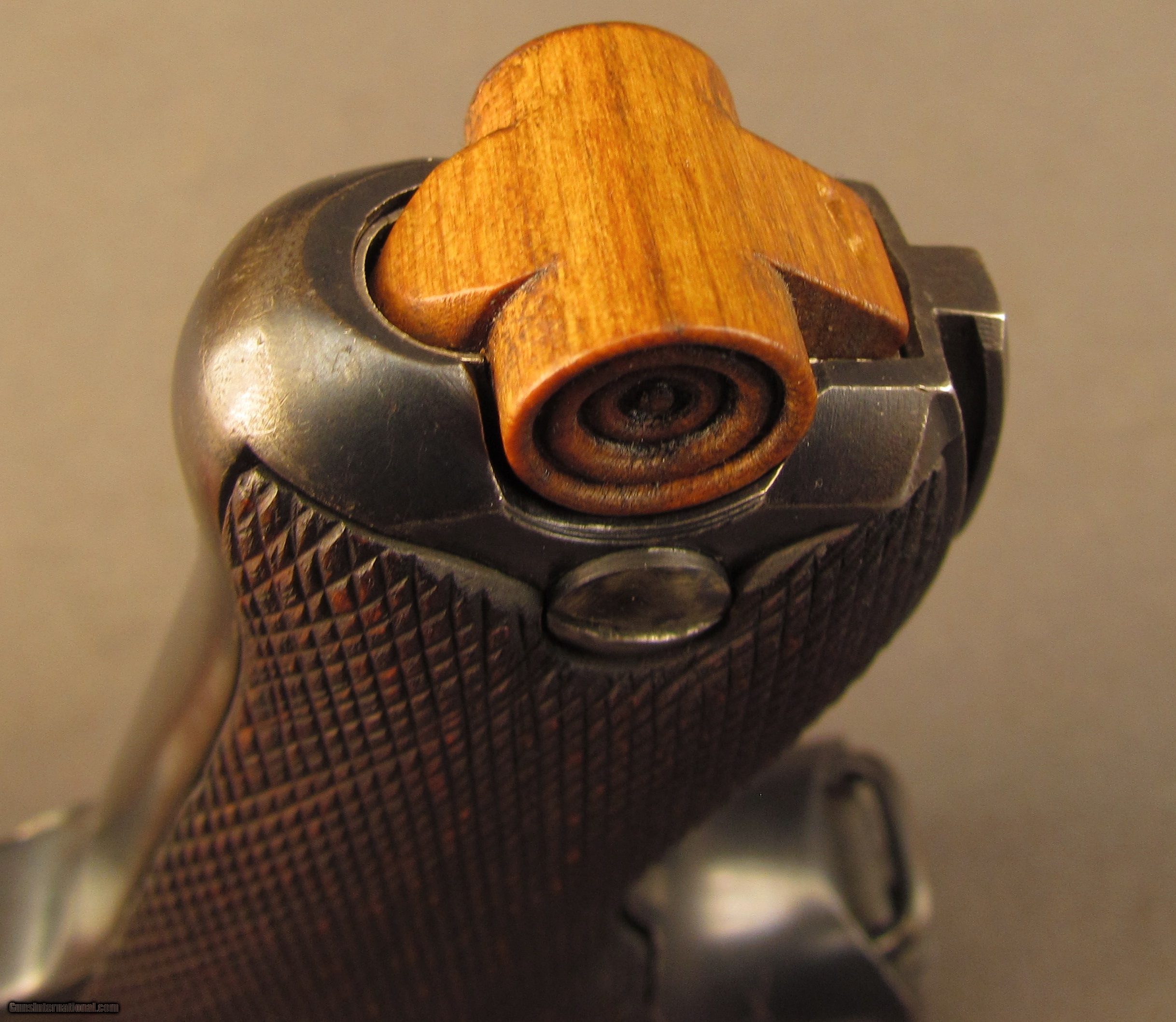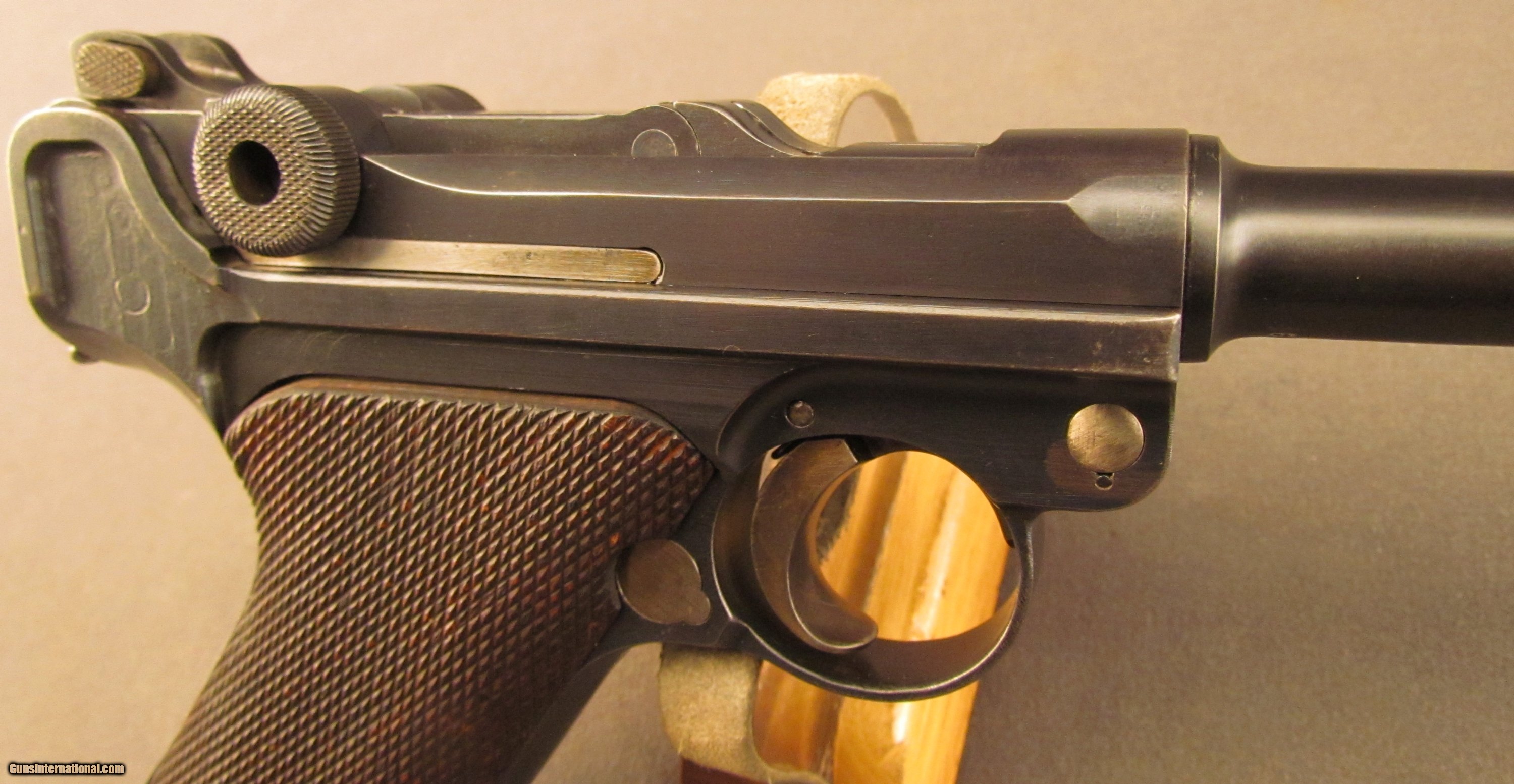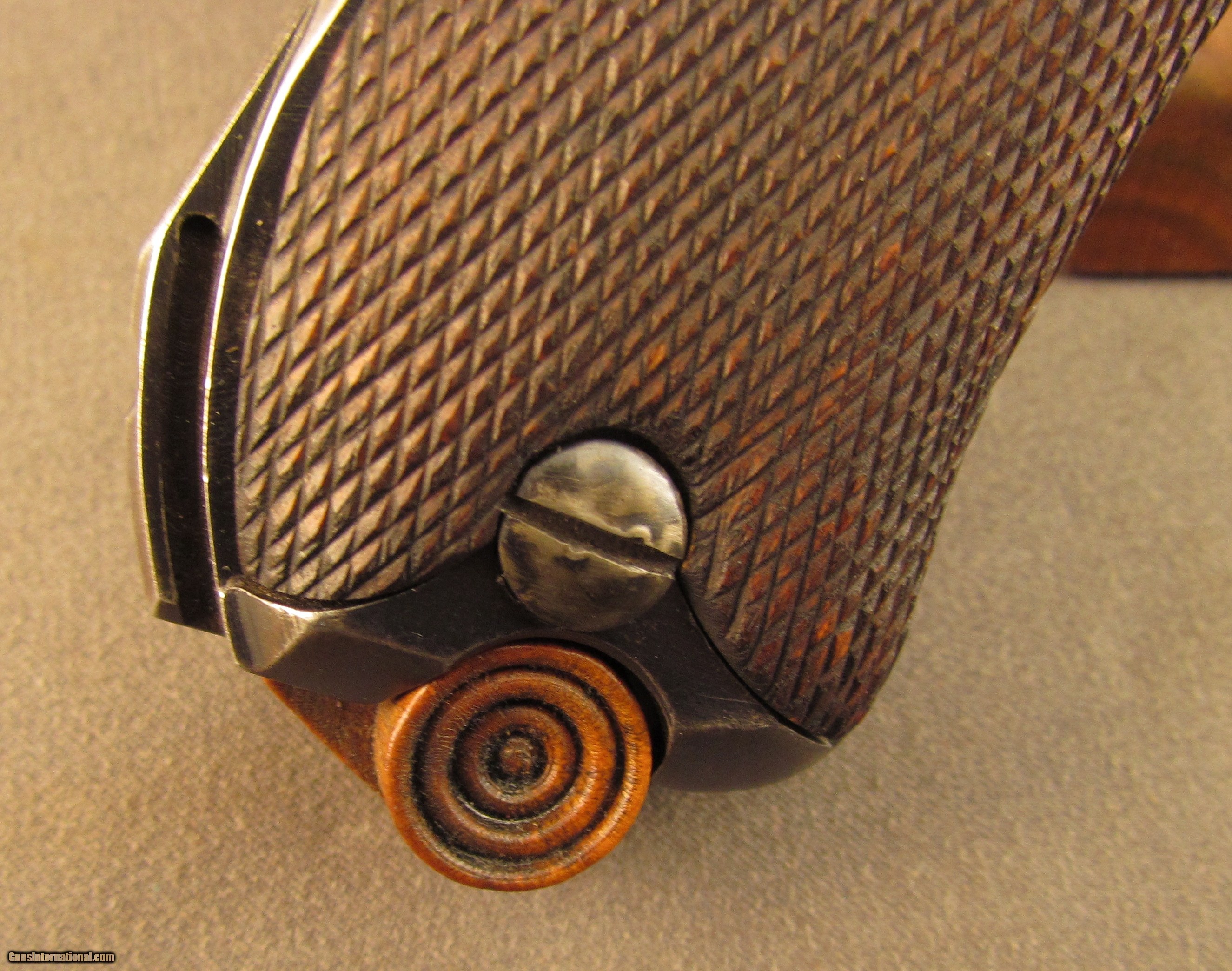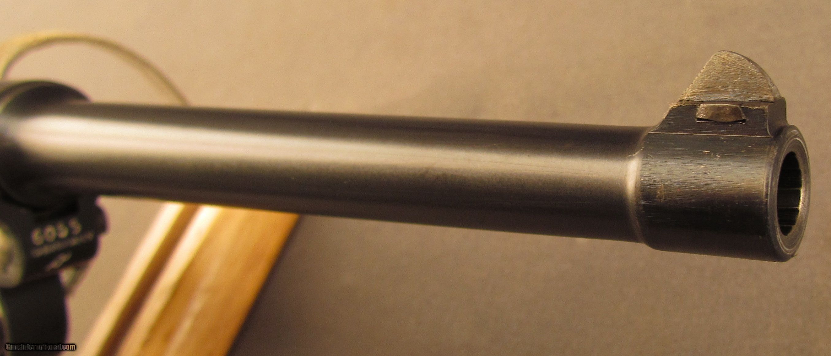 Description: Serial #6055o, 9mm Para., 6" barrel with an excellent, bright bore. This pistol has all matching numbers with the metal retaining 90-92% of the original blue finish that has silvered at the muzzle, as well as along some of the projecting edges and surfaces. There are some scattered specks of light surface freckling, but these are very minor without any pitting present, and there is some further fading on the gripstraps. The trigger, take-down lever, magazine release, and safety retain most of the original straw color, but the ejector has turned mostly bright gray. The checkered walnut grips are both in fine shape with few handling blemishes and only light flattening of the points. A reproduction Navy magazine with concentric circle wooden base is included. The 1920 Navy Commercial is a very rare variant, and this example rates excellent condition overall. FFL or C&R SOLD Curio/Relic: Yes Manufacturer: DWM Model: Luger Serial Number: 6055o Caliber Info: 9mm Gauge Info: 9mm |