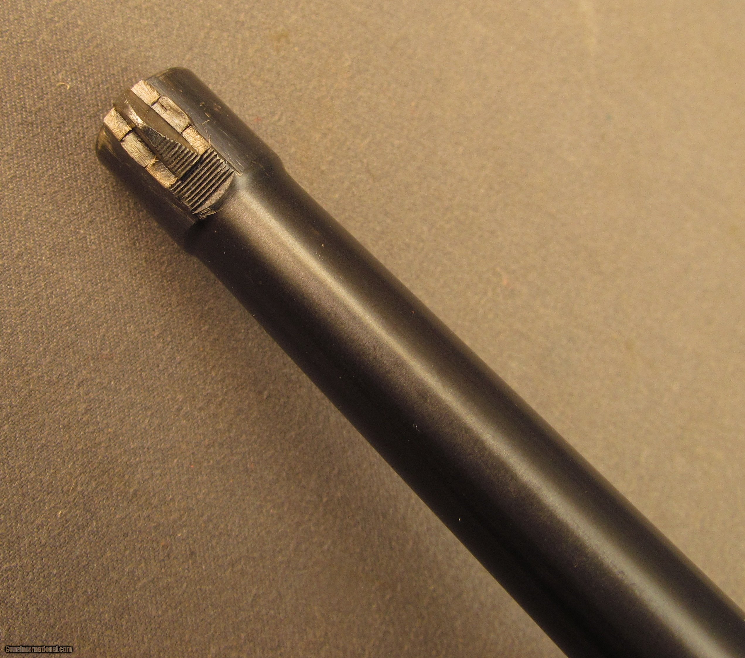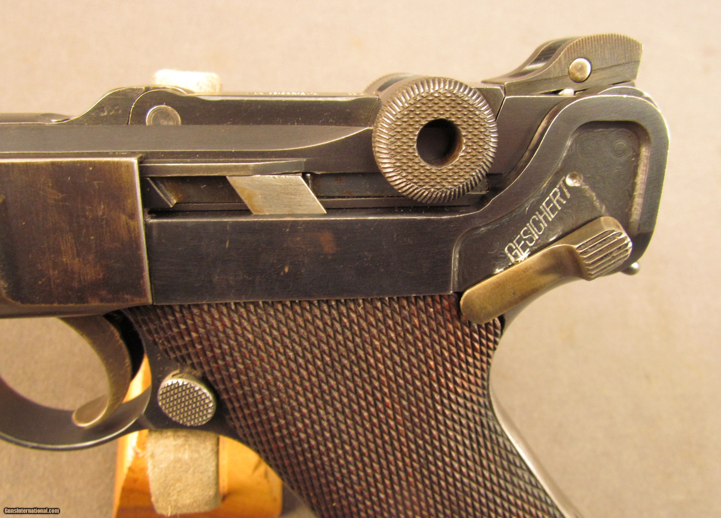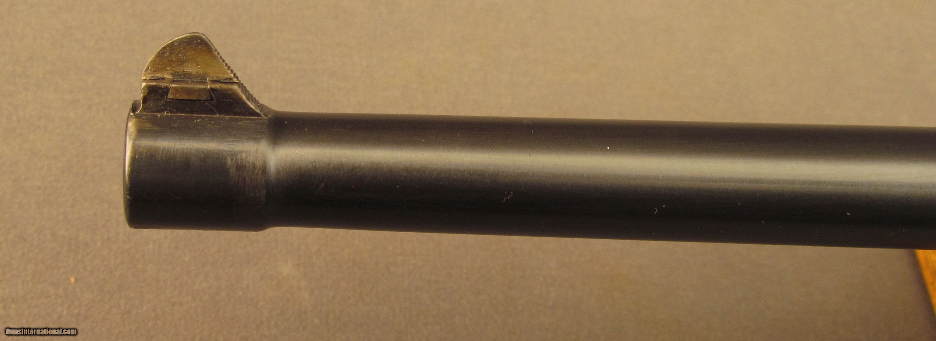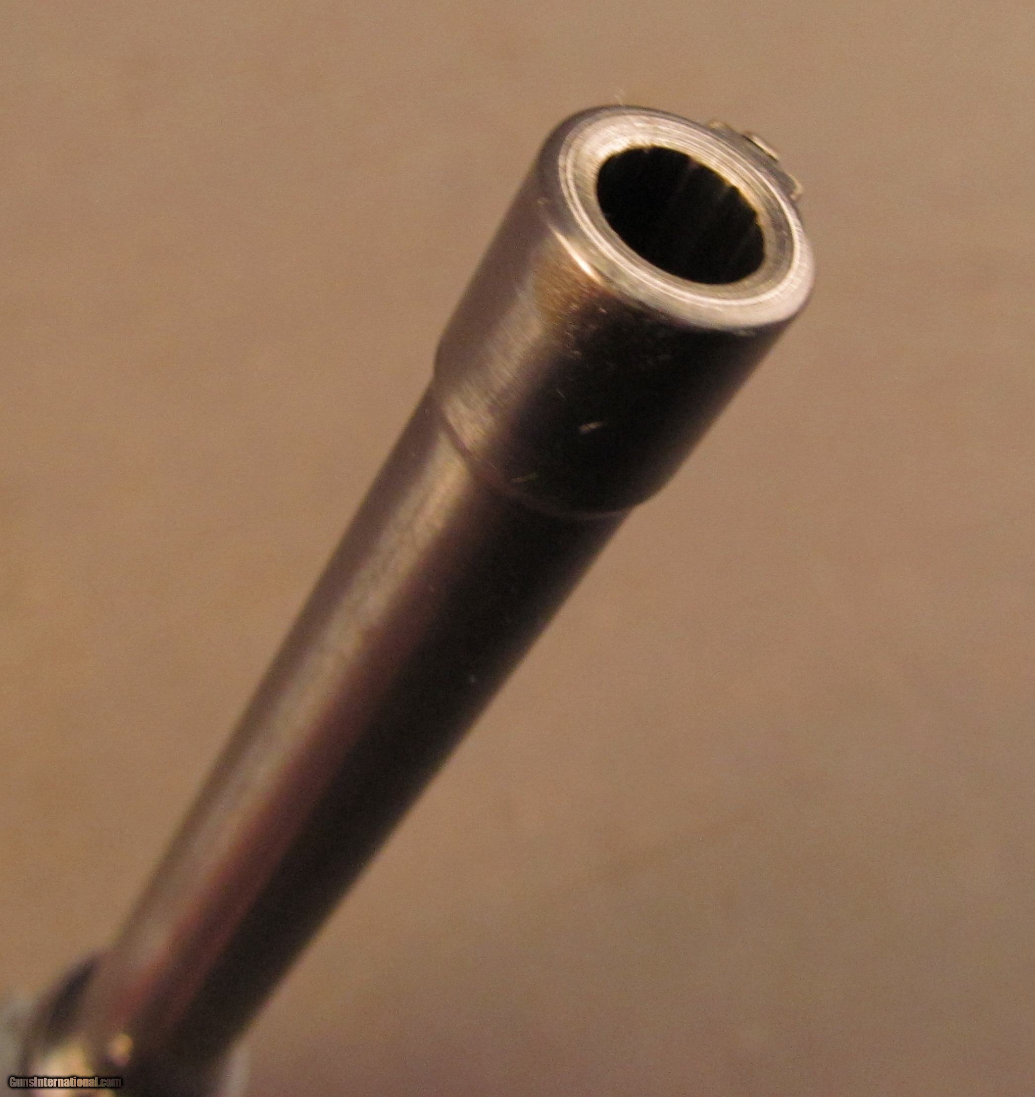 Description: Serial #6055o, 9mm Para., 6" barrel with an excellent, bright bore. This pistol has all matching numbers with the metal retaining 90-92% of the original blue finish that has silvered at the muzzle, as well as along some of the projecting edges and surfaces. There are some scattered specks of light surface freckling, but these are very minor without any pitting present, and there is some further fading on the gripstraps. The trigger, take-down lever, magazine release, and safety retain most of the original straw color, but the ejector has turned mostly bright gray. The checkered walnut grips are both in fine shape with few handling blemishes and only light flattening of the points. A reproduction Navy magazine with concentric circle wooden base is included. The 1920 Navy Commercial is a very rare variant, and this example rates excellent condition overall. FFL or C&R SOLD Curio/Relic: Yes Manufacturer: DWM Model: Luger Serial Number: 6055o Caliber Info: 9mm Gauge Info: 9mm |