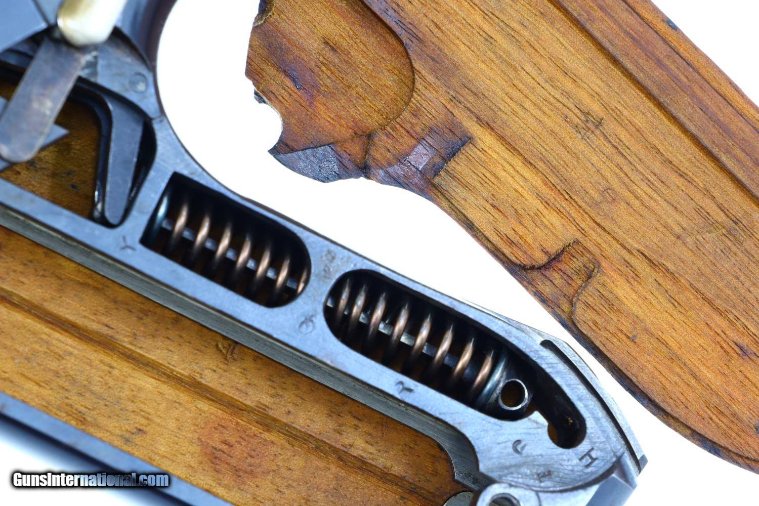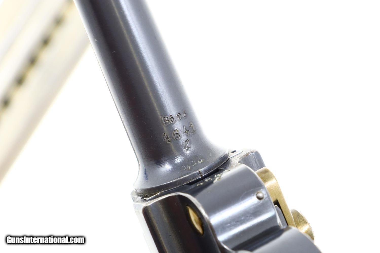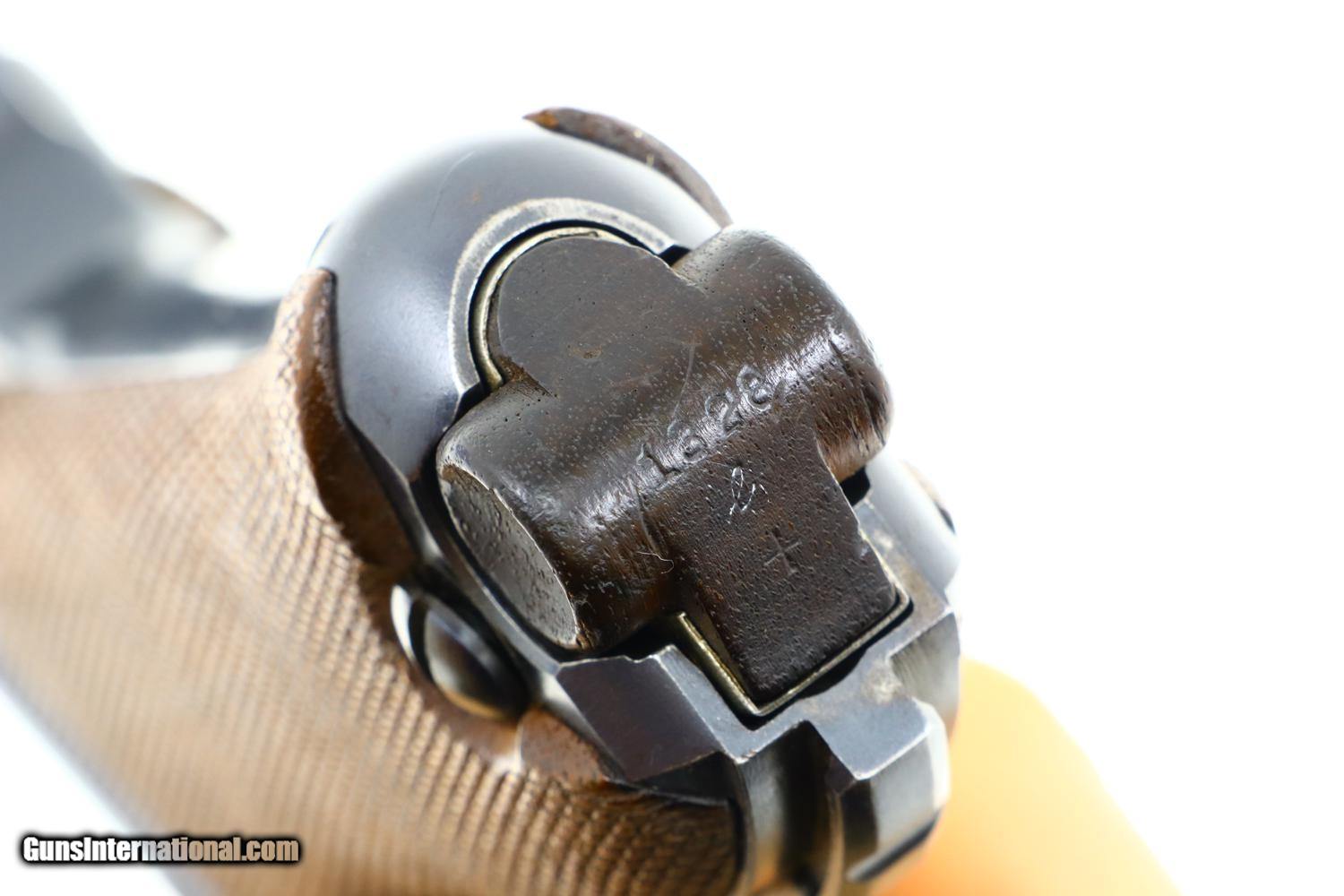 Description: Standard configuration DWM Luger, cal 9mmP, made in 1913, with fixed sights, 4” barrel, 1913 dated chamber and intertwined DWM on front toggle link. Full serial number on front of frame, under barrel, and left side of receiver (letter suffix omitted). Last two digits on all the usual parts including each of the grips, the only exception being the magazine, from the same serial block, which is #1328b. Usual marking around extractor, safety and inspection marks on the right side of the barrel extension including the Imperial Eagle. Synopsis: DWM, German Luger, 1913 Dated, Military, 4641b, A-1808 Condition: Excellent original rust blue estimated at 95-97%. Strawed parts have all been touched up to match. Excellent original grips with slightly blunted checkering. No cracks or chips. VG-EXC magazine with oil darkened plug. Bright bore with sharp rifling, light etching. Perfect manual mechanics. An excellent German Military Luger made just before WWI, used throughout the war, extremely difficult to find in high condition. ~~Insured shipping fee of $65; most packages shipped using FedEx 2nd Day.~~ SOLD Curio/Relic: Yes Manufacturer: DWM Serial Number: 4641b Caliber Info: 9mmP |