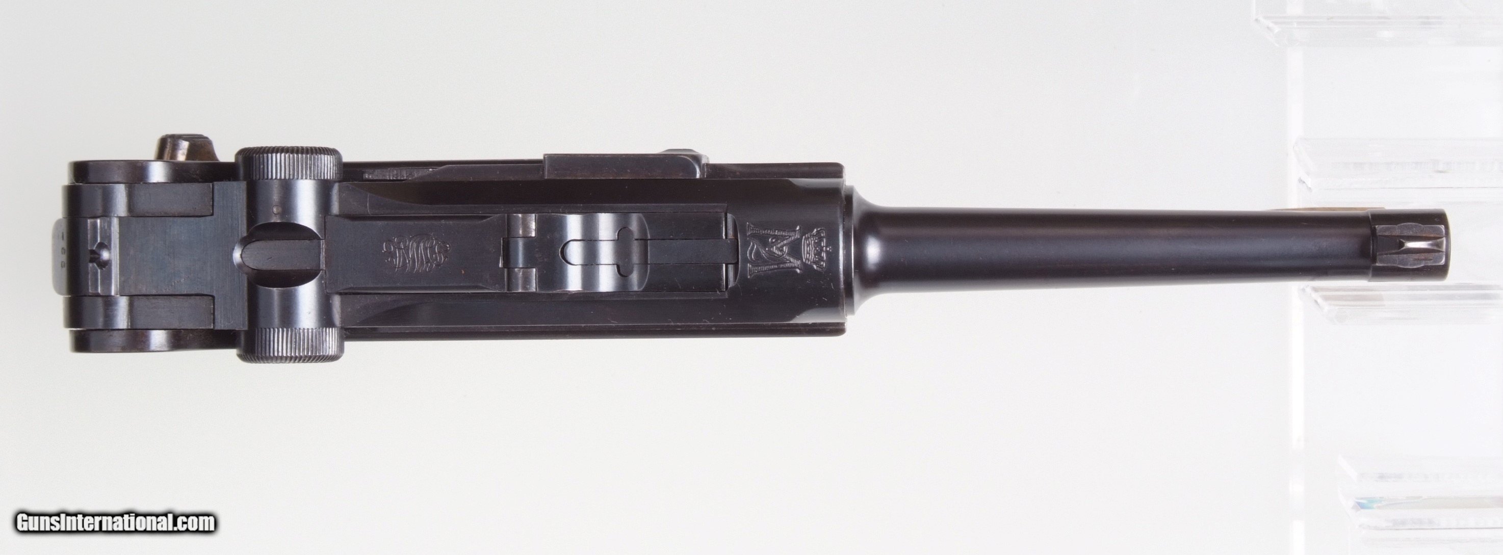 Description: Standard configuration M1906 M2 Luger with 4.75” barrel with drift adjustable front sight and fixed rear sight. Deeply impressed Crown/M2 over chamber and intertwined DWM on middle toggle link. Encircled triangle, the Portuguese proof, under barrel, on left side of receiver, back of frame, and on magazine plug. Full serial number under barrel and forward frame with last two digits repeated on all appropriate parts except for the left grip that is numbered with a large “5”. Major components are rust blued; strawed parts include takedown lever, trigger, safety, extractor, and magazine release. Toggle pins and grip screws fire blued. Checkered walnut grips. Original magazine with bright body and wood base. Correct style black holster, likely an old reproduction, with no accessories. Synopsis: Excellent DWM 1906 M2 Portuguese Luger with original magazine and correct style holster. Condition: Approximately 97% original blue with sharp edge wear in expected places. Small ding on front strap. Strawed parts show more wear, as customary for issued pistols. No suggestion of any touch-up. Comparable condition grips and magazine. Bright bore with sharp rifling. Perfect manual mechanics. Near excellent holster with supple leather and intact stitching. A very nice M2 with no import marks! A HISTORIC INVESTMENT! ~~Insured shipping fee of $75; most packages shipped using FedEx 2nd Day.~~ SOLD Curio/Relic: Yes Manufacturer: DWM Serial Number: 3766 Caliber Info: 7.65 mmL |