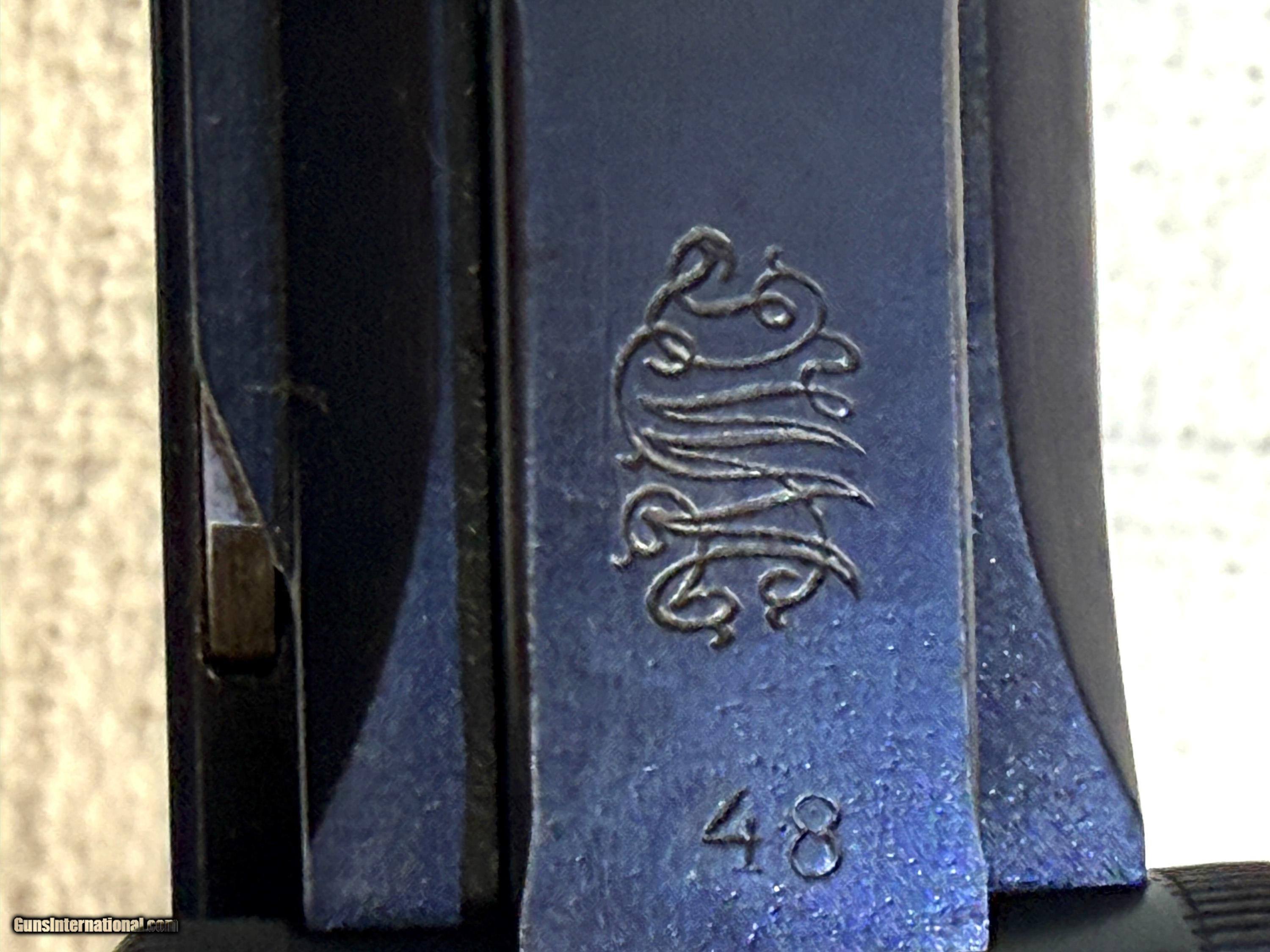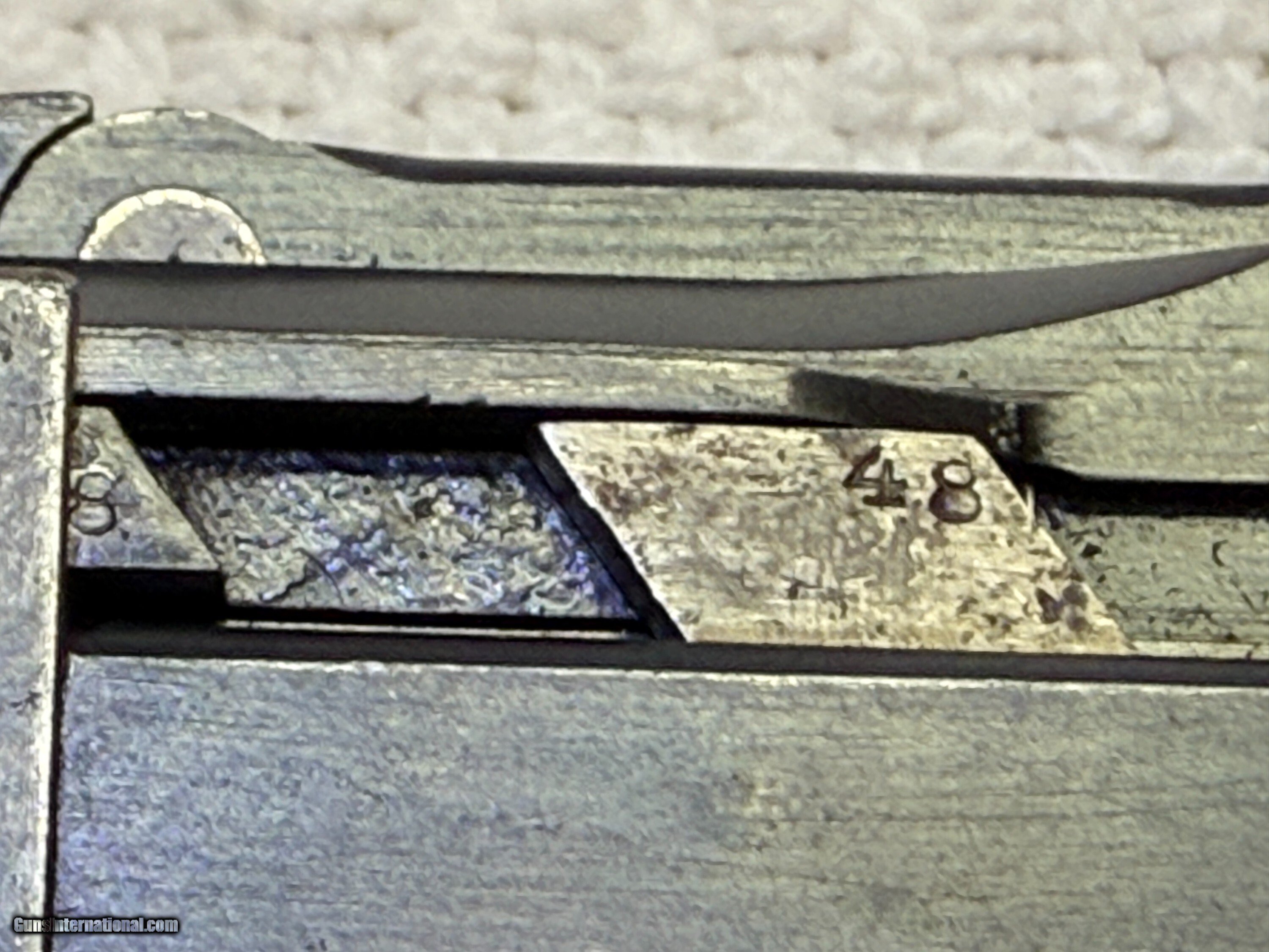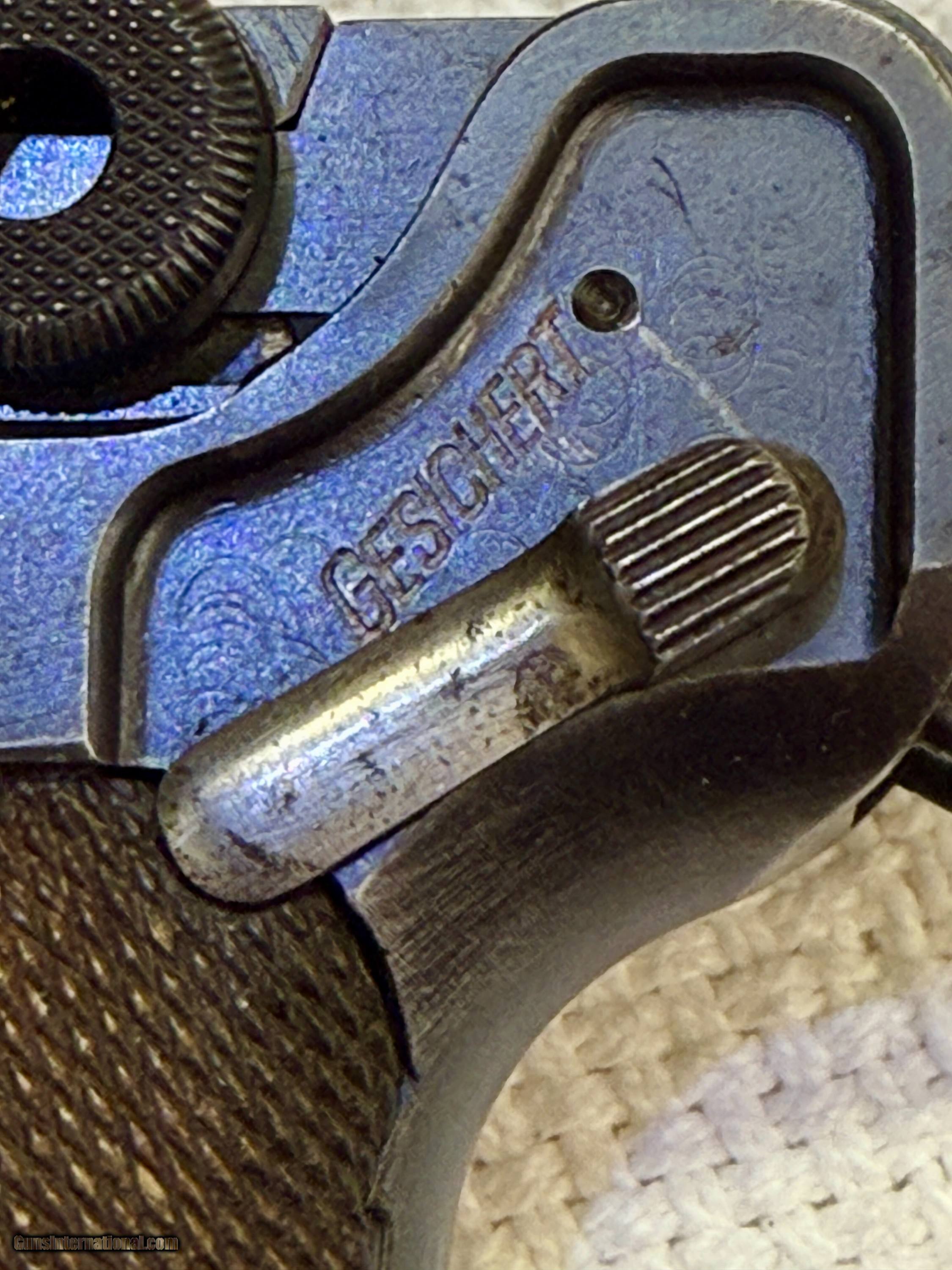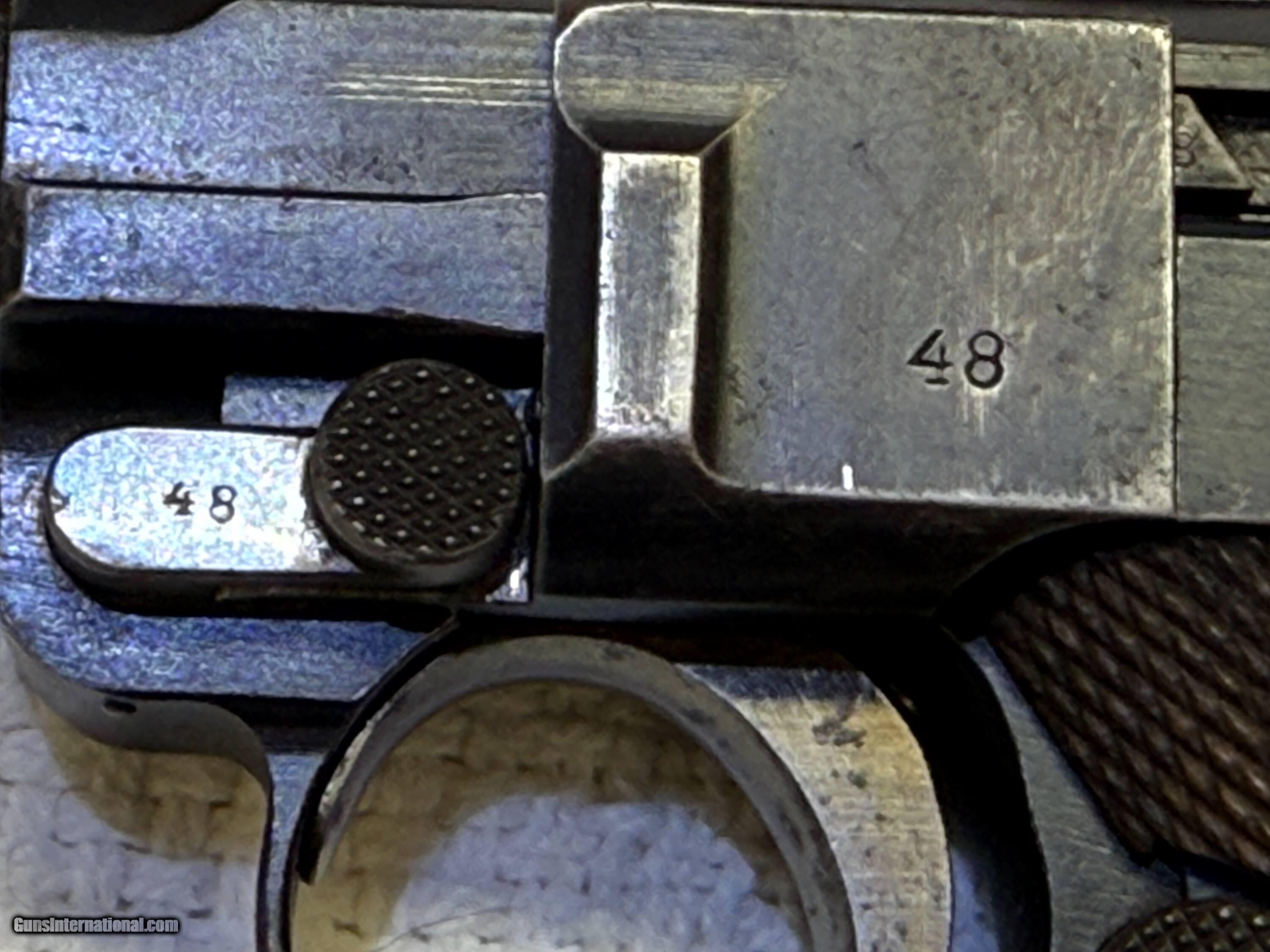 Description: Here we have a DWM commercial sales 9mm luger, clean, shiny bore, still has good rifling, retains 70-80% of its origional bluing. This luger would be a nice addition to a collection. Curio/Relic: Yes Handgun Caliber: 9x19mm Parabellum (9mm Luger, 9x19mm NATO) Manufacturer: DWM Model: Luger Serial Number: 4148 Barrel Length: 3.9 Bore Info: Good Condition: Good Metal Condition: Good Wood Condition: Good Bore Condition: Good Price: $1,250.00 Contact Seller |