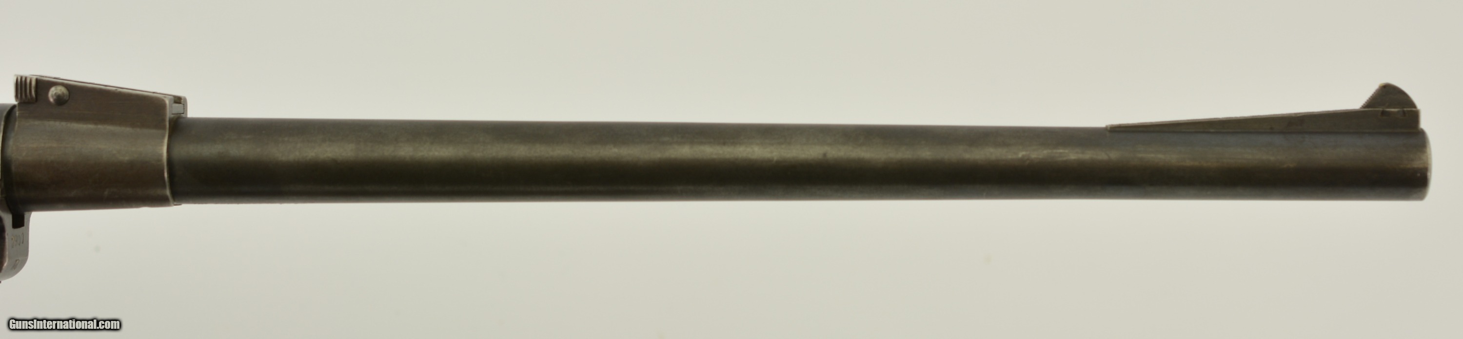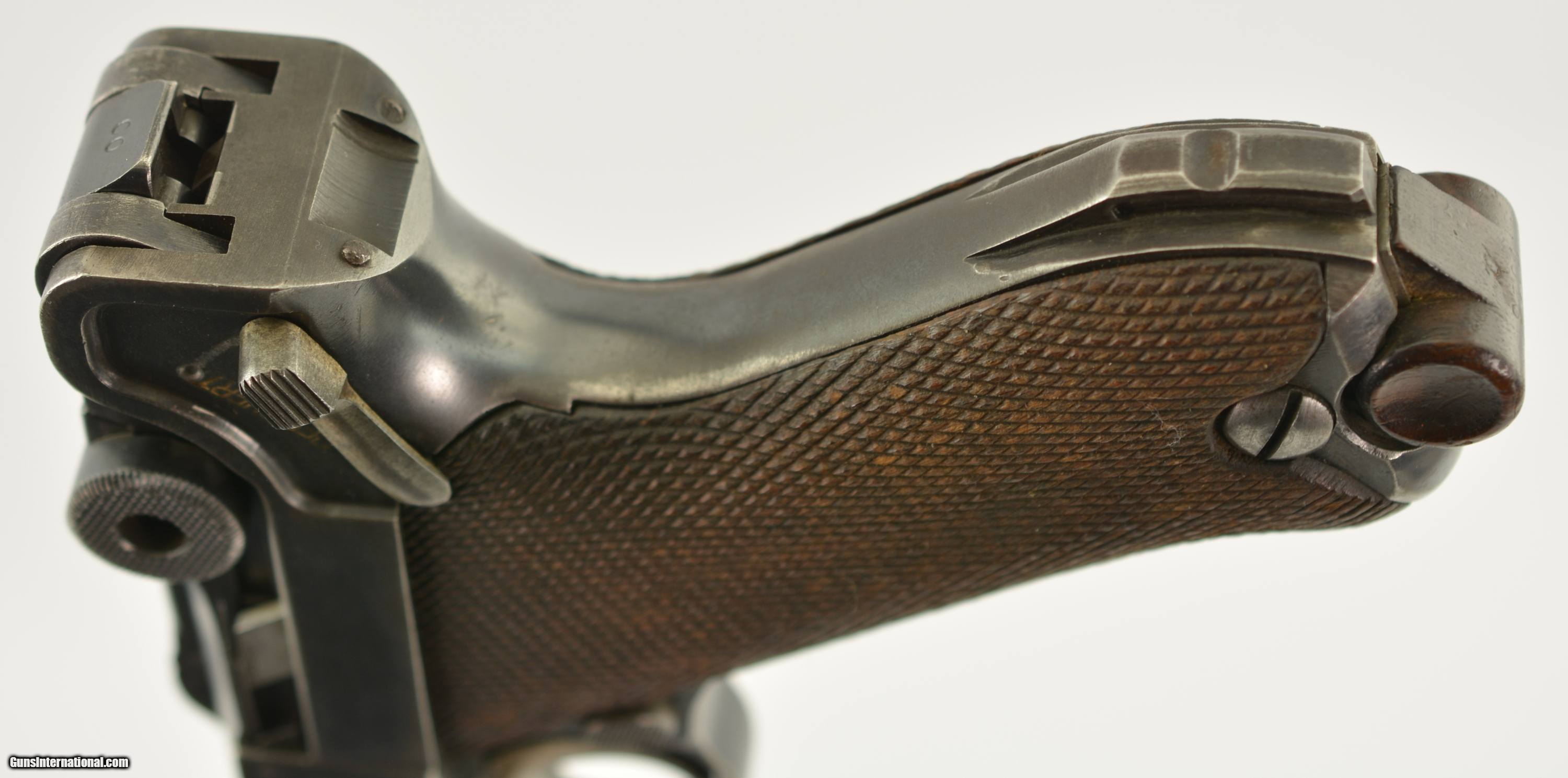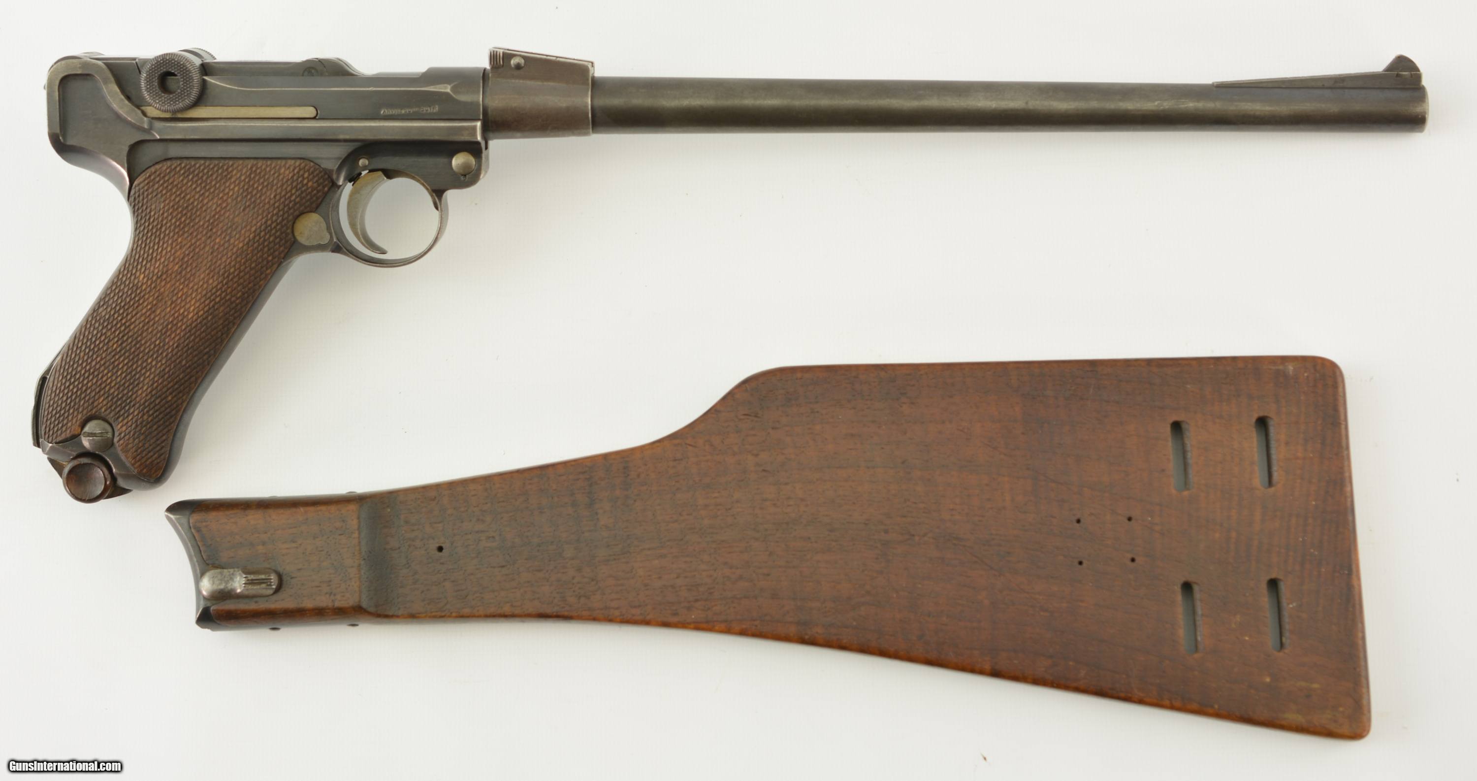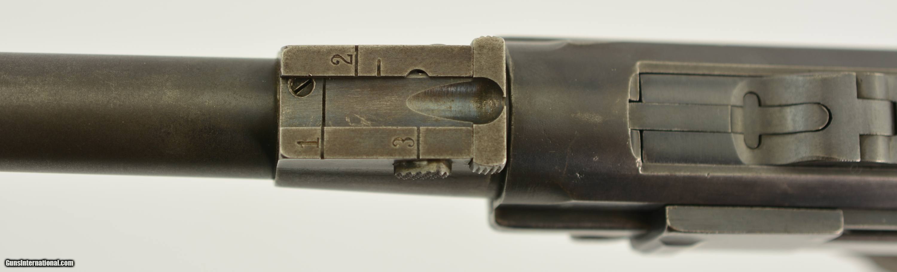 Description: Serial #3900m, 7.63mm Para. (.30 Luger), 11 3/4" barrel with a fine, bright bore that has a few tiny spots of freckling within the grooves. This is one of the rare parts guns that uses a typical commercial 1908 model Luger frame and receiver mated to the long, carbine barrel with carbine rear sight. The “GERMANY" marked barrel has a pale gray-brown patina with about 40-50% of the original blue remaining, and a small post-'68 import stamp on the underside just ahead of the rear sight base. No forend tenon is installed. The frame retains about 75-80% of the original blue with silvering and gray fading along the high edges, bearing surfaces, and some flaked added black finish on the top of the rear toggle link where the original fixed rear sight was ground flush. The trigger, magazine release, takedown lever, safety, and ejector have traces of original straw color remaining with the balance turned either darkly freckled, or fairly bright gray. The walnut grips are in very good condition with some light handling marks and some moderate flattening of the points. A period “washboard" style shoulder stock accompanies the pistol that has an unnumbered stock iron and rather attractive striped grain. The stock is in excellent condition with only some small handling marks and minor blemishes in the original oil finish. Additionally, a single, mismatched, wood-base magazine is included. This is a very nice carbine conversion and rates very good condition overall. Ref. "Luger Variations Vol 1." By Harry E. Jones Pg 158-159. FFL or C&R SOLD Curio/Relic: Yes Manufacturer: German Model: Luger Serial Number: 3900m Caliber Info: .30 Luger Gauge Info: .30 Luger |