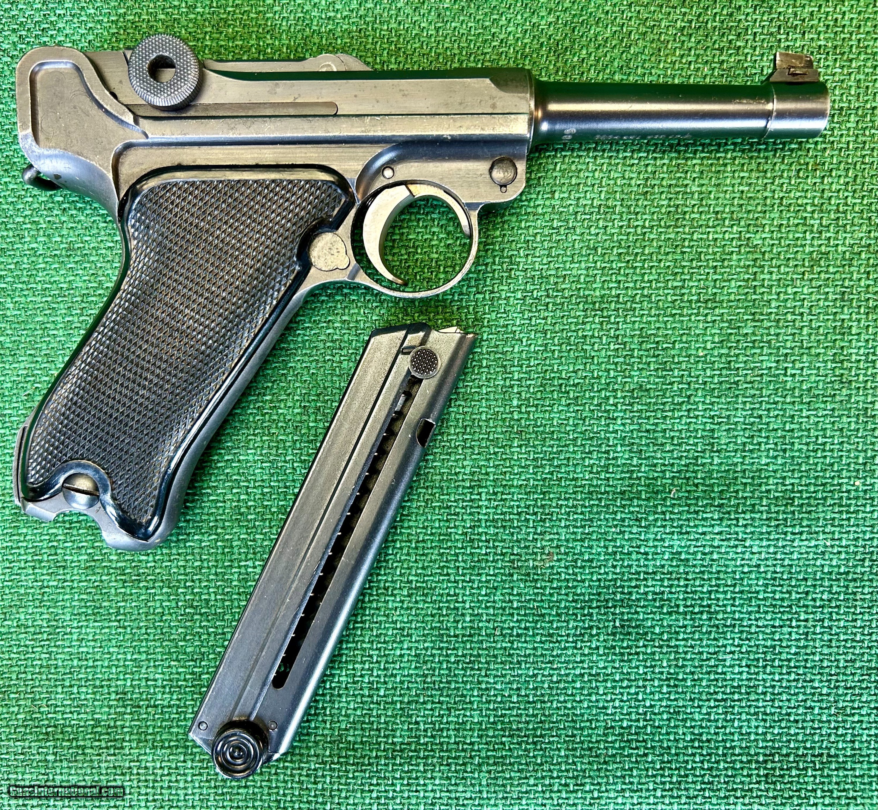 Description: Finn contract Luger still in original .30 Luger. This particular pistol carries the SA stamp on receiver showing its Finland ownership. Barrel and receiver serial numbers match. This example also is equipped with the black composite grips and magazine stopper that are made in Finland. All plastic is crack-free. Bore is bright and shiny which is common for Finn weapons. This firearm also retains 90% of its Finn bluing. Shoulder stock cuts are present in the heel area of the grip. Please see pictures for details. We accept USPS Money Order, cashier’s check, or credit card for immediate shipping. Please note credit card sales are subject to an additional 3% fee. US shipping only. Shipping costs are actual postage, with adult signature required, to your FFL 01 or 03. We will pay the insurance for the amount sold. All items are for sale locally, so make contact as soon as you make your decision. Inquiries will be handled in chronological order. All postings will remain active until funds are received. We appreciate funds to arrive within 10 days of verbal agreement. After such time we will entertain other inquiries in the order they were received. SOLD Curio/Relic: Yes Handgun Caliber: 7.65x22mm Parabellum (7.65x22mm Luger, .30 Luger) Manufacturer: DWM Model: M23 |