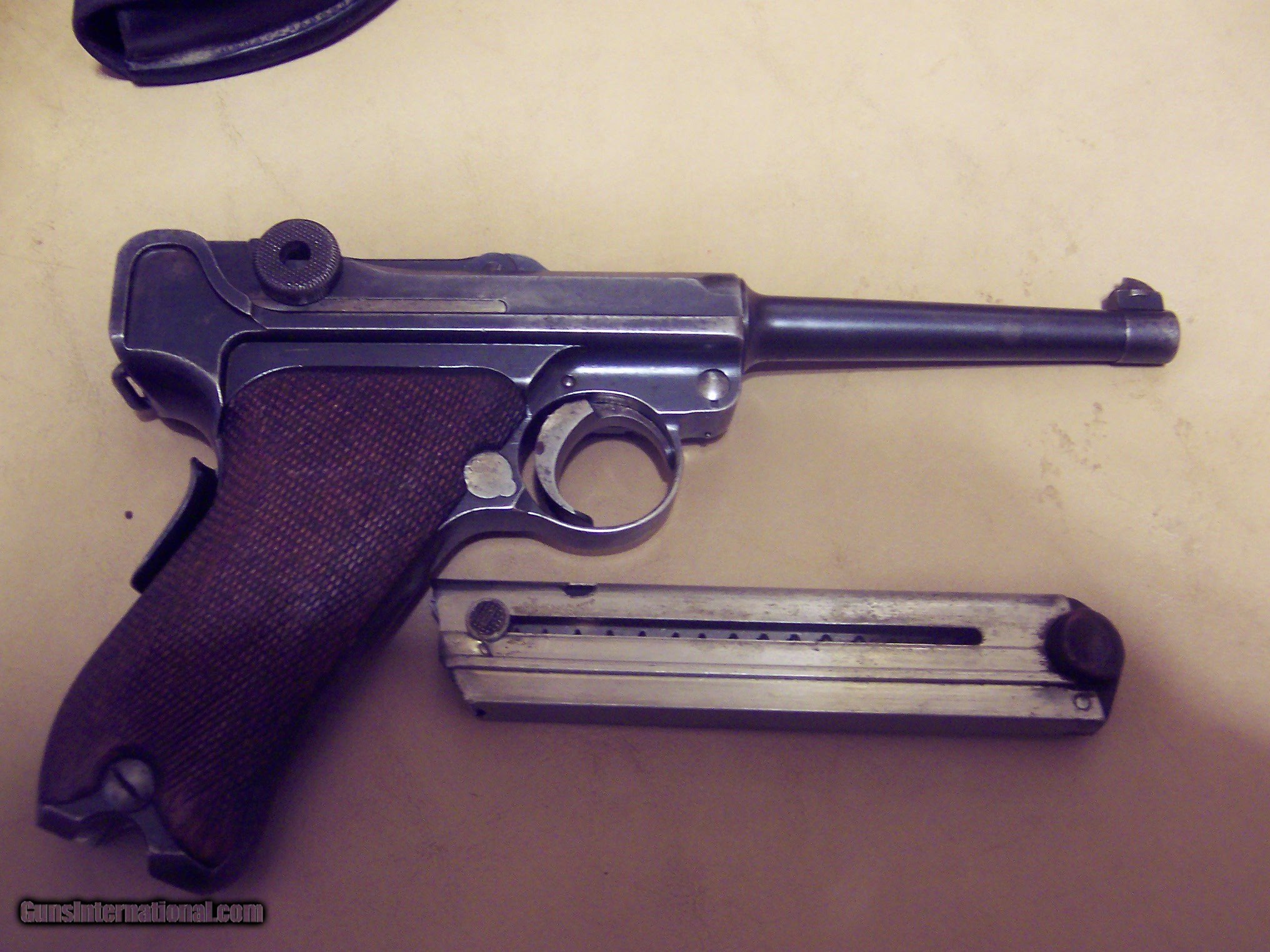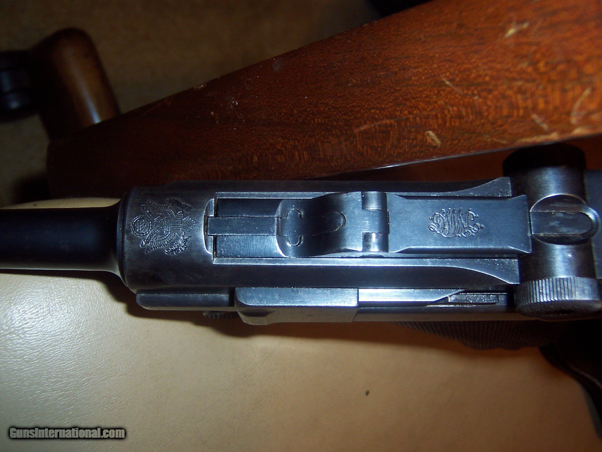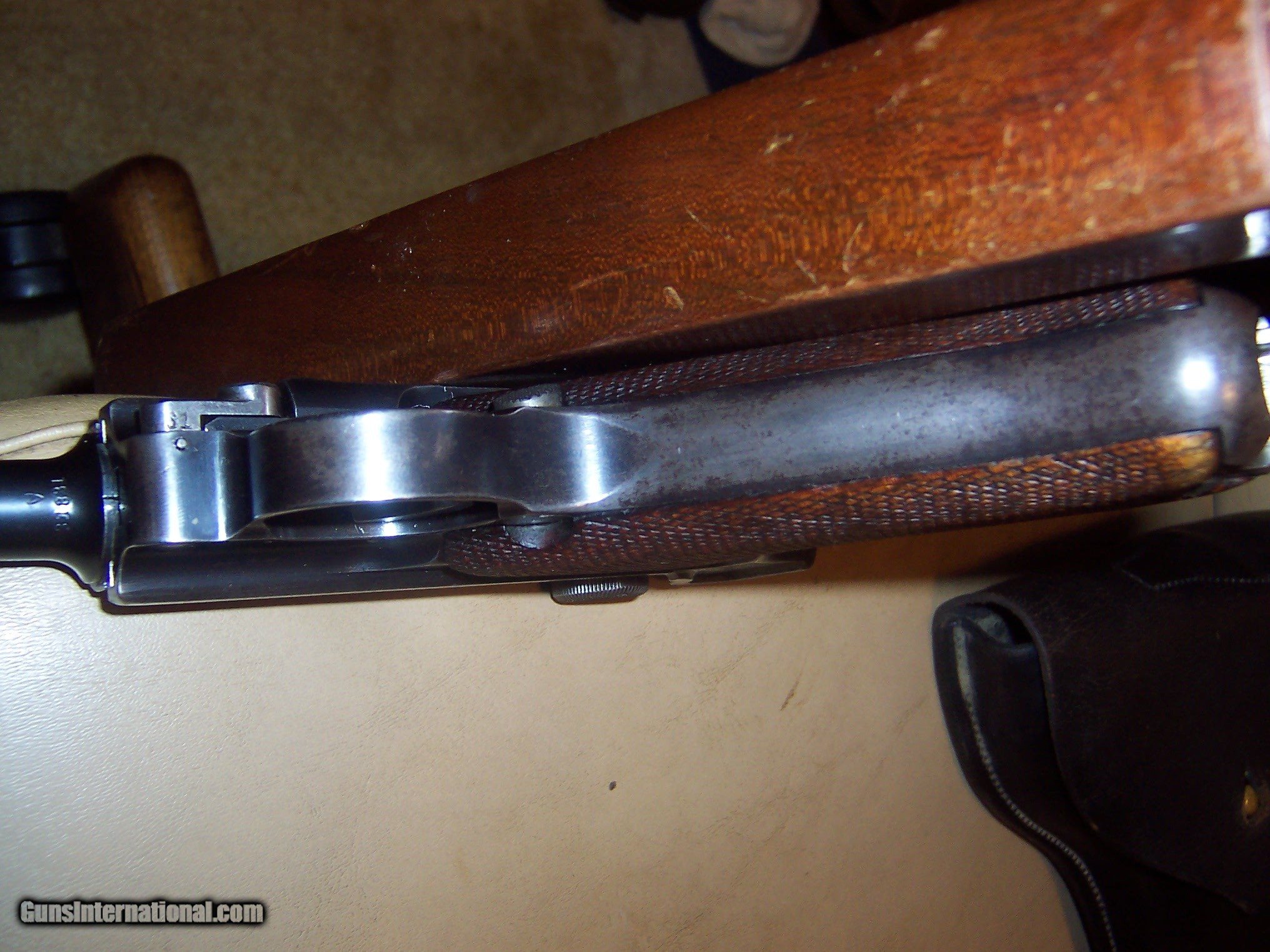 Description: 1906 american eagle 30 luger caliber,, fine bore ,,, loaded marked extractor,, ,85 % origina blue , small chip in grip under safety, straw HAS SILVERED OUT no mark under safety LEVER ,, serial # 31831 , germany marked on front of frame all visable numbers match ,,, i have not taken down to check numbers inside, no marks on magazine wood base SOLD Curio/Relic: Yes |