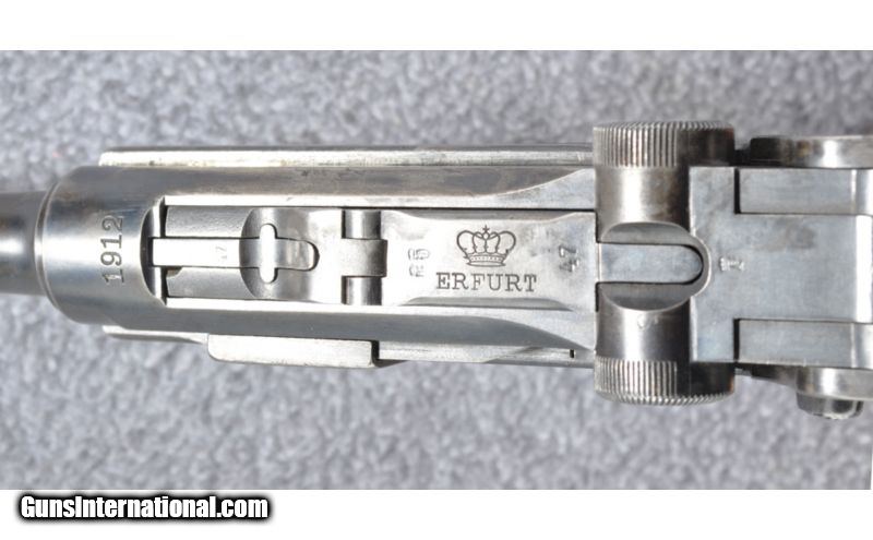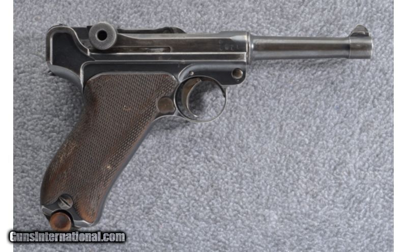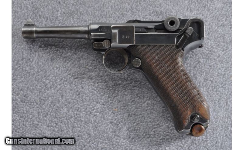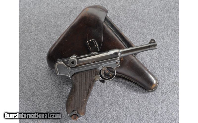 Description: All matching numbers external with wooden bottom magazine SOLD Manufacturer: 1912 Caliber Info: 9mm Luger Metal Condition: Shows holster wear and original finish fading to a gray patina. Light pitting near the muzzle and a few spots on the frame Wood Condition: Grips show moderate handling wear Bore Condition: Good Barrels: 4 Triggers: Single Action Stock: Checkered walnut Weight: 32 oz Sights: Fixed rear dovetailed front blade Extras: Leather holster, appears to be period correct Item Location: Grand Junction, CO |