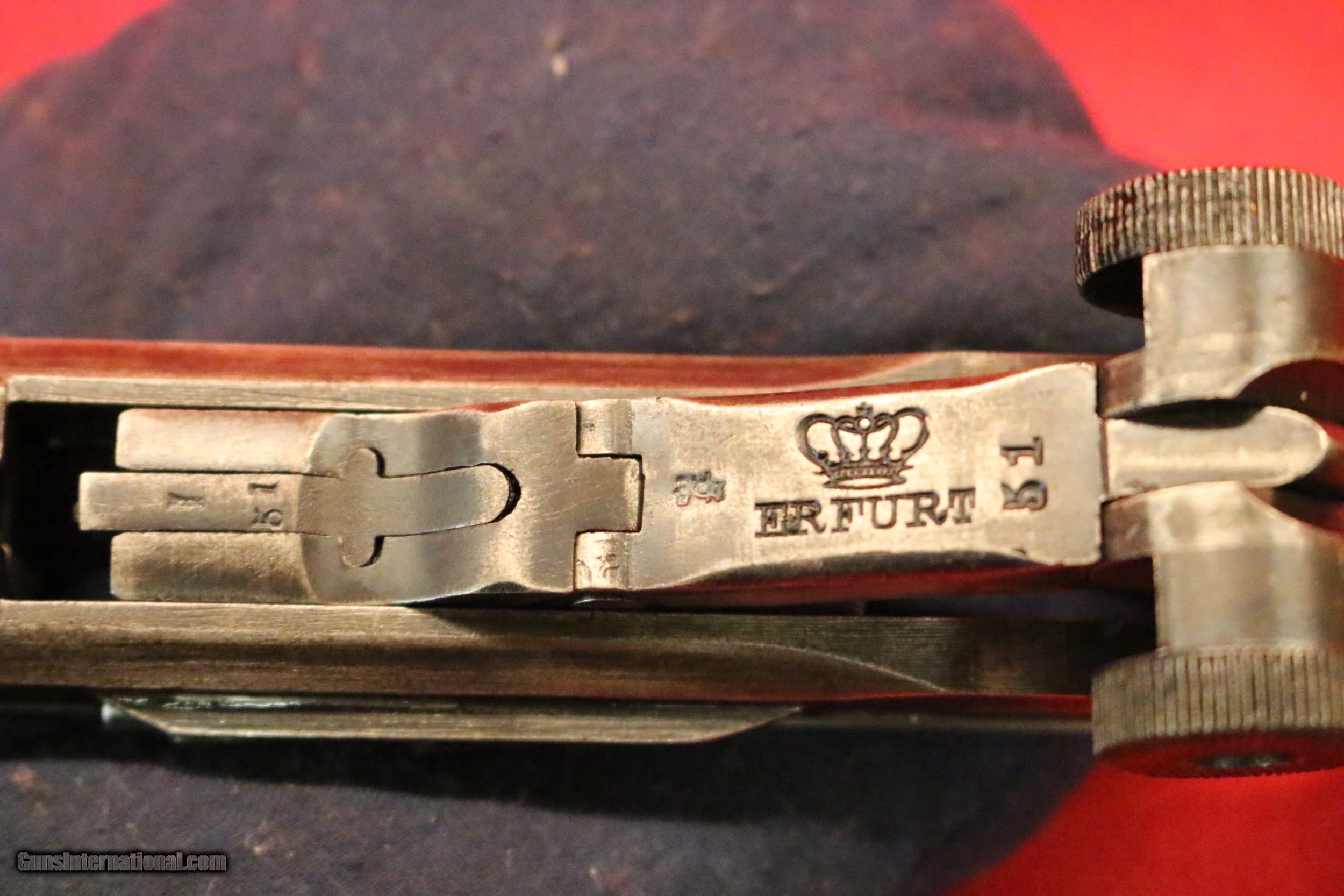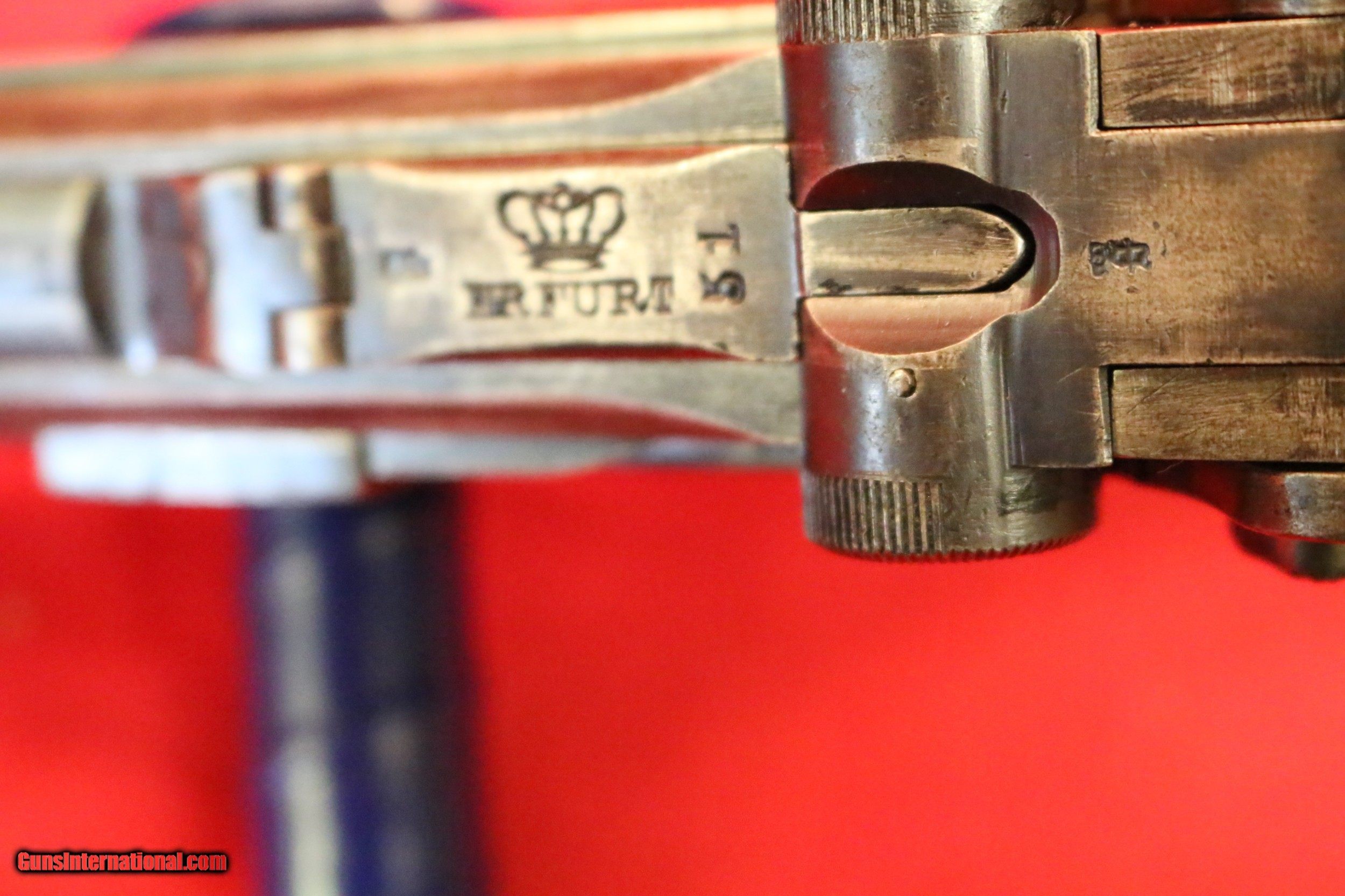 Description: Very much a survivor without any modifications. i block srial number. bore is shootable with some frosting in the grooves. All numbers matching including the wood based magazine. Correct proofs and inspectors marks. Blue is thinning as shown. The gun exhibits normal wear and teat for being 103 years old and seen service in at least one war. No import marks. Numerous photos. No signs of being refinished just honest wear. Original grips. Left panel has a small amount of wiggle. The original mage may need some attention as it want to press down a touch when the bolt is closed. Nice addition to any collection. Shipping to FFL or C&R. SOLD Curio/Relic: Yes Manufacturer: Erfurt Model: P)* 1917 |