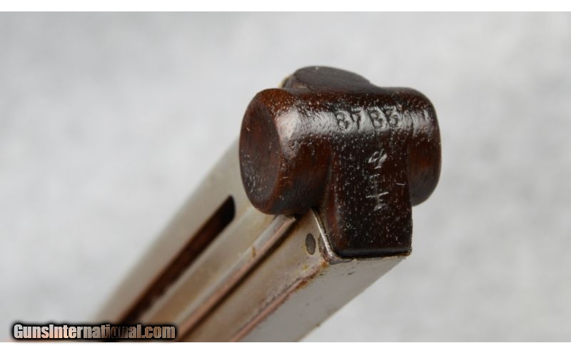 Description: SOLD Manufacturer: 1917 Caliber Info: 9mm Metal Condition: Scratches and wear from handeling, use, and holster wear Wood Condition: Right grip pannel exhibits further wear from exposure in the holster Bore Condition: Bright with light pitting in the grooves Barrels: 4 Triggers: Single action Stock: Checkered hardwood 2 piece grip pannels Weight: 31 oz Sights: Grooved rear sight with dove tailed and serrated front sight blade Extras: Includes leather holster, magazine loading tool, and 2 magazines Item Location: Billings, MT |