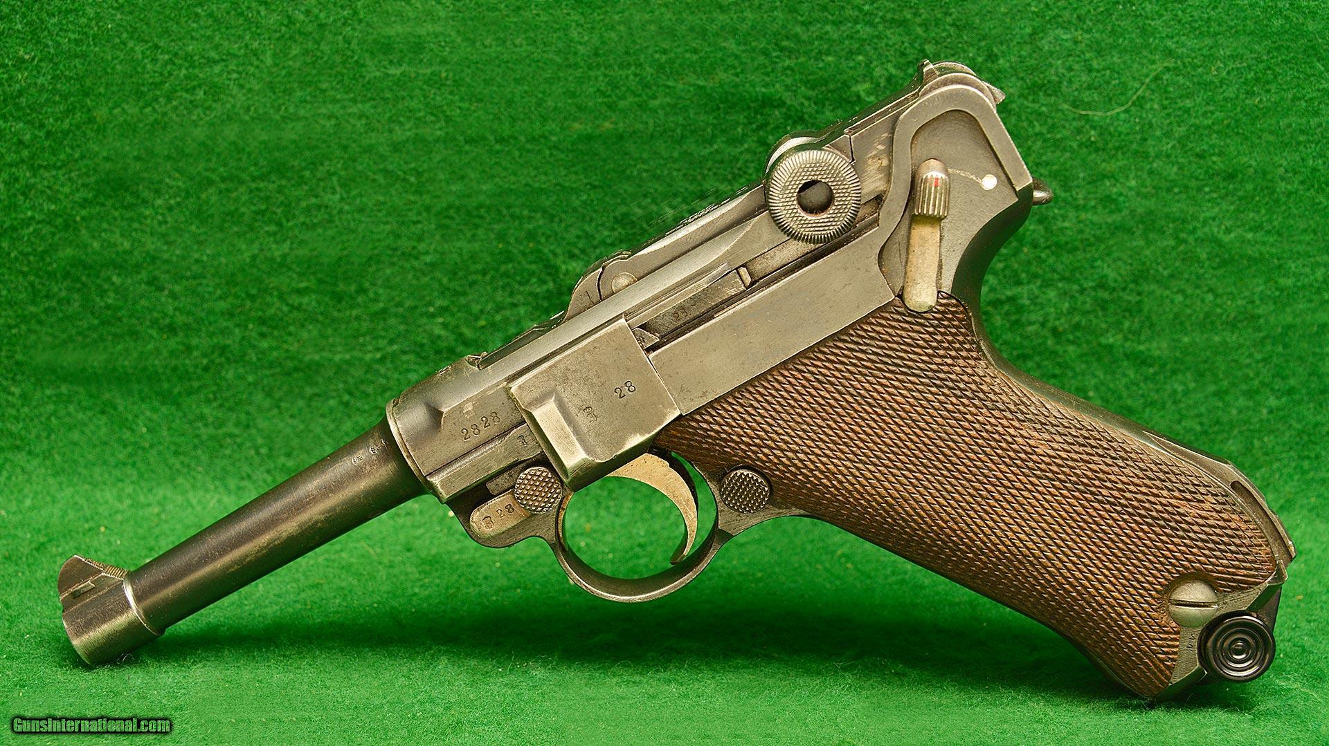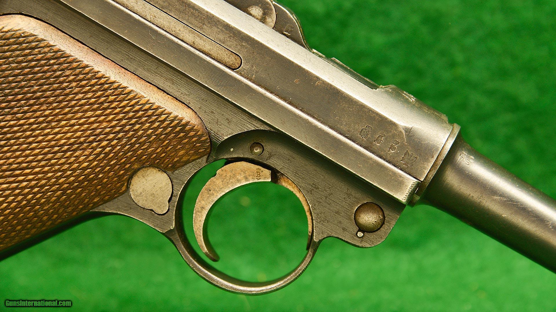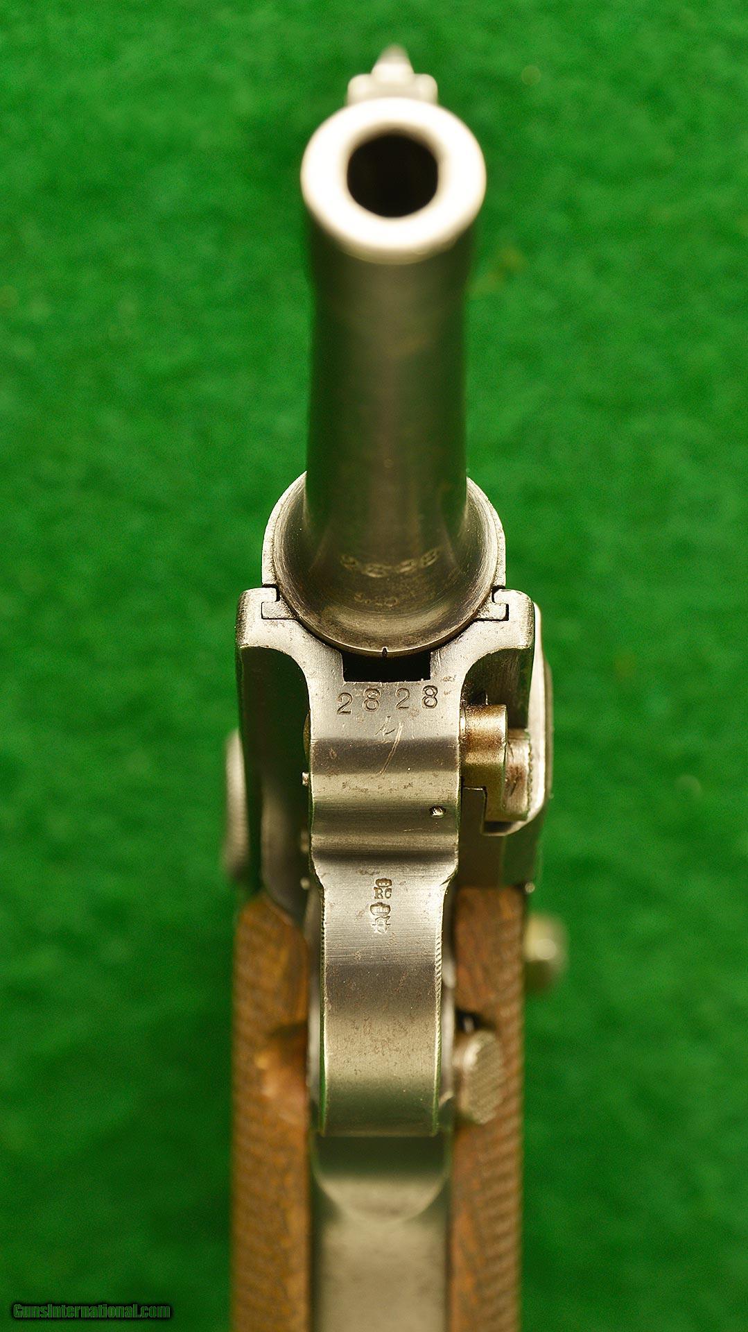 Description: This is a late World War I Erfurt dated 1917. All numbers match. Original magazine is missing and has been replaced with a modern shooting magazine. The bore has relatively strong lands but is frosted through out. A large amount of straw finish remains on the take down lever, trigger, safety and ejector spring. The grips would be considered exemplary for the age of this gun. SOLD Manufacturer: Erfurt Luger Model: 1917 Caliber Info: 9mm |