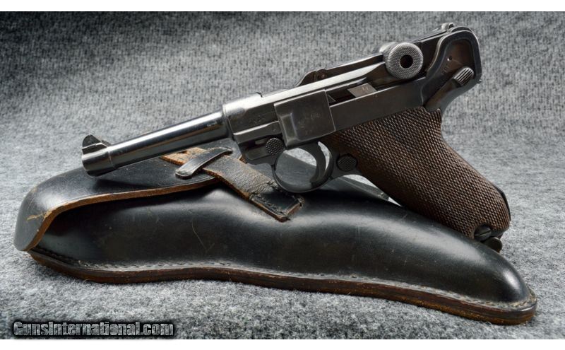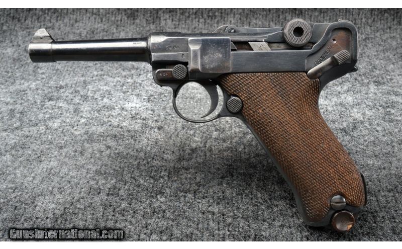 Description: Most notably known as the German sidearm for both world wars, the Luger P.08 is an easily recognizable part of history. Its sharply raked grip angle and distinctive toggle-lock design provide a unique silhouette. This particular model was a German military firearm produced by the Royal Erfurt Arsenal in 1917. Bluing and surfaces on the pistol show its age in spots; however, strong visible proof marks and matching numbers remain. Military proof marks are visible on the frame and barrel, and matching numbers are on all visible parts, including the magazine. This was an important part of the manufacturing process; manufacturing these pistols required more than a hand fitting to get them to function effortlessly, so the last 2 digits of the serial number were stamped to remove error in fitment. Arsenal proof marks are also visible that note a repair, refurbish, or modification by the Erfurt factory. This model also includes a period correct holster. This P.08, an iconic part of history, is needed for any true military arms collector. SOLD Curio/Relic: Yes Manufacturer: 1917 Caliber Info: 9mm Luger Chambers: Toggle-lock design Metal Condition: Some bluing loss, pitting near rear sight. Strong, visible proof marks and numbering Wood Condition: Good, tactile checkered texture Bore Condition: Visible rifling Barrels: 4 inch Triggers: ~8 lbs Butt Pad: Checkered wood grips Weight: 32 oz Sights: Fixed rear, Adjustable ramped front Extras: 1 numbers matching magazine and period correct holster.All visible numbered parts match, including magazine. Item Location: Gainesville, VA |