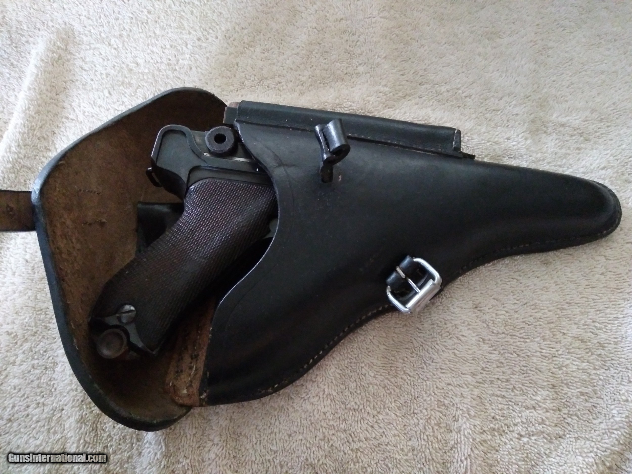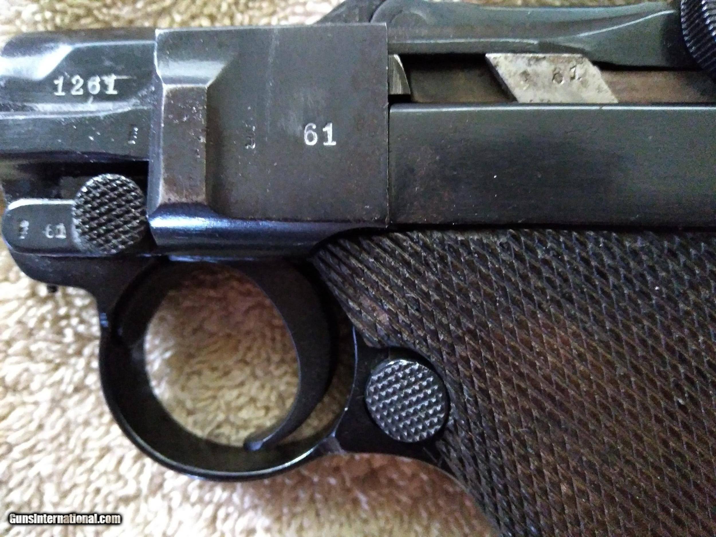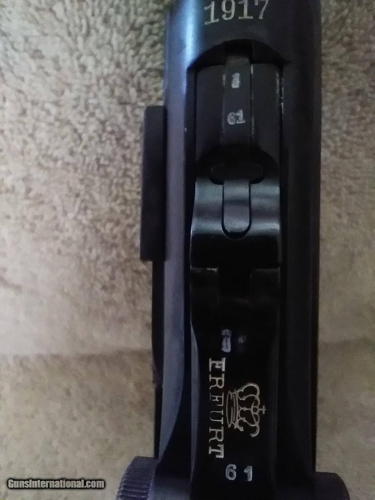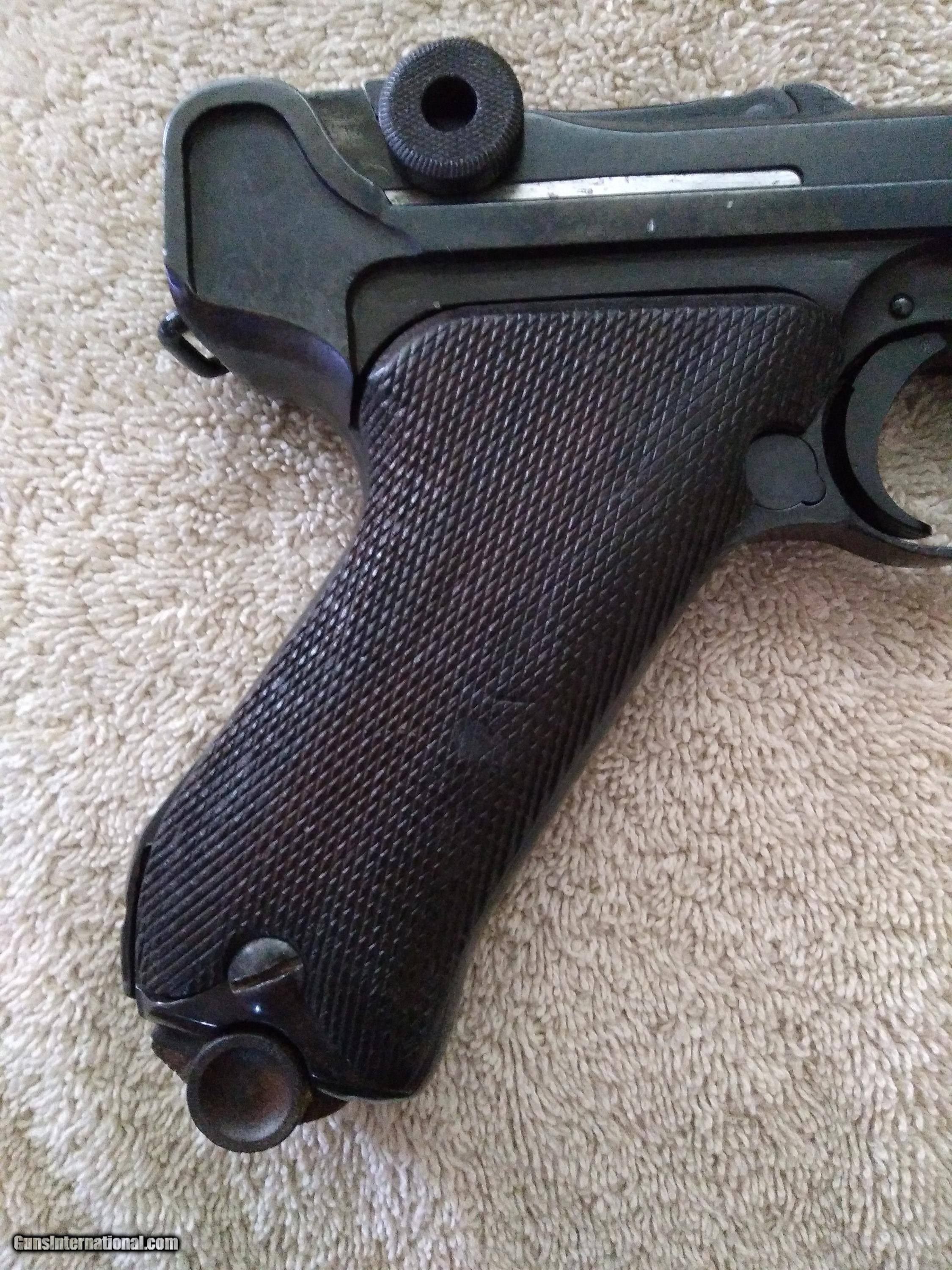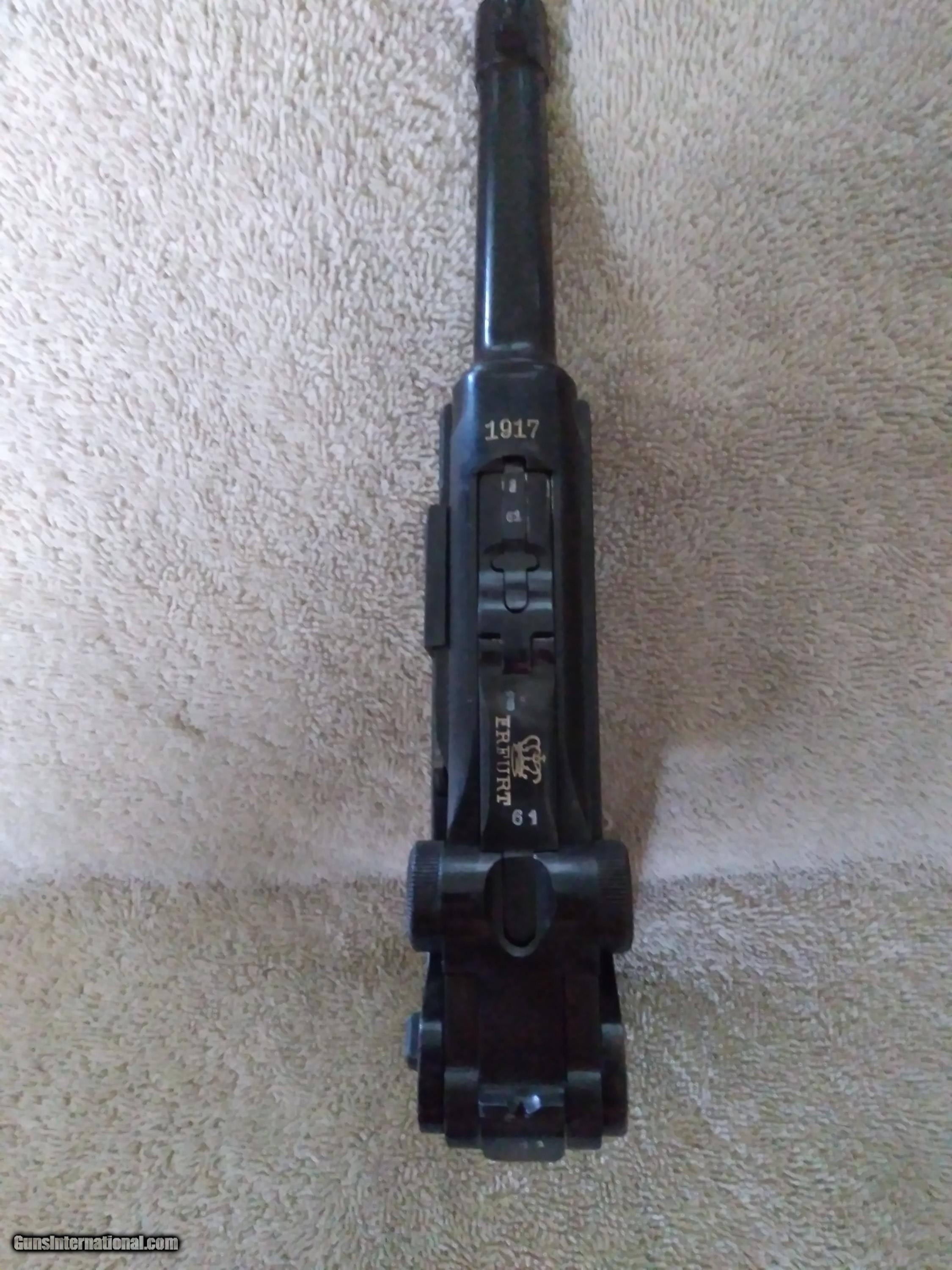 Description: WWI 1917 ERFURT P08 LUGER 9mm S/N 1261 VERY EARLY 1917 MATCHING SERIAL NUMBERS ON BARREL, RECEIVER, LOCKING BOLT, TRIGGER SIDE PLATE, SAFETY BAR, TOGGEL LINK, FORWARD TOGGEL LINK, EXTRACTOR, FRAME AND INSIDE BOTH GRIPS. OVER ALL CONDITION IS EXCELENT BLUING IS 92% OVER ALL SOME THINNING ON SIDE PLATE AND TIP OF LEFT AND RIGHT SIDE RAILS LIGHT PITTING ON SIDE PLATE TOP OF TOGGEL LINK TOP RIGHT OF RECEIVER CHAMBER IS DATED 1917 TOGGEL HAS CROWN OVER ERFURT LOGO BORE IS EXCELLENT STRONG RIFLING BOTH GRIPS ARE DARK WITH CRISP CHECKERING BOTH GRIPS HAVE A MARRED SPOT ALONG INSIDE FRONT OF LOWER EDGE SARCO REPRODUCTION TOOL AND A HOLSTER MARKED F G LECNERGmbH BALTZEN 1941 EAGLE OVER WaA170 TWO SARCO REPRODUCTION MAGAZINES SHOULDER STOCK LUG DOUBLE MAGAZINE HOLDER INCLUDED C&R FFL OR FFL $20.00 SHIPPING SOLD Curio/Relic: Yes Handgun Caliber: 9x19mm Parabellum (9mm Luger, 9x19mm NATO) Manufacturer: ERFURT Model: MODEL 08 Serial Number: 1261 Barrel Length: 4 in Bore: STRONG RIFLING Condition: Excellent Metal Condition: Excellent Wood Condition: Excellent Bore Condition: Excellent |