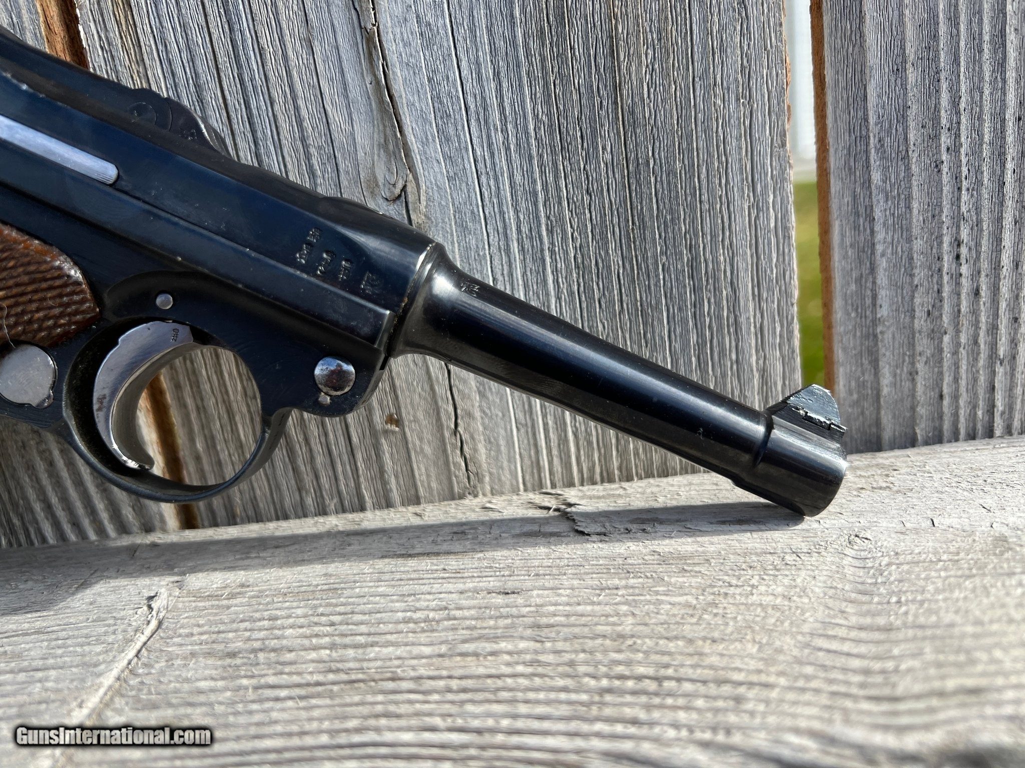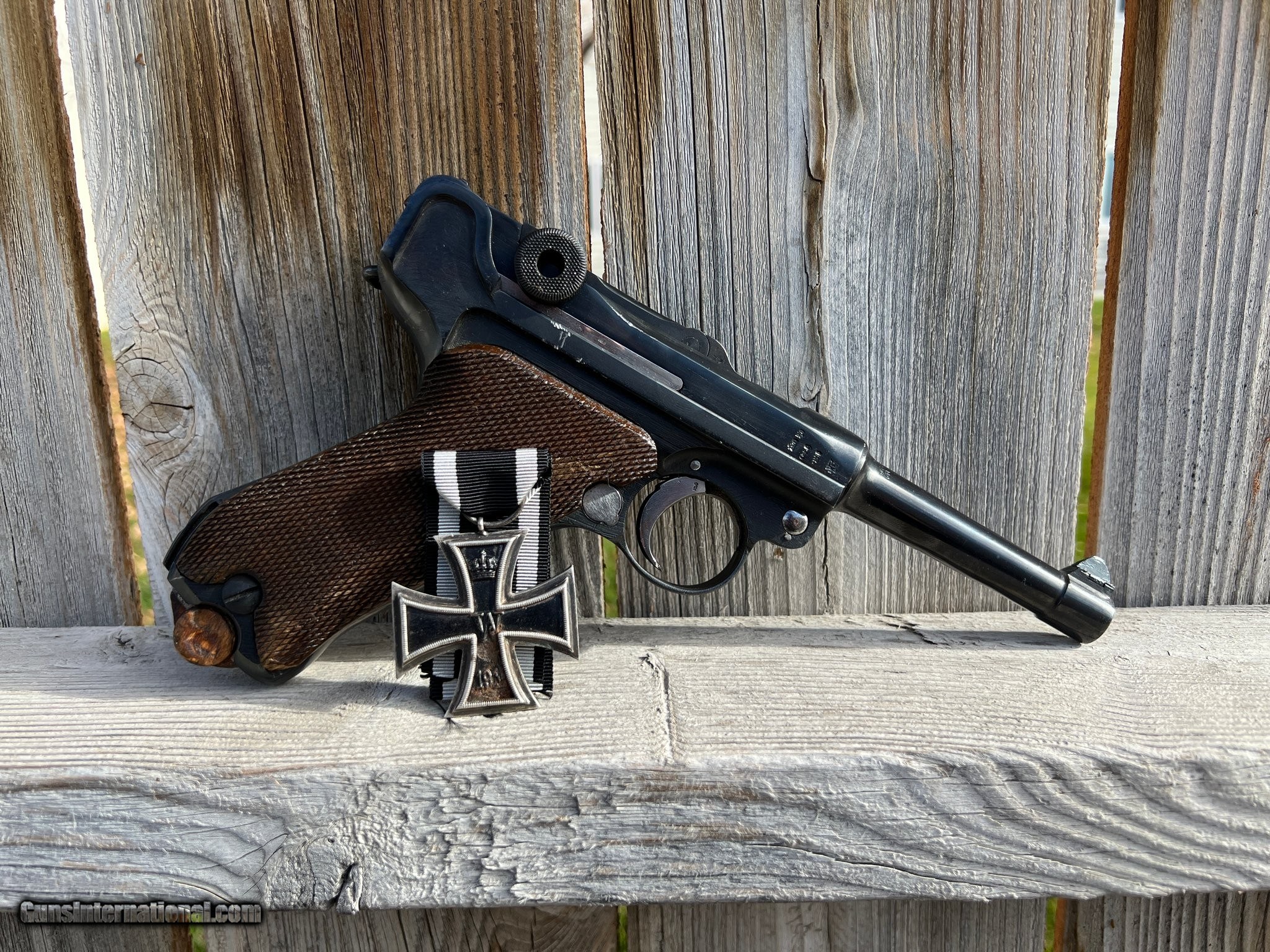 Description: Guns Listing ID: 592296 Caliber: 9mm Luger Manufacturer: Royal Arsenal at Erfurt Year of Manufacture: 1917 Model: P.08 Luger Action: Semi-Automatic Barrel Length: 4\" For sale is a 1917 Erfurt P.08 Luger, a desirable WWI-era German Army sidearm produced by the Royal Arsenal at Erfurt. The Erfurt Lugers are known for their extensive proofing and acceptance marks, and this example displays the characteristic crown/letter imperial stamps clearly. This pistol features serial numbers on the major components, including the frame, receiver, barrel, and toggle assembly. Small parts appear properly numbered and inspector-marked, consistent with Erfurt production. Chamber is stamped “1917," and the toggle bears the Erfurt crown. Finish appears reblued with minimal wear. The bore shows dark, but good rifling with minimal frosting—excellent considering its age and history. Includes 1 magazine. It is not the original magazine but is period correct. It also includes an original WWI iron cross. Manufacturer: ERFURT Model: P08 Caliber Info: 9MM LUGER (9x19 PARA) Condition: Used - Non-Certified Barrels: 4" BARREL Action: SEMI AUTOMATIC Finish: black and wood Price: $1,800.99 Contact Seller |