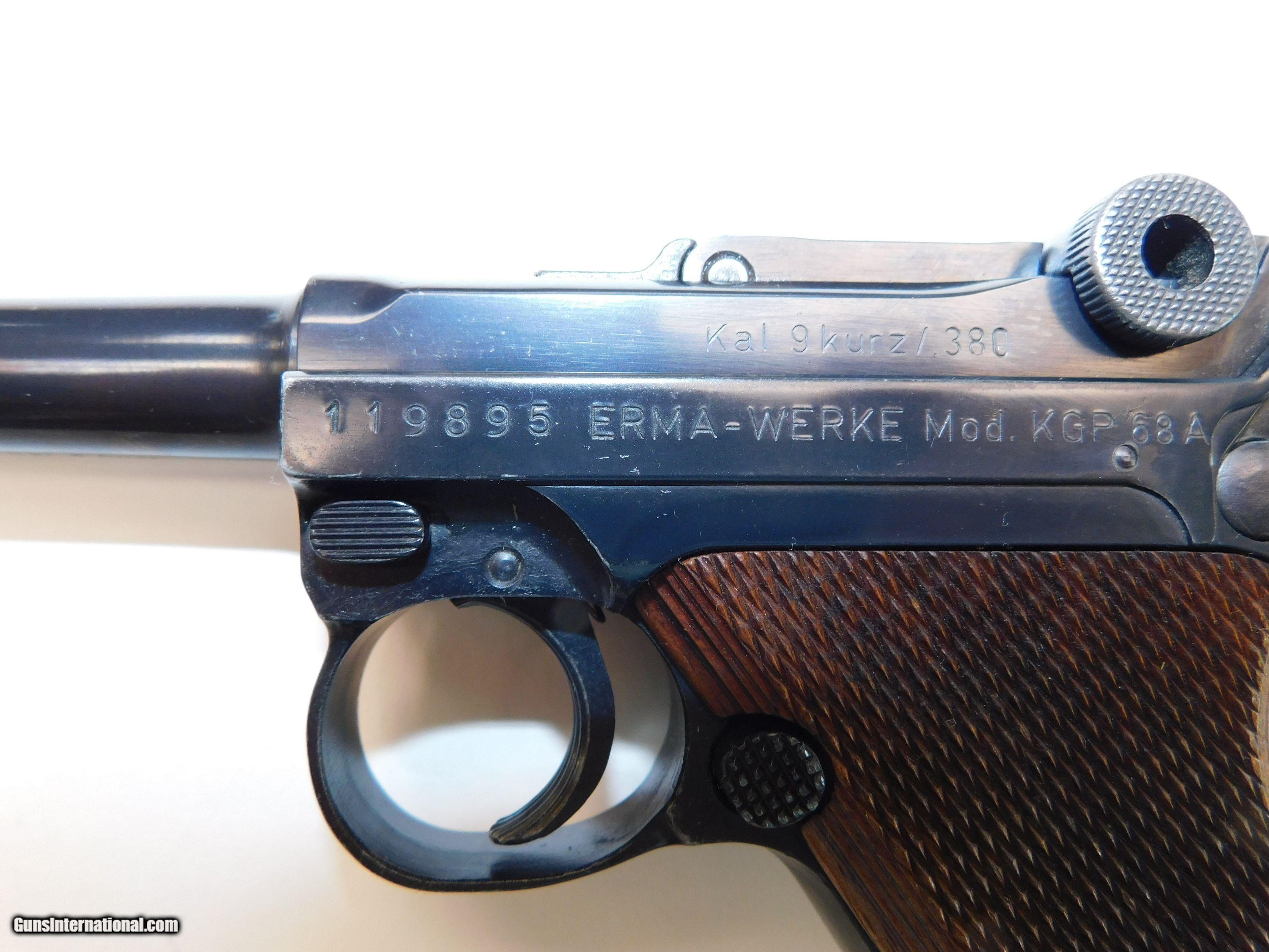 Description: ERMA KGP68A/BEEMAN MP-08 .380 ACP cal., Luger type toggle action, 3 1/2 in. barrel, 6 shot mag., blue, 1.4 lbs. Mfg. 1968-disc. This model was imported by Excam Inc. Hialeah Fl. importation of this model in .380 ACP cal. only with new Luger style checkered walnut grips and 3 1/2 in. barrel. Previous models had plastic grips. SOLD Curio/Relic: Yes Manufacturer: Erma-Werke Model: KGP 68A Serial Number: 119895 Caliber Info: .380 Condition: 98% Bore Condition: mirror |