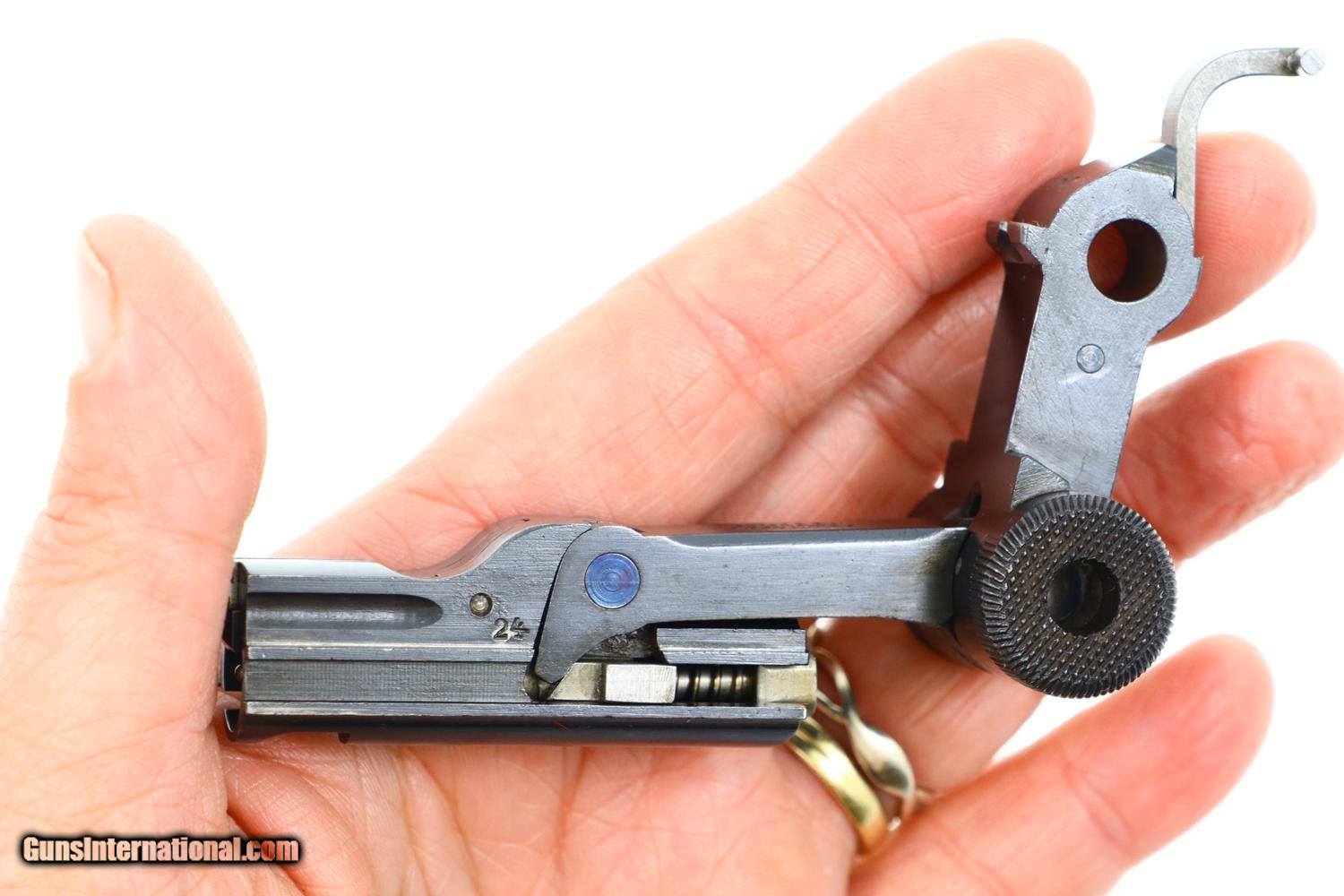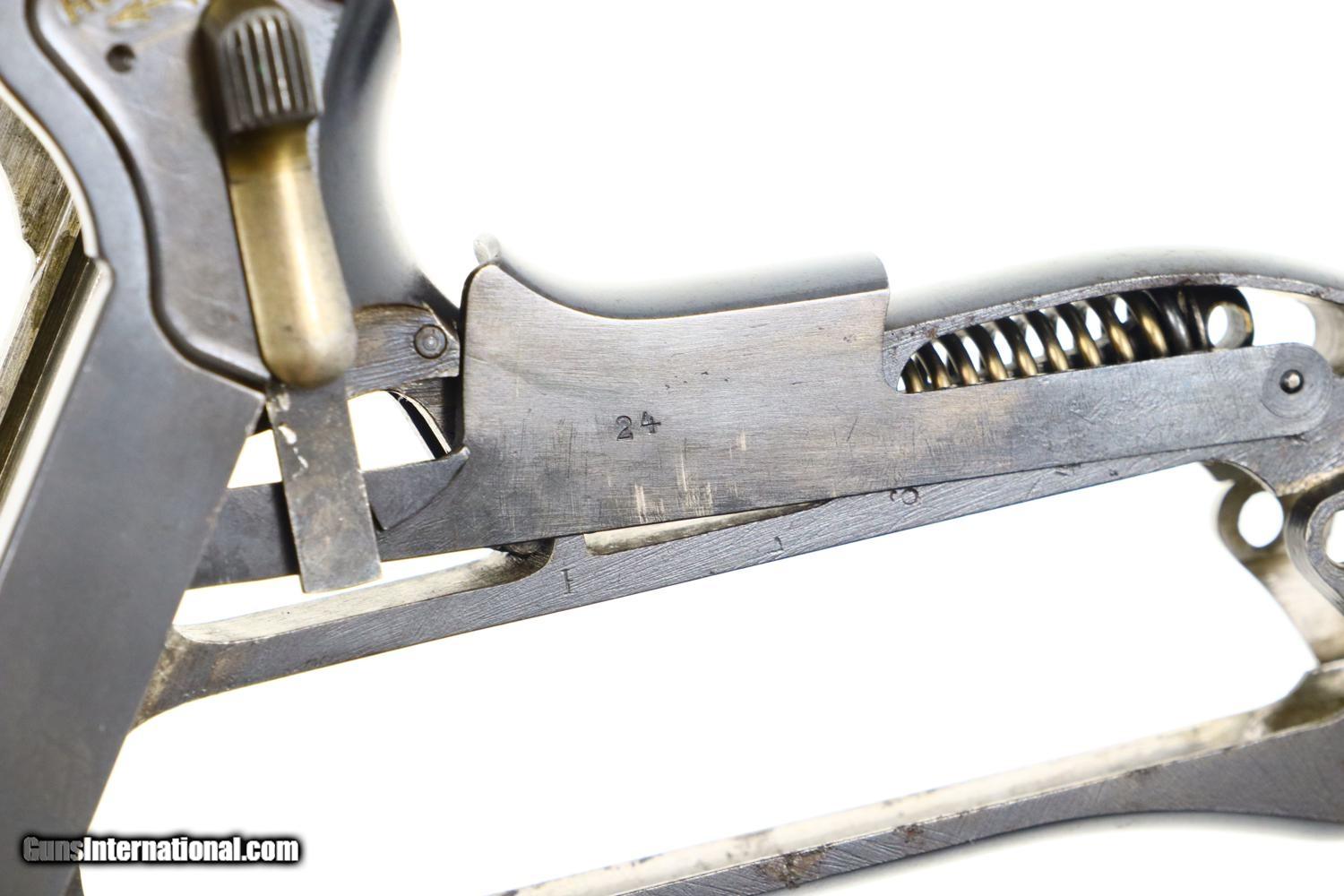 Description: Synopsis: Exceptional DWM 1906 Dutch Contract Military Luger, one of 4000 assembled. Description: This beautiful example of a DWM Model 1906 Dutch Military Luger, cal 9mmP, has a 4” barrel with drift adjustable front sight and V notch rear sight. No chamber marking. Intertwined DWM on front toggle link. Grip safety and no stock lug. Serrated safety with safety position denoted 'RUST,' Crown/W on right side of barrel extension, and dated '1916' on top of barrel. Full serial number in front of frame and repeated under barrel, last two digits in usual commercial locations. Fully matching including the firing pin, rear toggle pin, and each of the grips. Correct magazine with unnumbered plug. Condition: Excellent, bright, original rust blue with faint sharp edge wear as one might expect from a lightly carried service pistol with slight dulling/freckling of the front/back straps. Comparable condition strawed parts with expected fading but no discernible enhancement. Oil darkened grips with crisp checkering. No splits or losses. VG magazine, whose unmarked plug a possible replacement. Mirror bright bore with sharp rifling. Perfect manual mechanics. An extremely high condition 1906 Dutch Contract Luger, that would be difficult to improve upon! ~~Insured shipping fee of $155; most packages shipped using FedEx 2nd Day.~~ SOLD Curio/Relic: Yes Manufacturer: DWM Serial Number: 1924 Caliber Info: 9mmP |