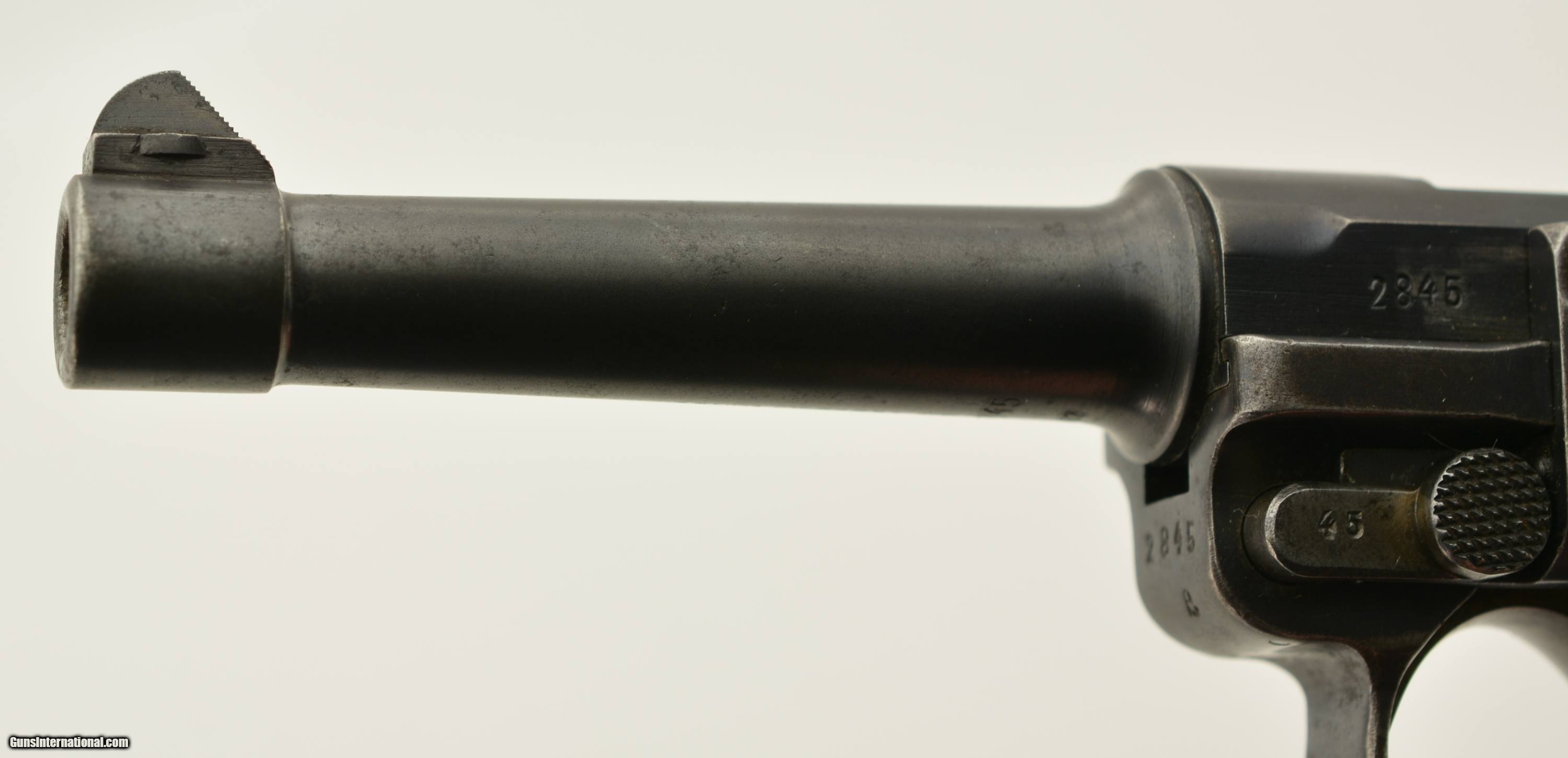 Description: Serial #2845e, 9mm Para., 4 inch barrel with a very good, bright bore that has some mild freckling within the grooves. This is an early “S/42" coded pistol with “G" chamber date code (1935) and all-matching numbers that retains 80-85% of the original blue finish with gray fading and light surface freckling along the projecting edges and mild silvering at the muzzle and bearing surfaces of the toggle and bolt. Additionally, there is a very small and unobtrusive import mark along the underside of the barrel and remnants of the original white filling are still present on the “GESICHERT" marking. Some further fading and freckling are present on the grip straps and exterior of the trigger guard bow and traces of the original straw color are still present on the take-down lever, trigger, magazine release, and safety; a greater amount of the straw remains on the ejector. The checkered wooden grips are not numbered and have light wear throughout with flattening of the points on either side, mainly around the butt, and some purposefully flattened points on the right panel in the shape of a “V" surmounting a swastika (probably symbolizing “Victory over the Third Reich"). A single aluminum base magazine is included (numbered to a different gun) and the pistol rates very good plus-near fine condition overall. It’s a great example of an early pre-war, Mauser-produced Luger. FFL or C&R SOLD Curio/Relic: Yes Manufacturer: Mauser Model: Luger Serial Number: 2845e Caliber Info: 9mm Gauge Info: 9mm |